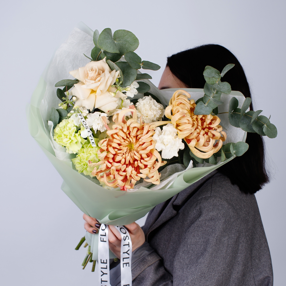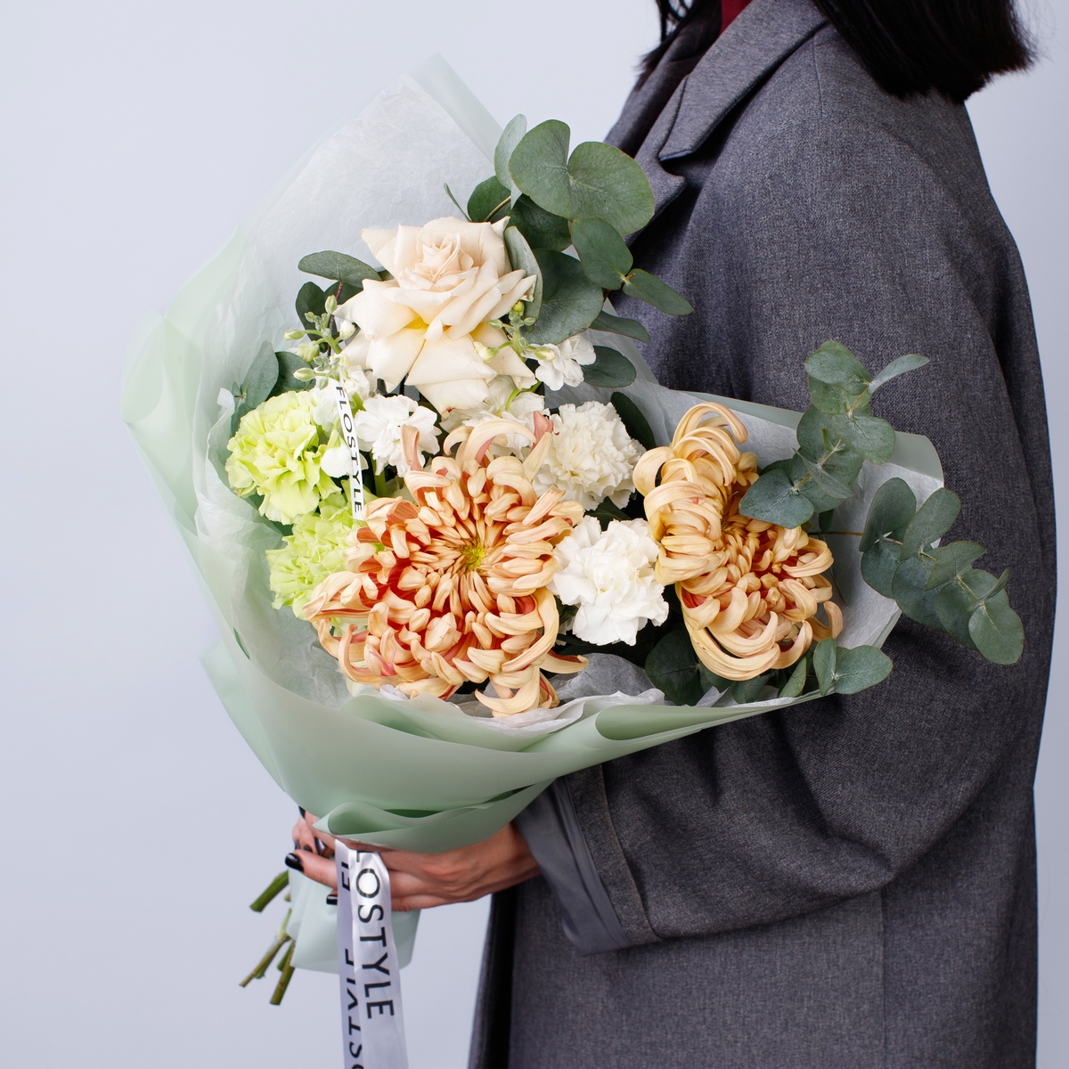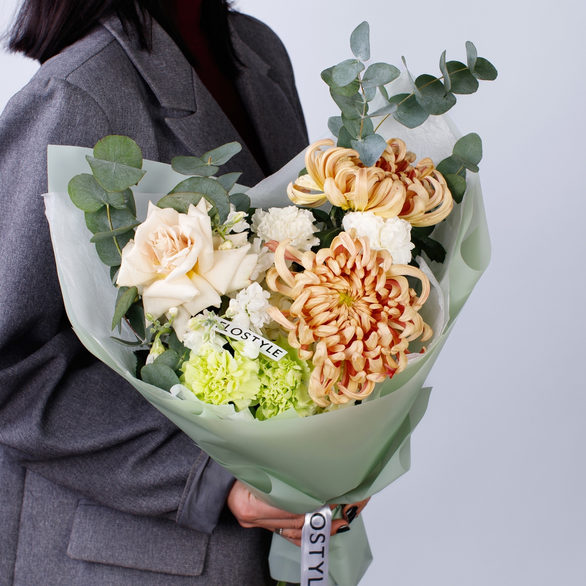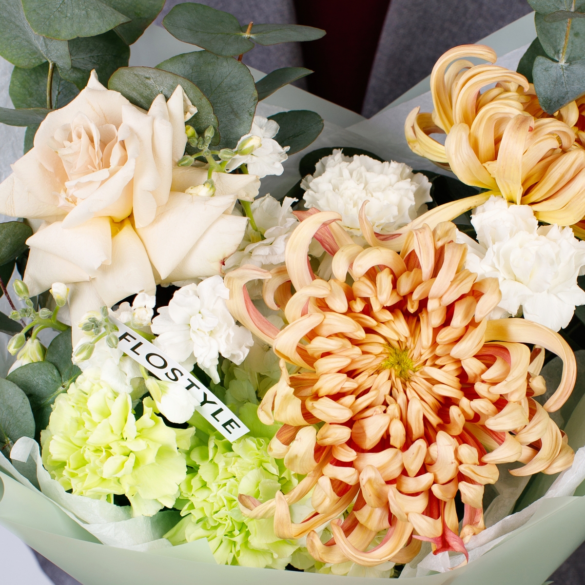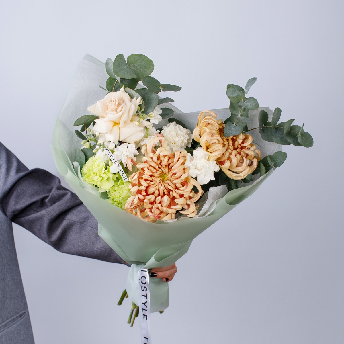 Состав: Хризантема Vienna - 2 шт, Роза Quicksand французская - 1 шт, Гортензия White - 1 шт, Диантус White/Green - 4 шт, Фисташка - 2 шт, Эвкалипт - 1 шт, Тишью белая, Матовая пленка зеленая ушками