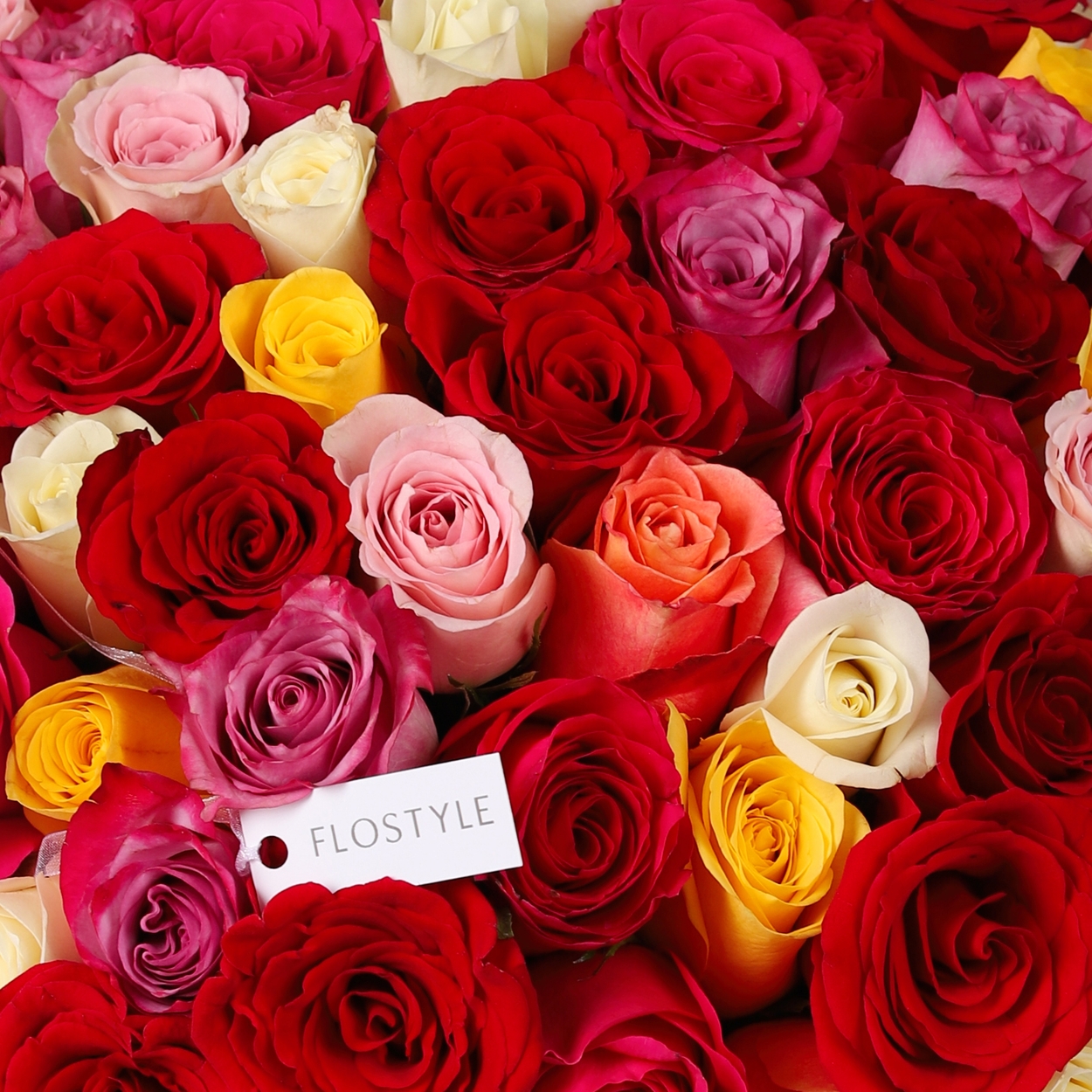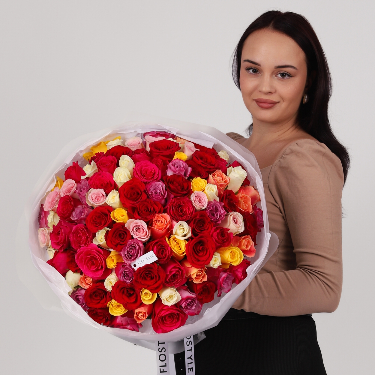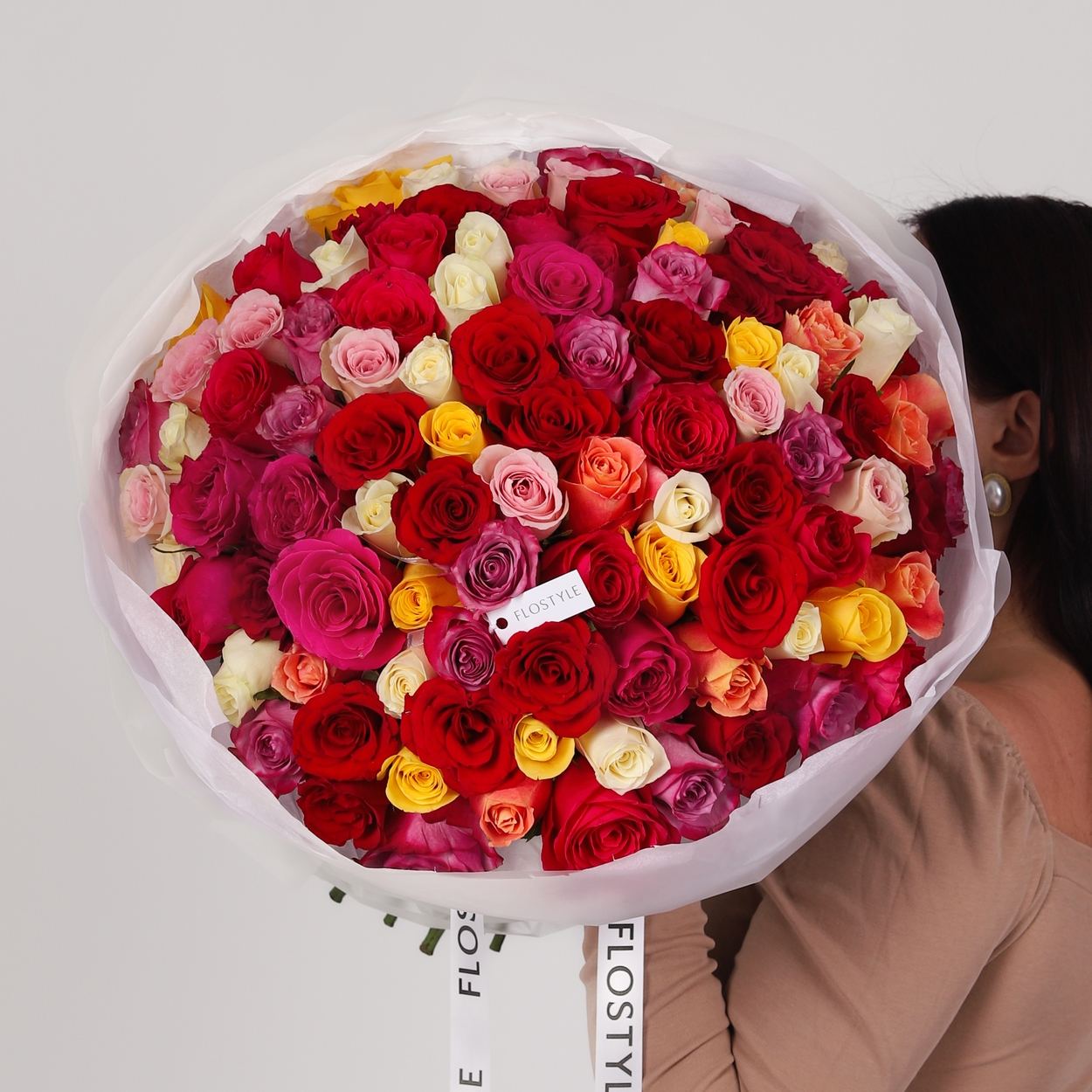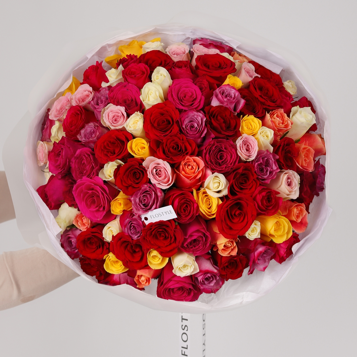Состав: Роза Keniya Mix (Pink, Purple, Yellow, Red) - 101 шт, Тишью белая, Матовая пленка белая кругом