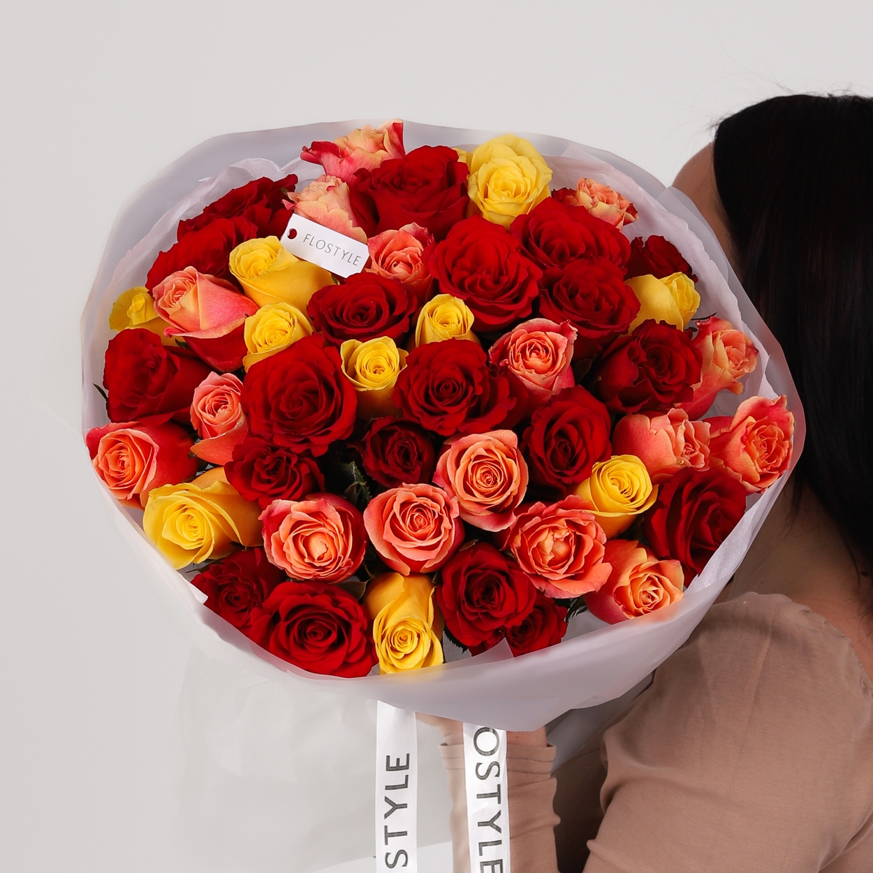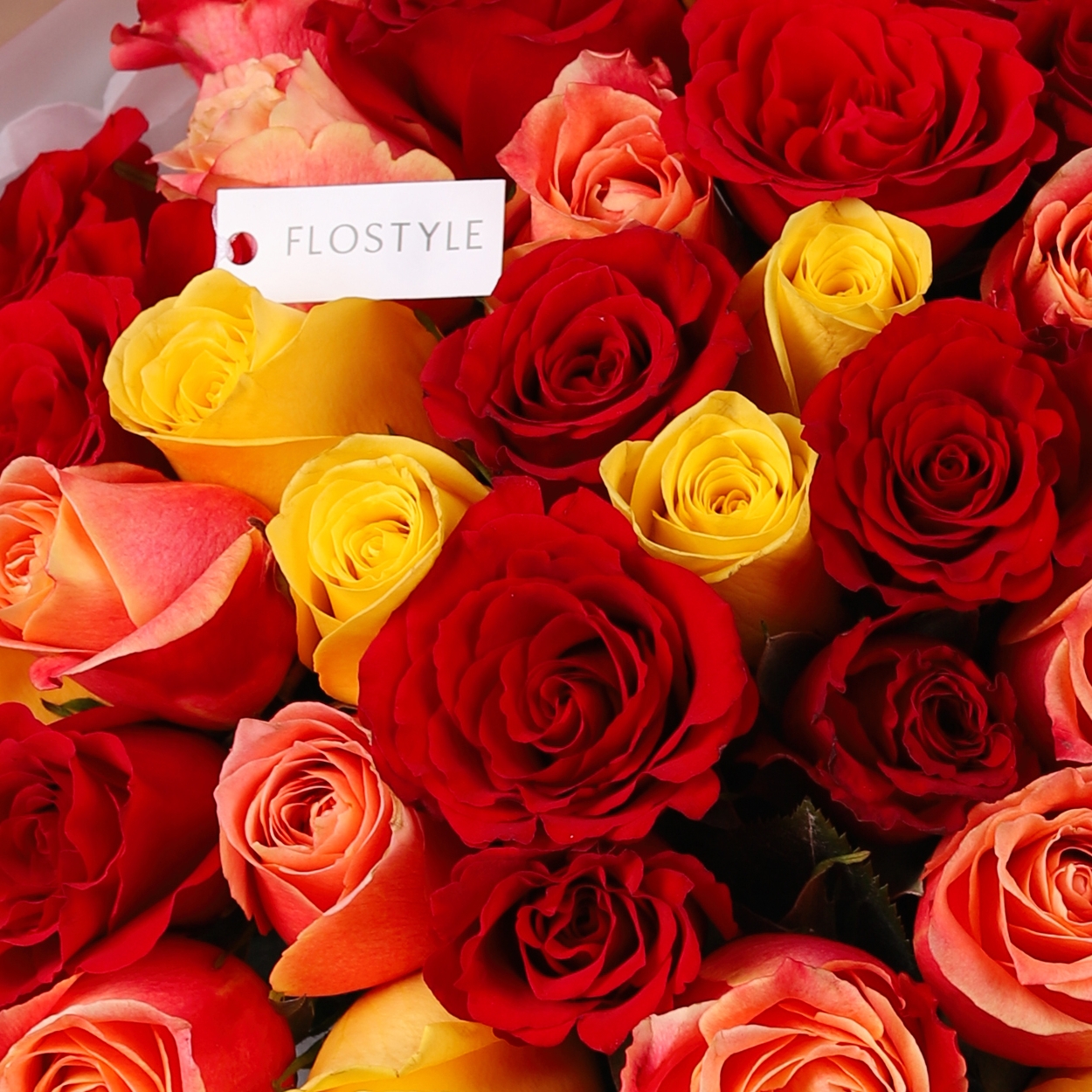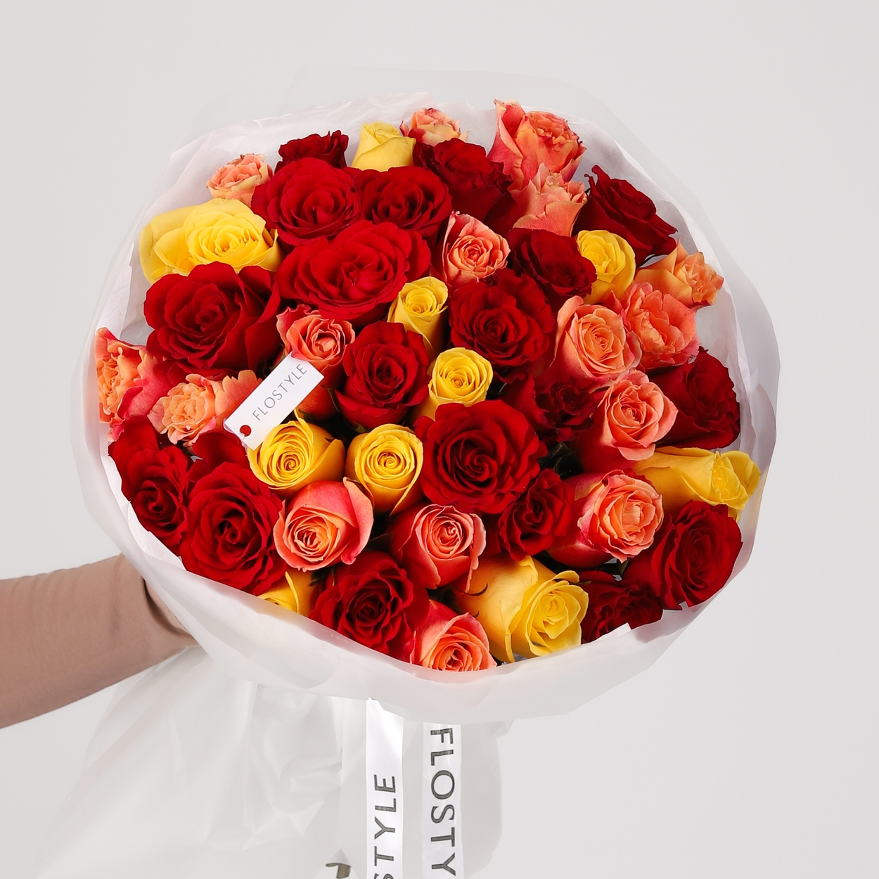 Состав: Роза Keniya Mix (Red, Orange, Yellow) - 51 шт, Тишью белая, Матовая пленка белая кругом