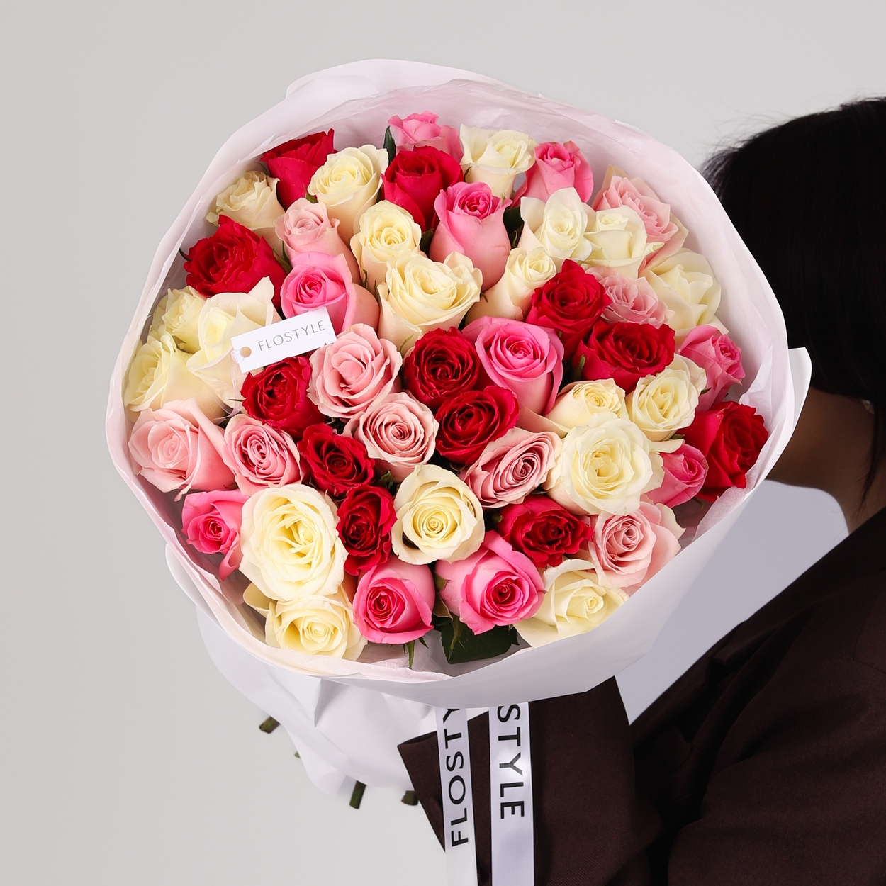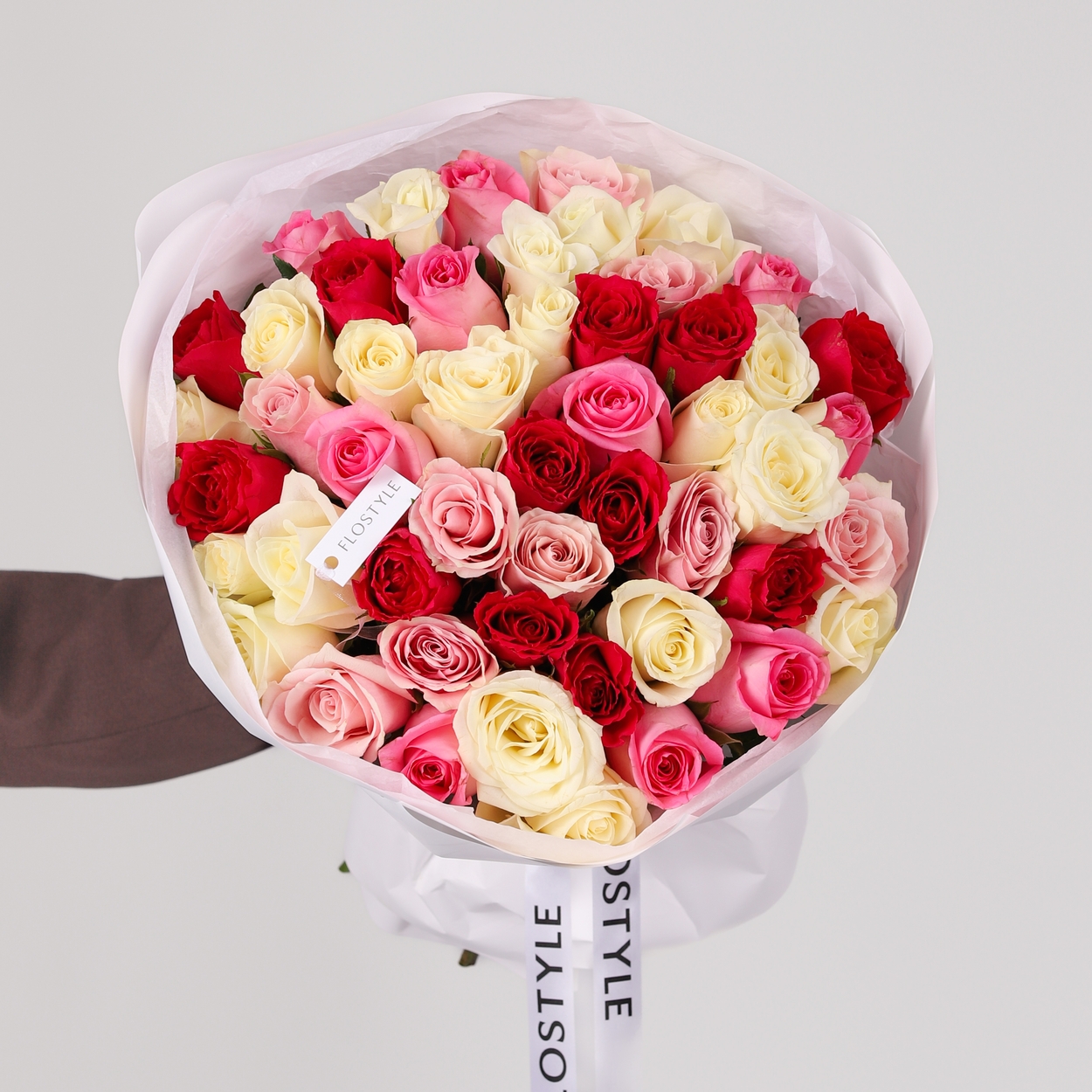 Состав: Роза Keniya Mix (Pink, Red, White) - 51 шт, Тишью белая, Матовая пленка белая кругом