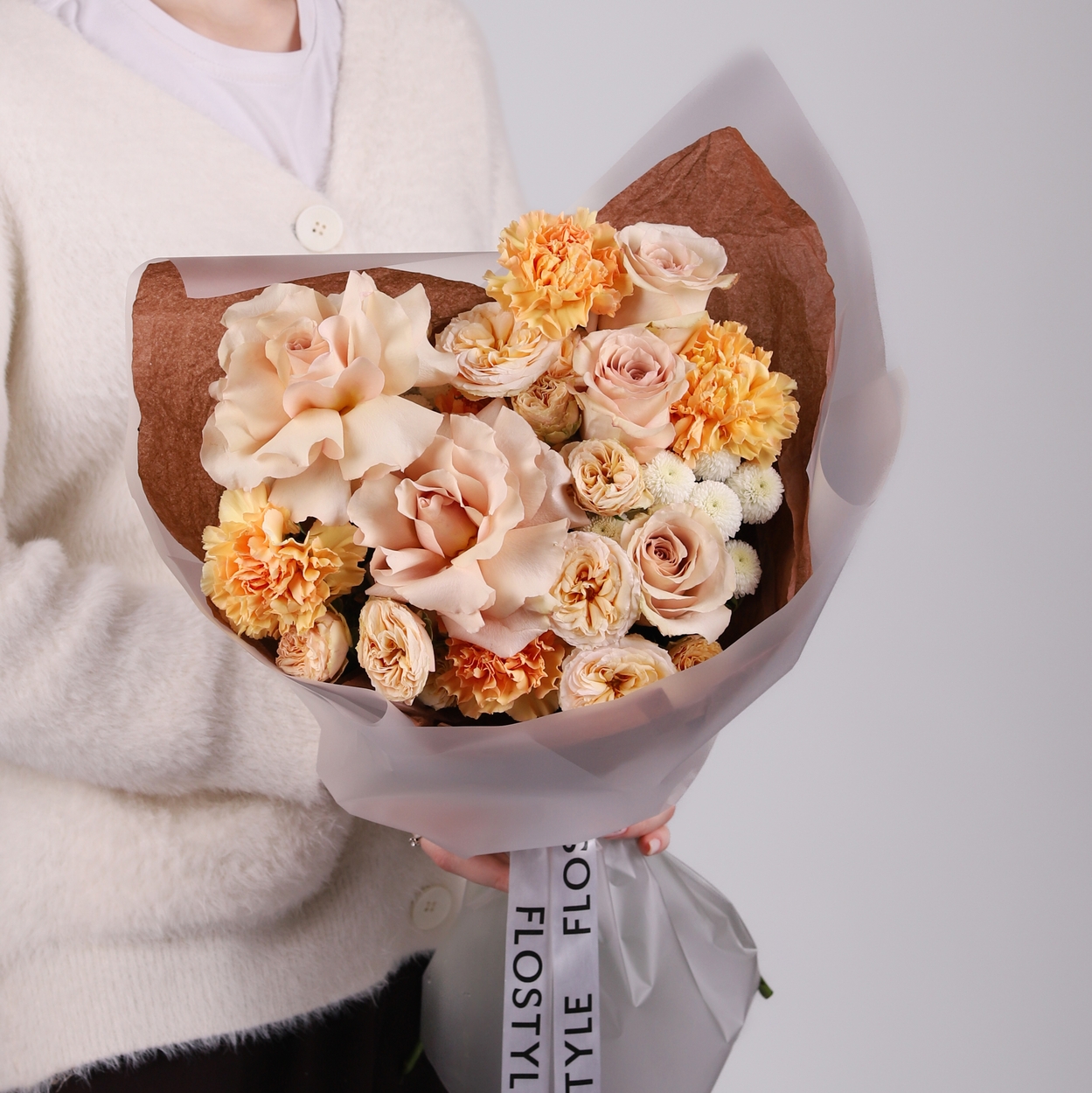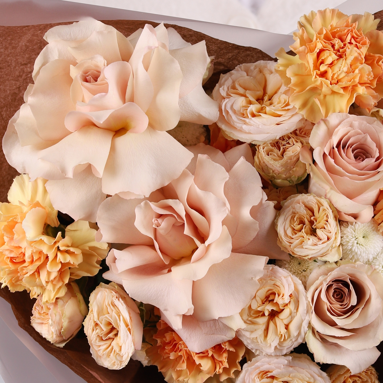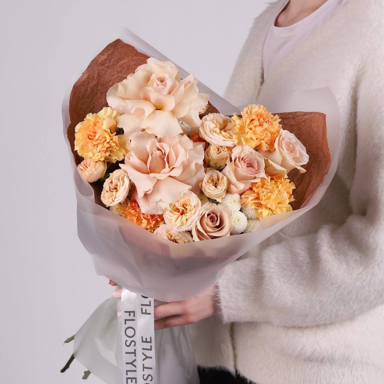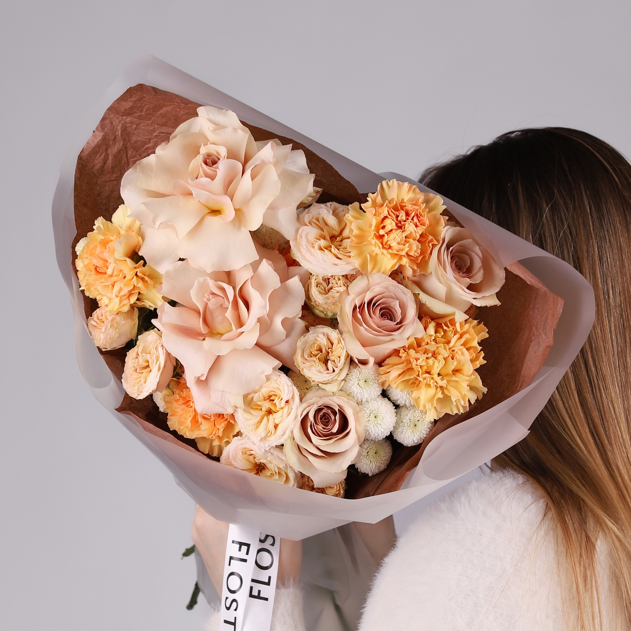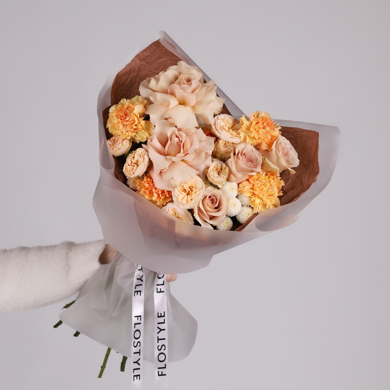 Состав: Роза Quicksand французская - 2 шт, Роза Quicksand - 3 шт, Хризантема Newton - 2 шт, Роза кустовая Gentle Trendsetter - 4 шт, Диантус Orange - 5 шт, Фисташка - 2 шт, Тишью коричневая, Матовая пленка белая ушками