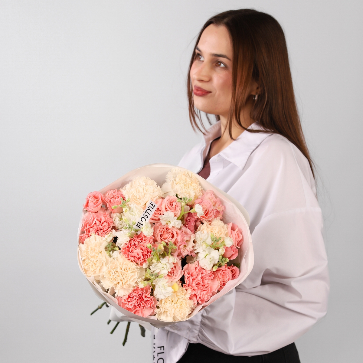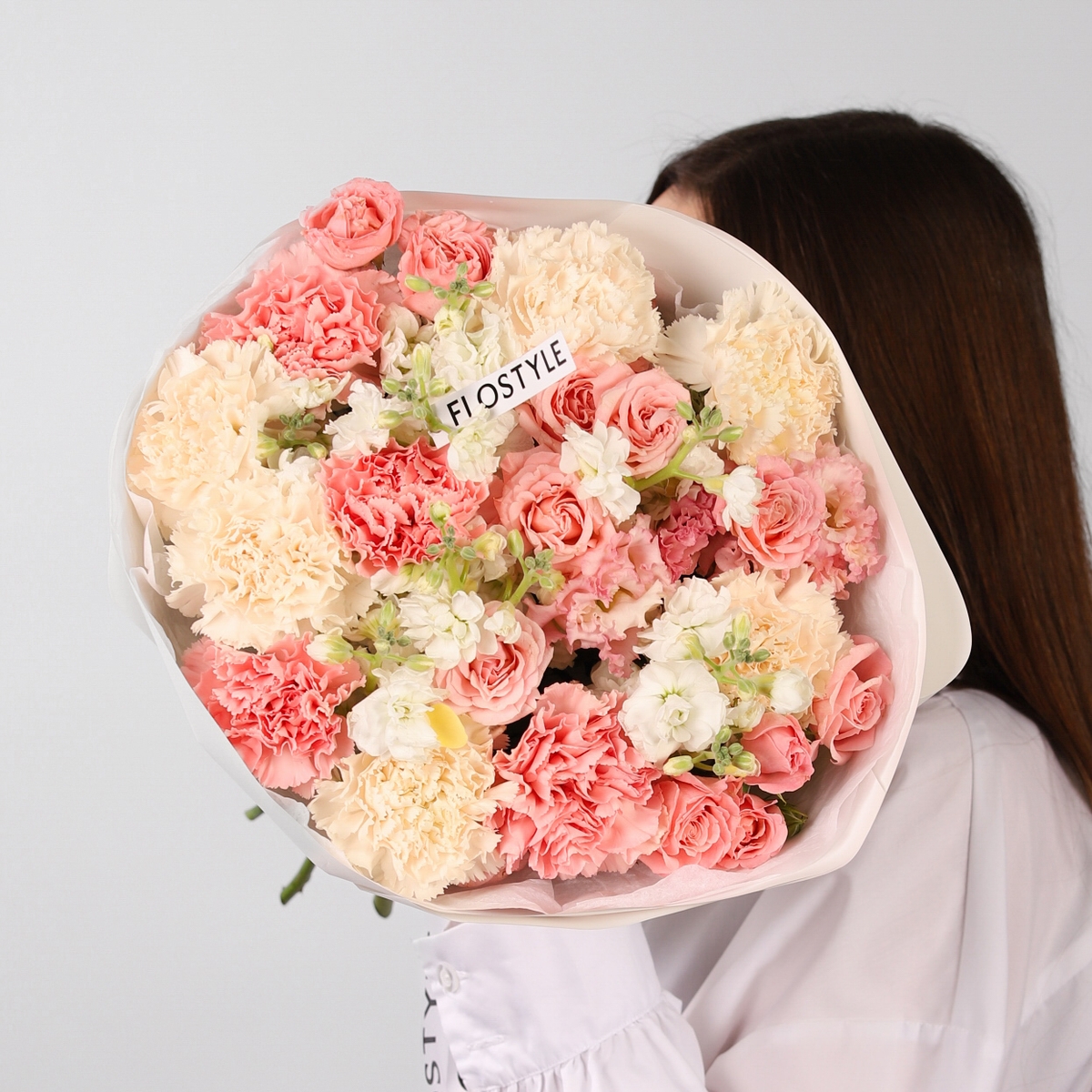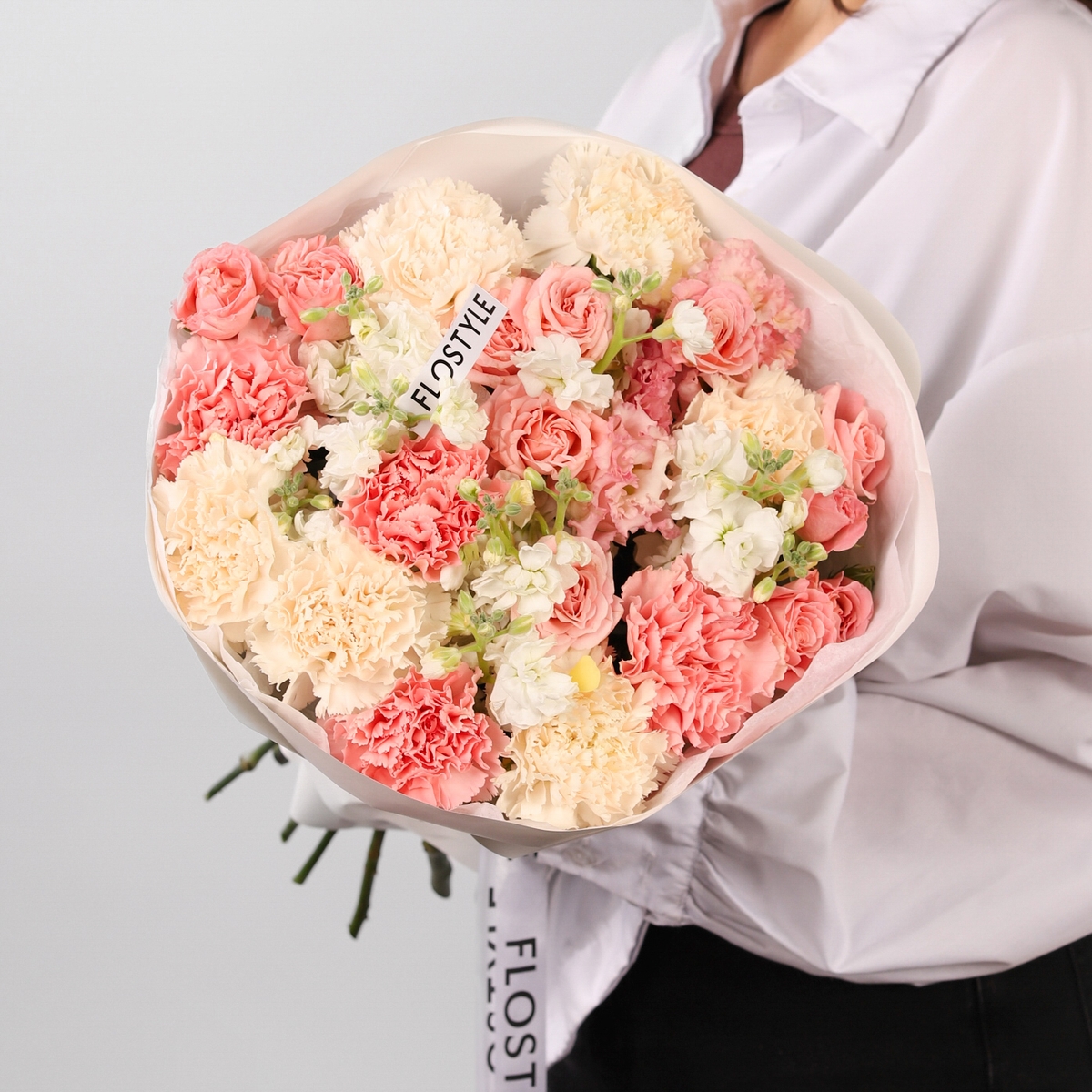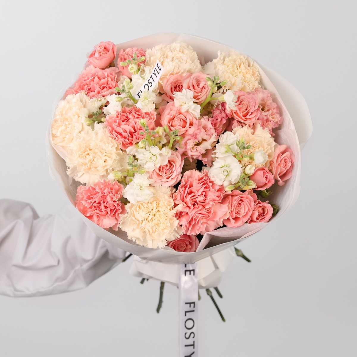 Состав: Диантус Pink - 5 шт, Диантус Brut - 6 шт, Эустома Pink - 2 шт, Роза кустовая Madam Bombastic - 5 шт, Маттиола White - 3 шт, Фисташка - 2 шт, Тишью белая, Матовая пленка белая кругом
