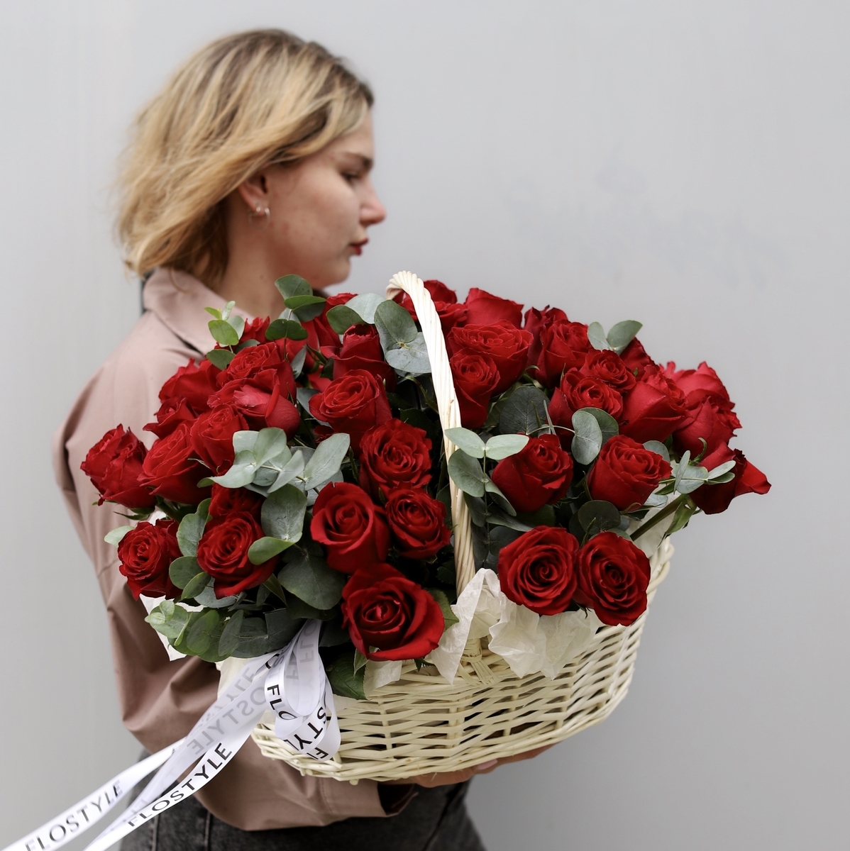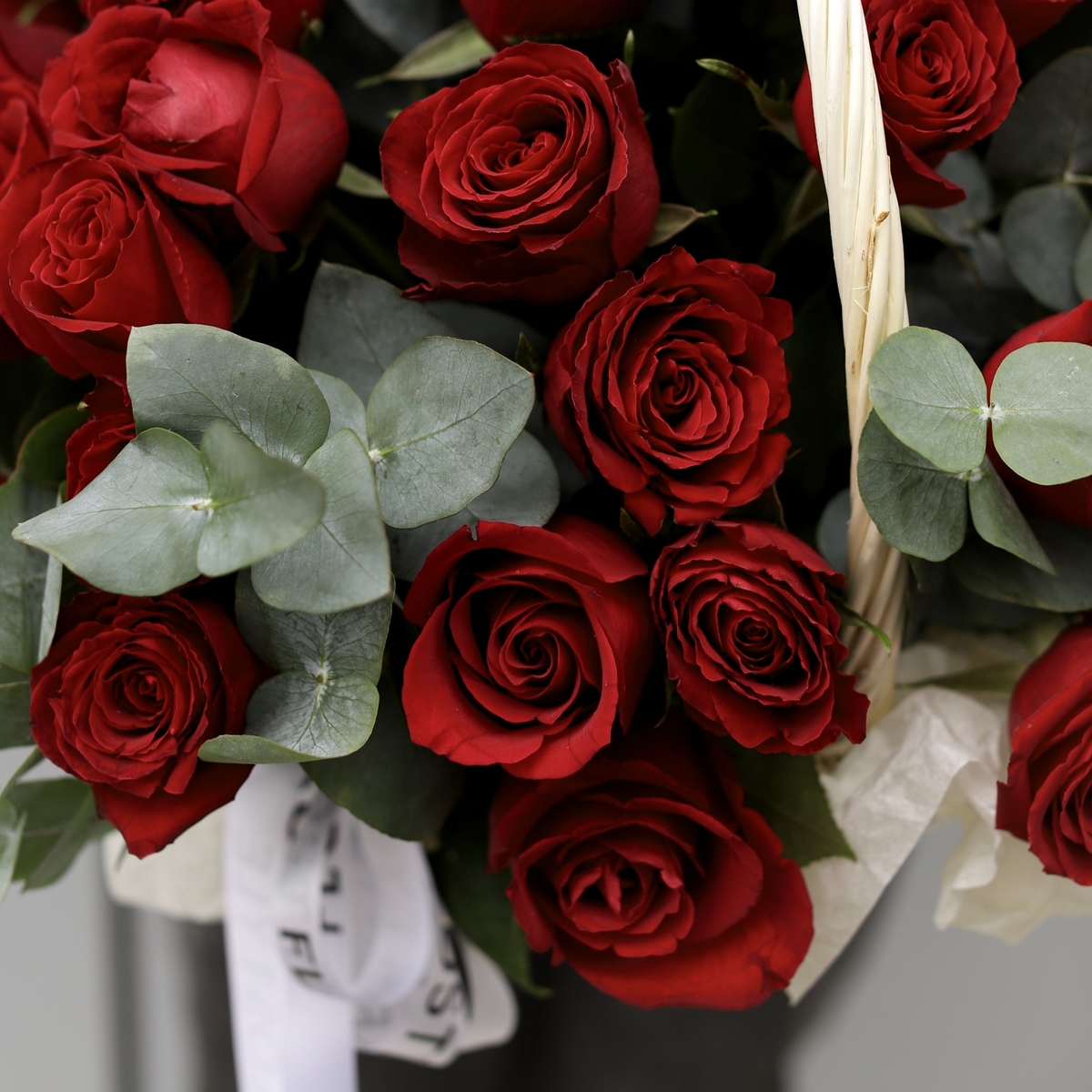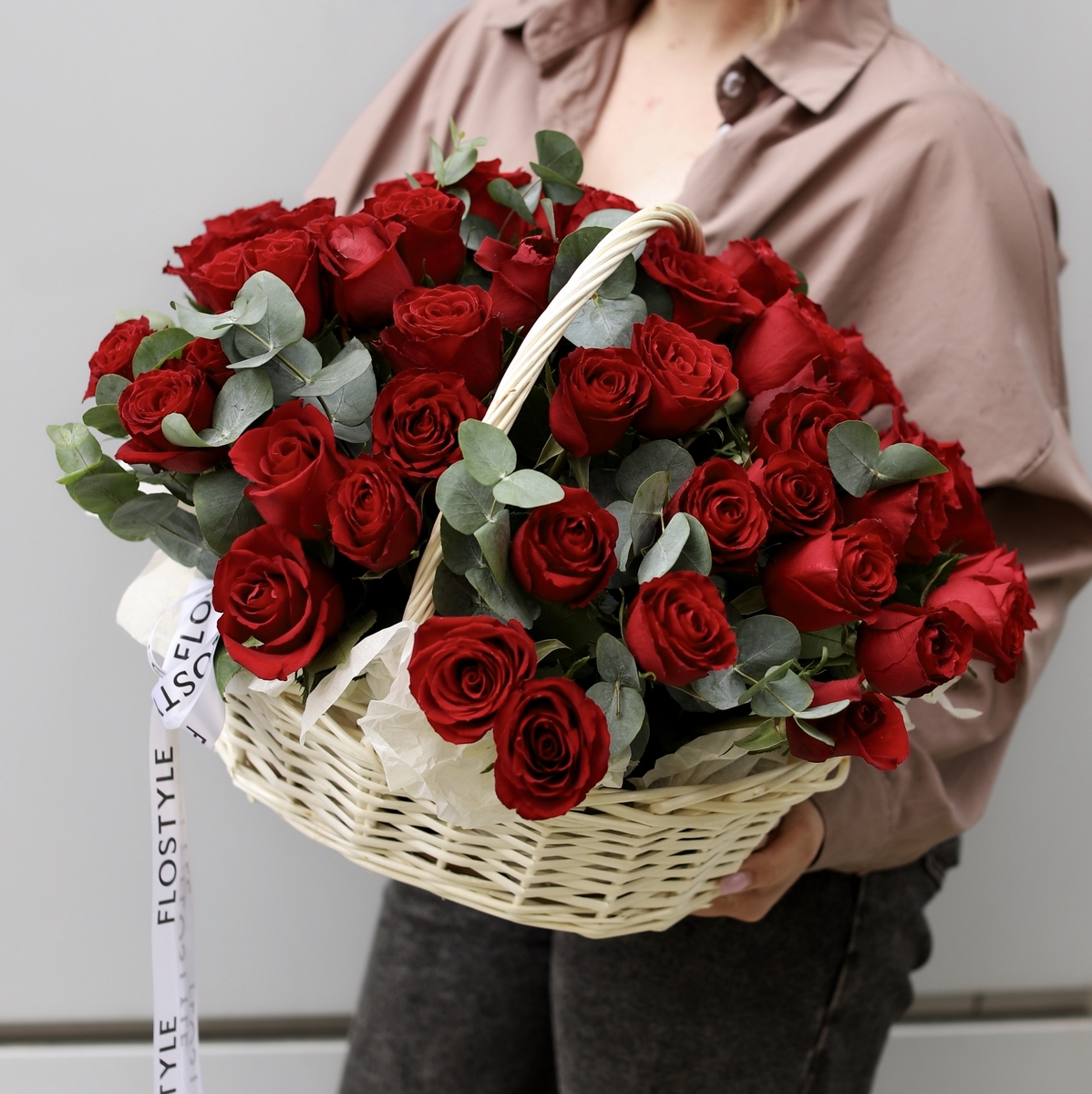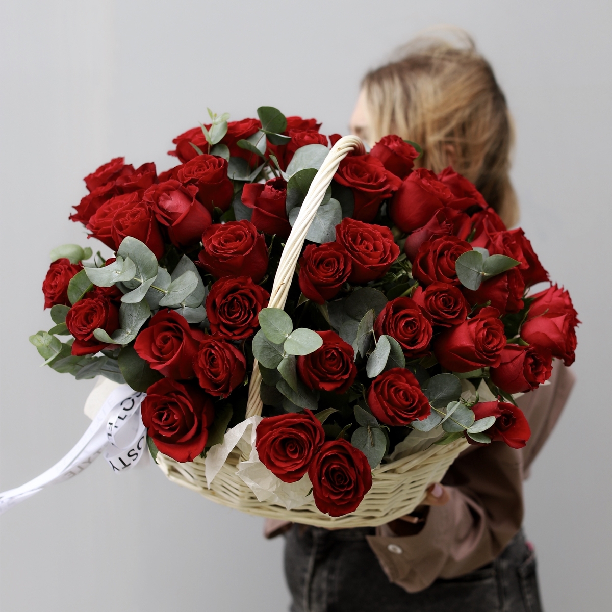 Состав: Корзина L, Роза Кения Red - 51 шт, Эвкалипт - 1 шт, Лента атласная