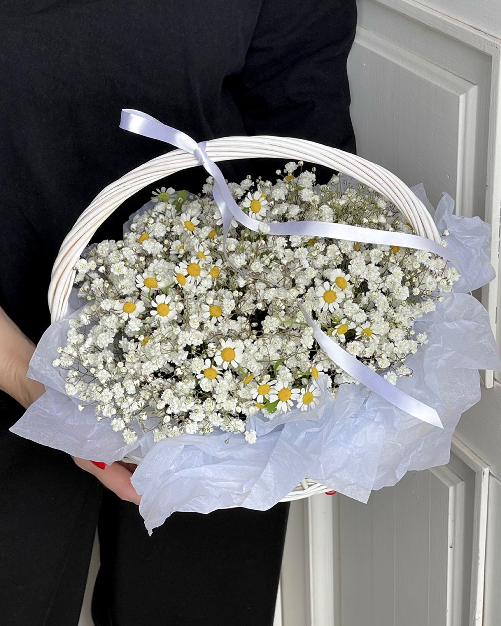 Корзина гипсофила с ромашками