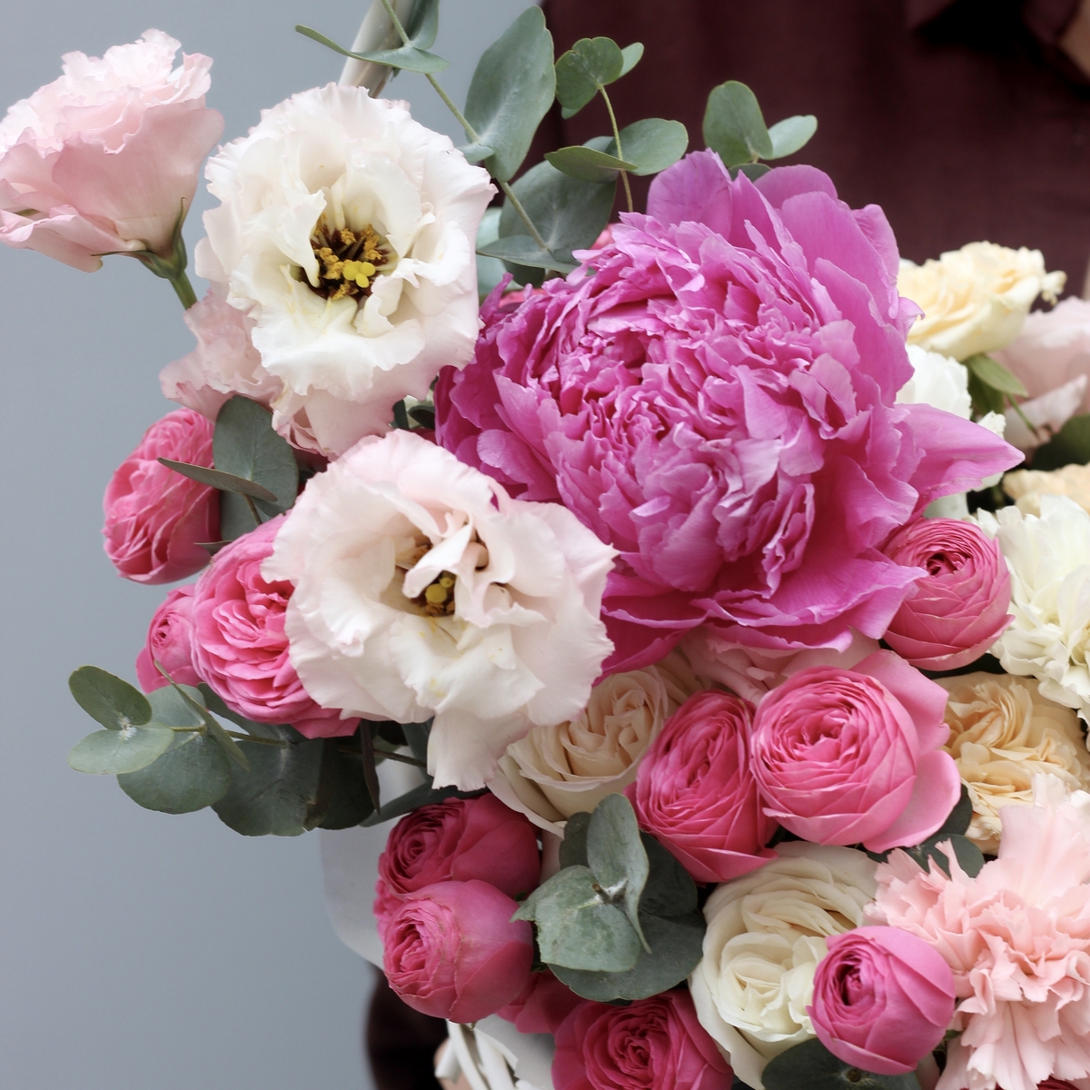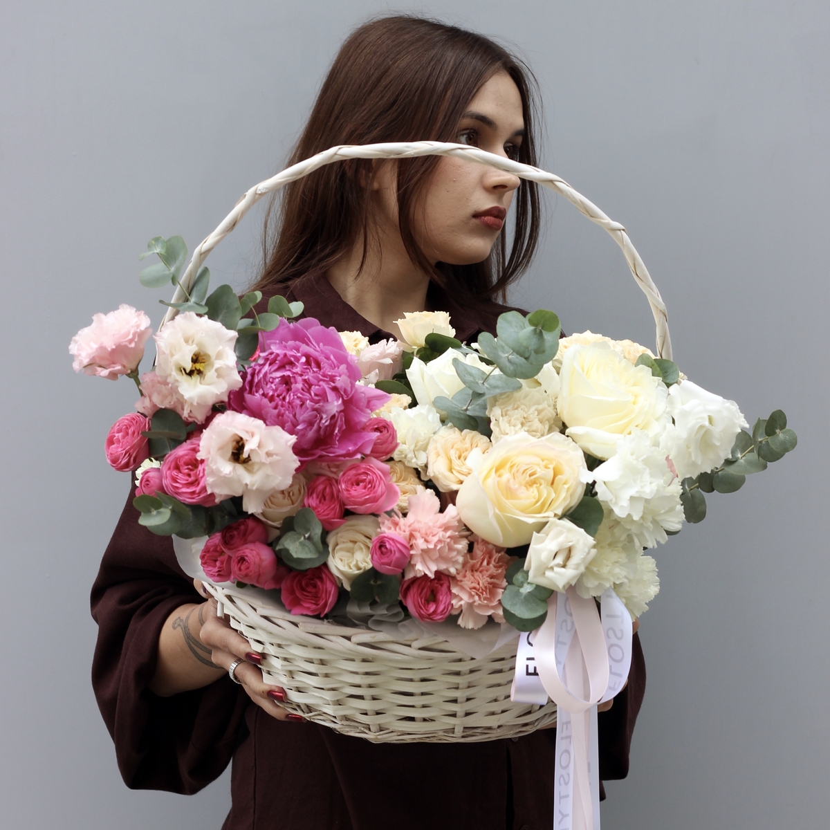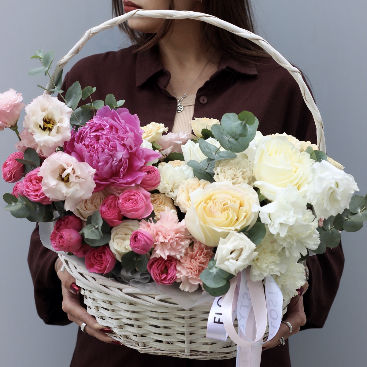 Состав: Корзина L, Пион Pink - 1 шт, Роза Candlelight - 2 шт, Роза Playa Blanca - 3 шт, Эустома White - 2 шт, Эустома Pink - 1 шт, Роза кустовая Gissele - 3 шт, Роза кустовая Summerrose - 2 шт, Диантус Pink - 5 шт, Диантус White - 7 шт, Эвкалипт - 1 шт, Лента атласная