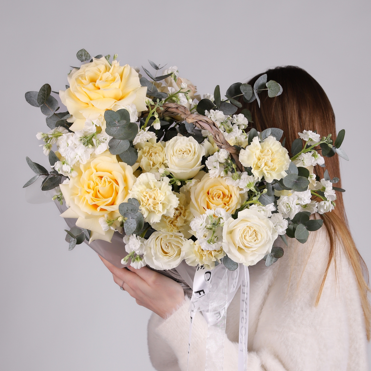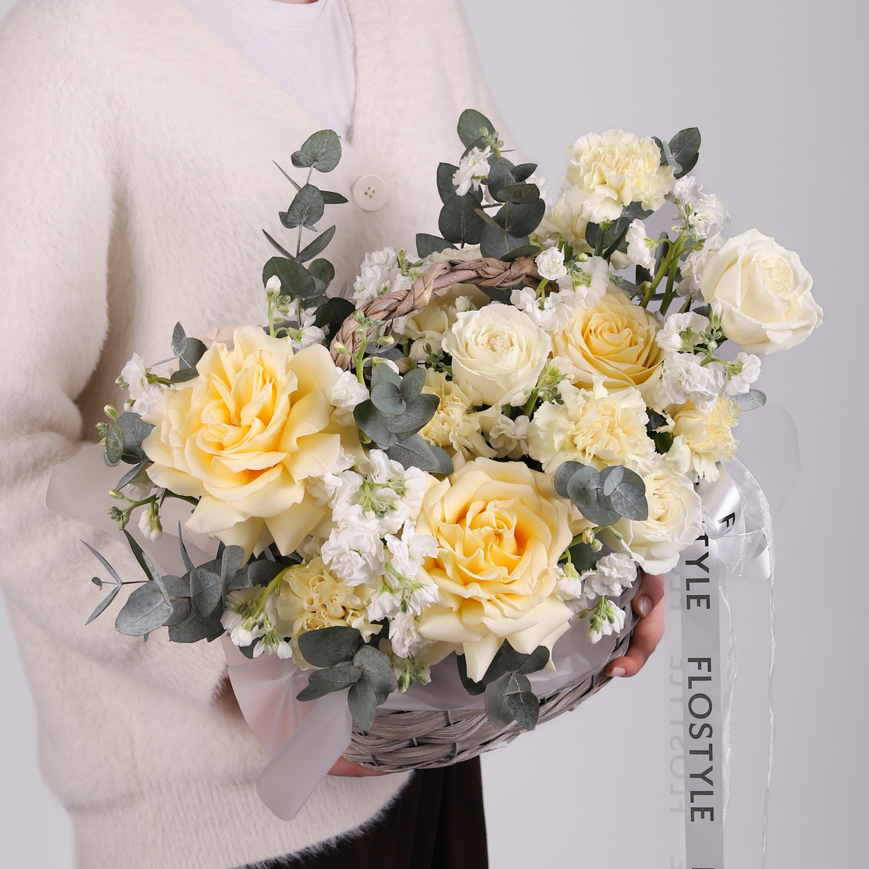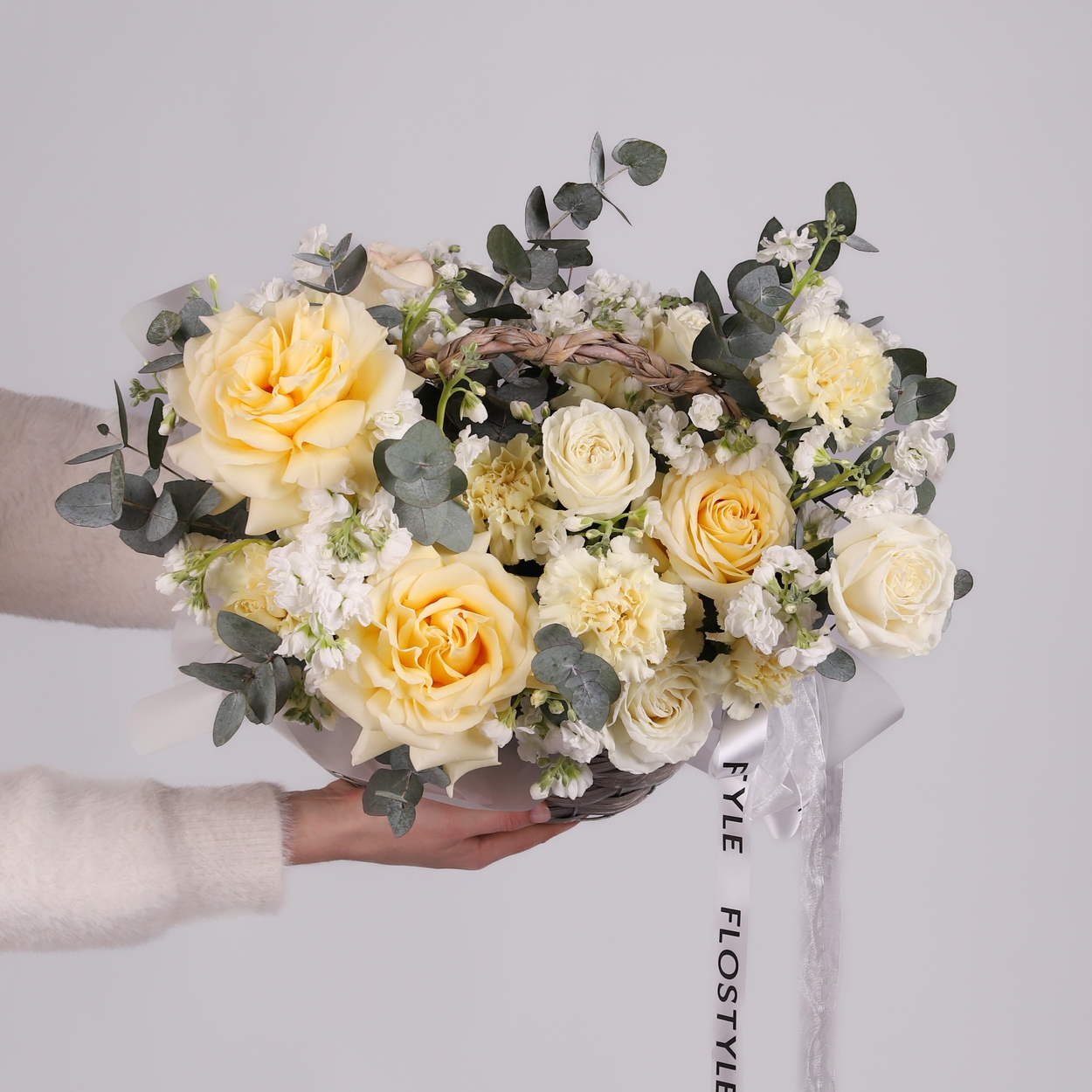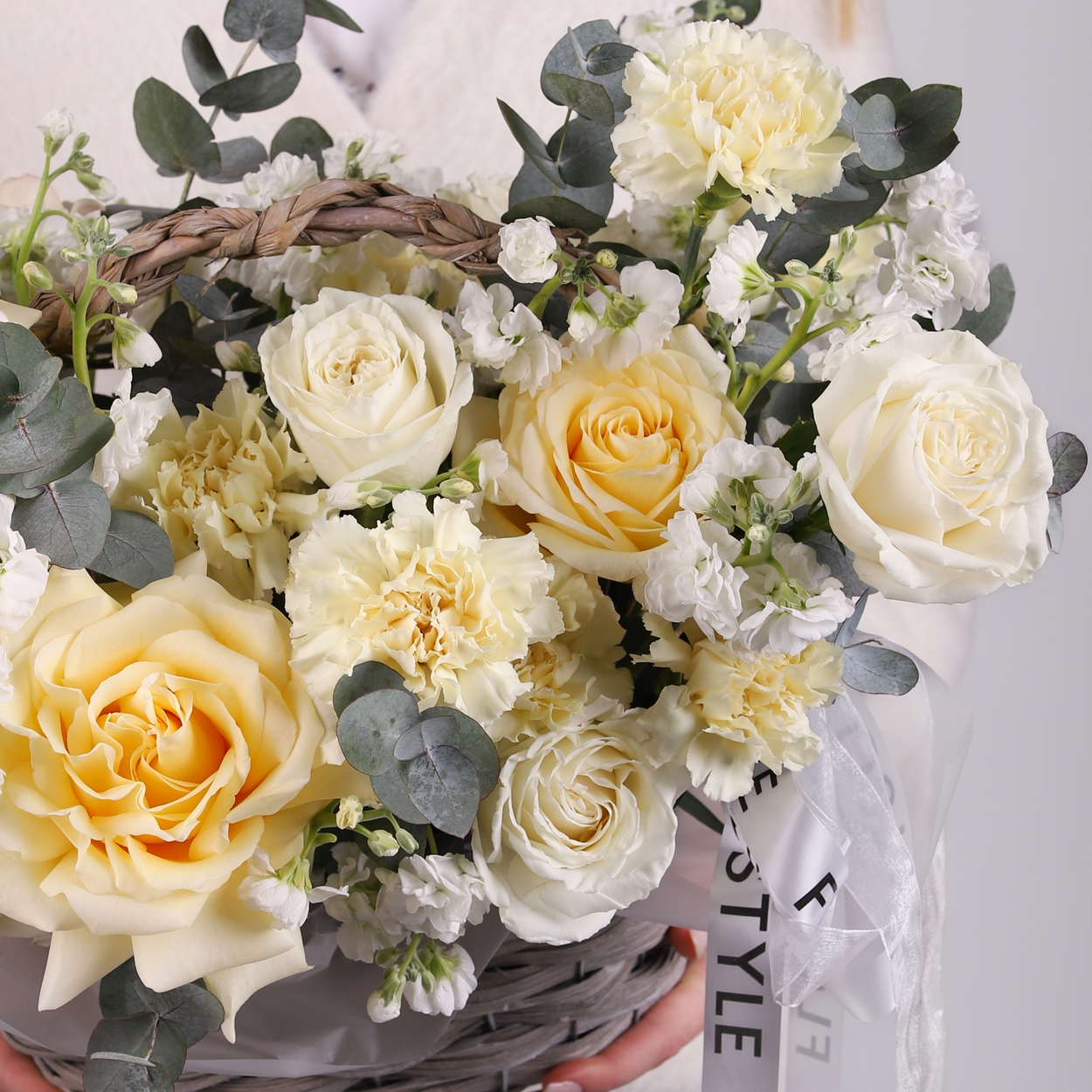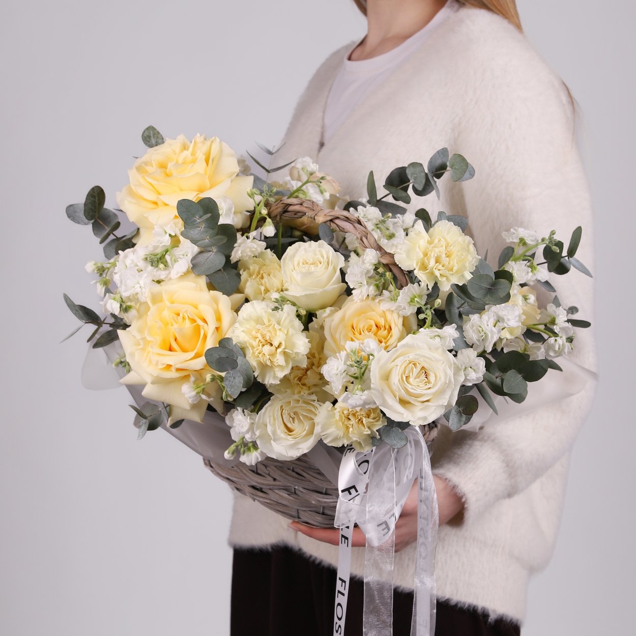 Состав: Корзина серая M, Роза Candlelight Французская - 2 шт, Роза Candlelight - 3 шт, Роза Playa Blanca - 4 шт, Диантус Yellow - 9 шт, Маттиола кустовая White - 6 шт, Эвкалипт - 1 шт, Лента Атласная