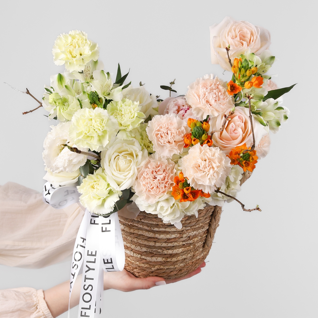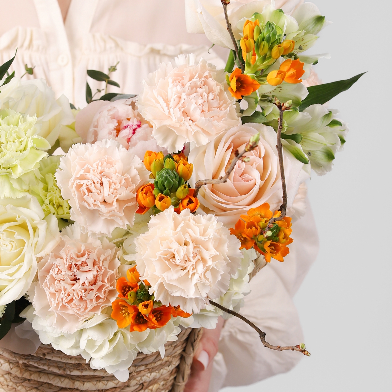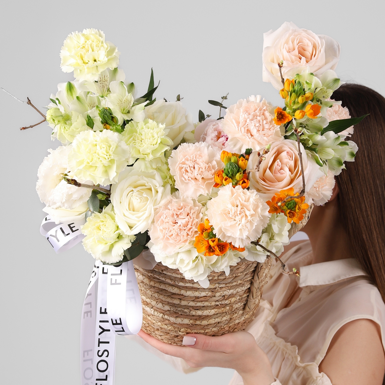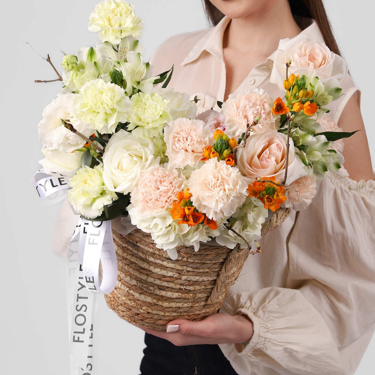 Состав: Кашпо плетенное, Роза White O'Hara - 2 шт, Роза Playa Blanca - 3 шт, Диантус Brut/Green - 13 шт, Альстромерия White - 3 шт, Эустома White - 2 шт, Орнитогалум - 5 шт, Ветки декоративные - 5 шт