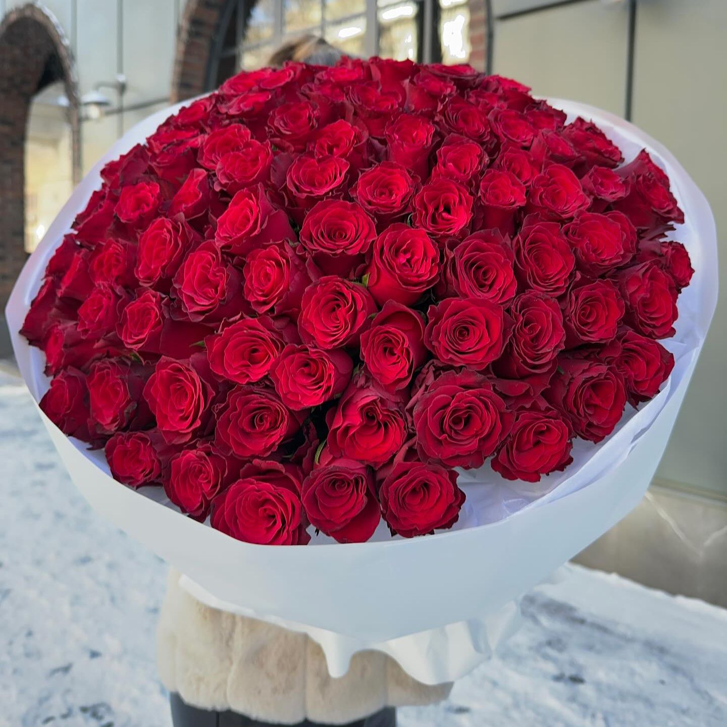 Состав: Роза Keniya Red - 101 шт, Тишью белая, Матовая пленка белая кругом