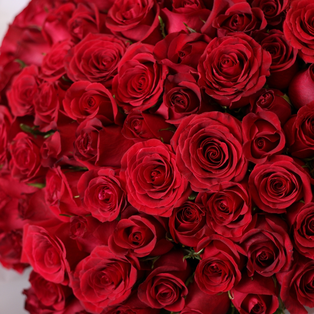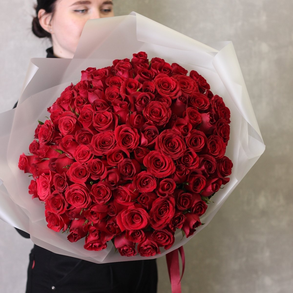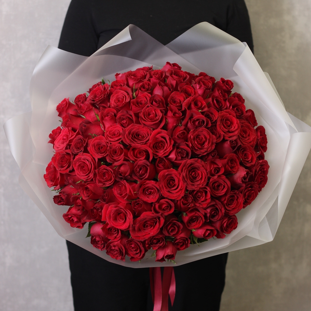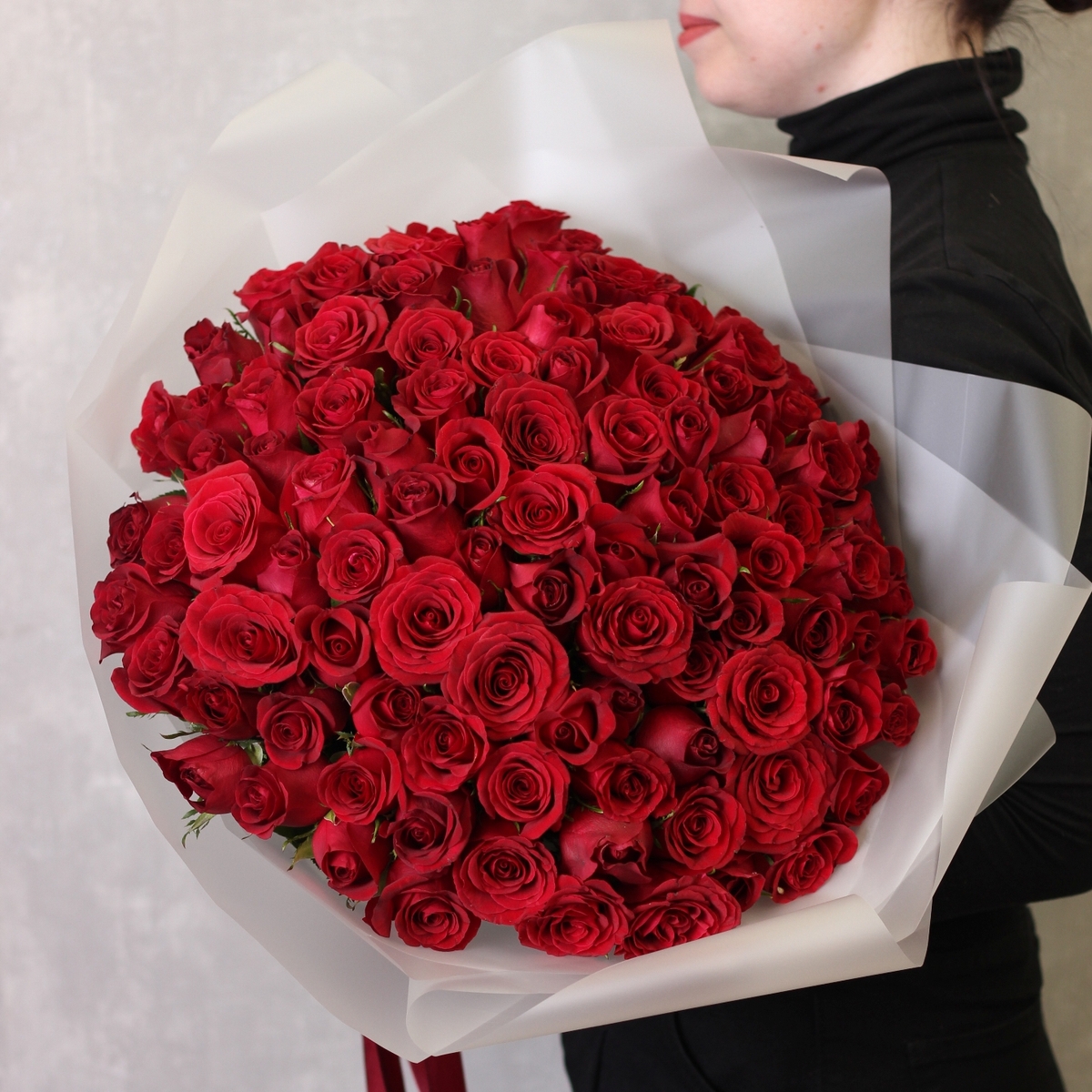Состав: Роза Kenya Red сортовая - 101 шт, Матовая пленка белая полупрозрачная углами