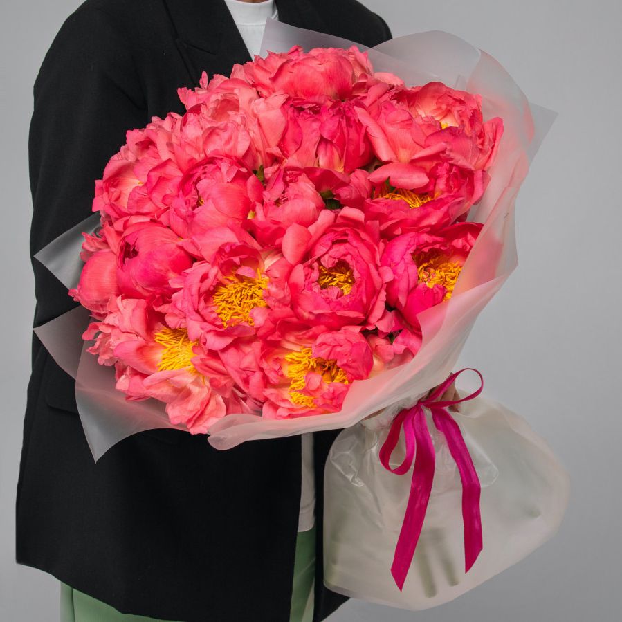 11 коралловых пионов в оформлении