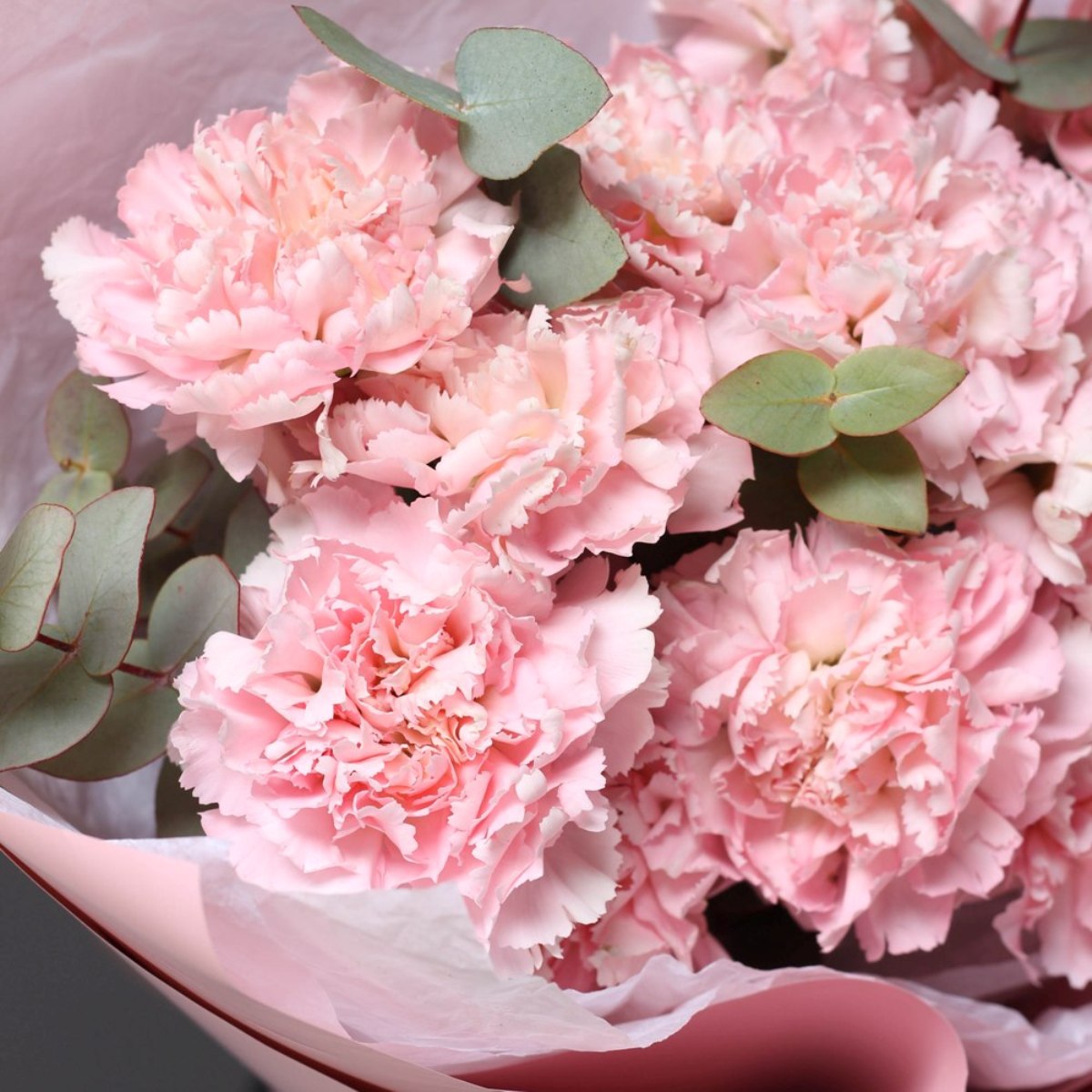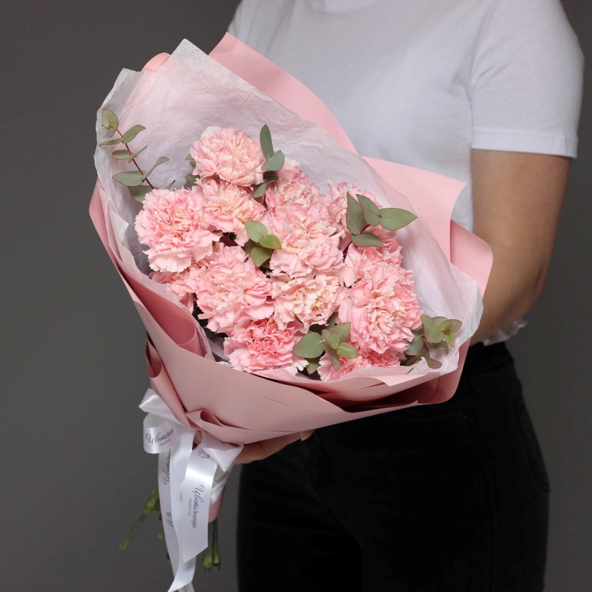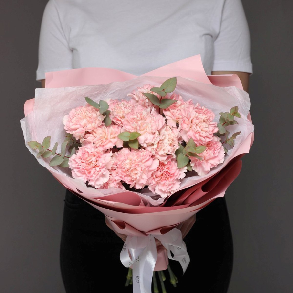 Состав: Диантусы Pink - 13 шт, Эвкалипт — 0,5 шт, Тишью белое, Матовая пленка розовая ушками