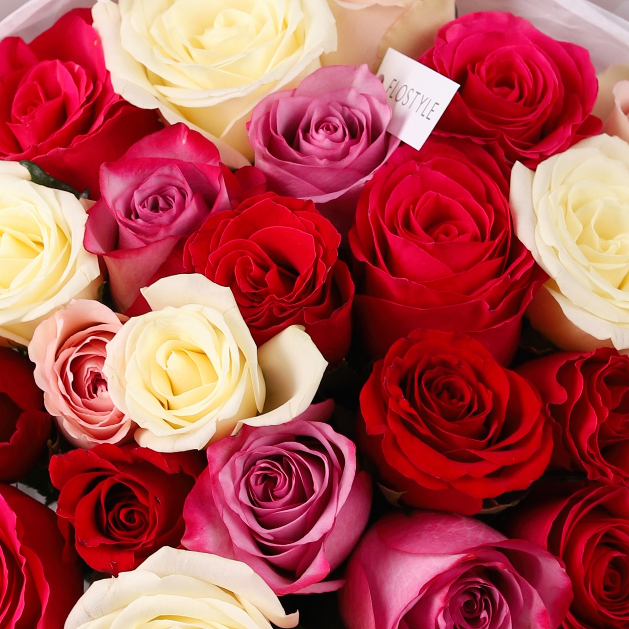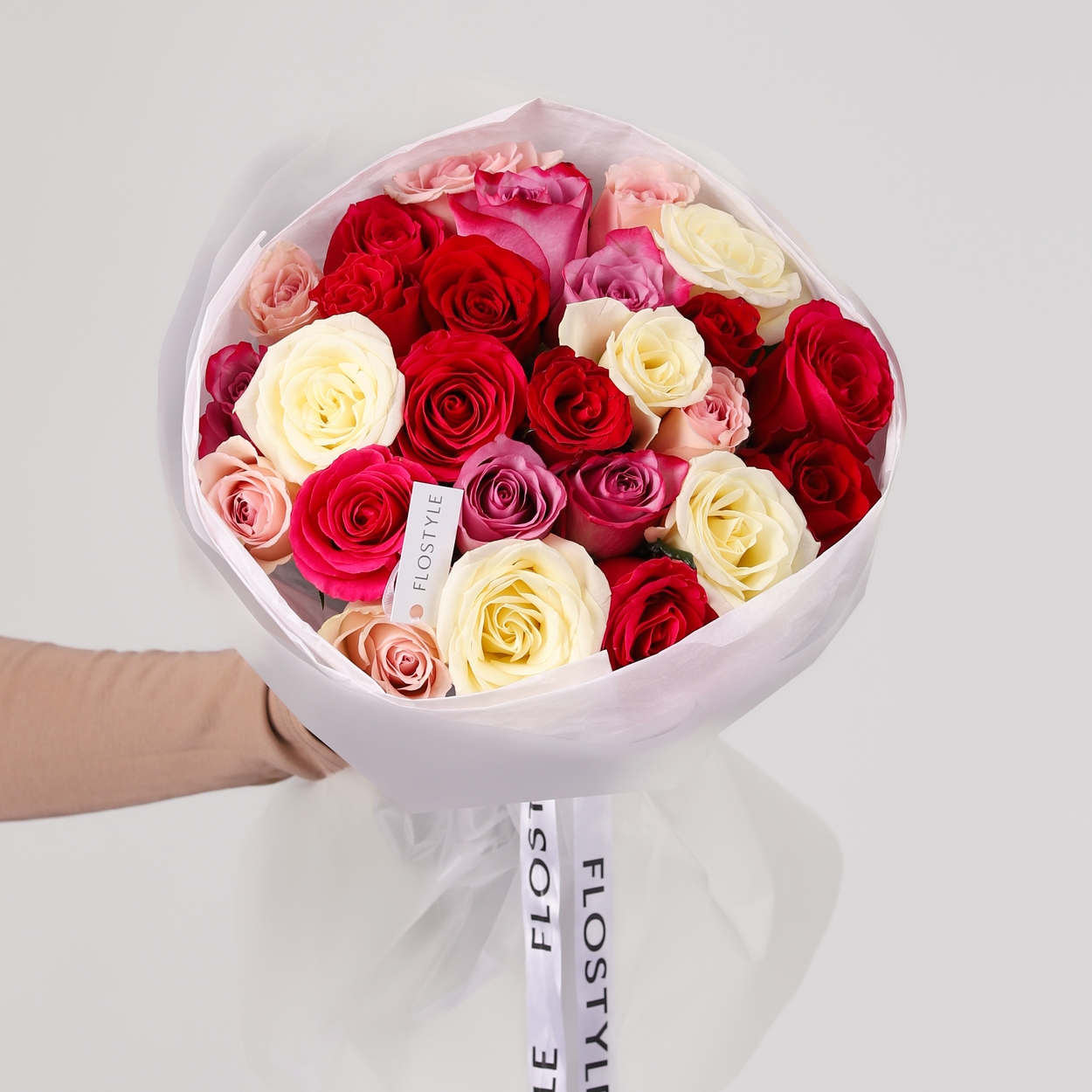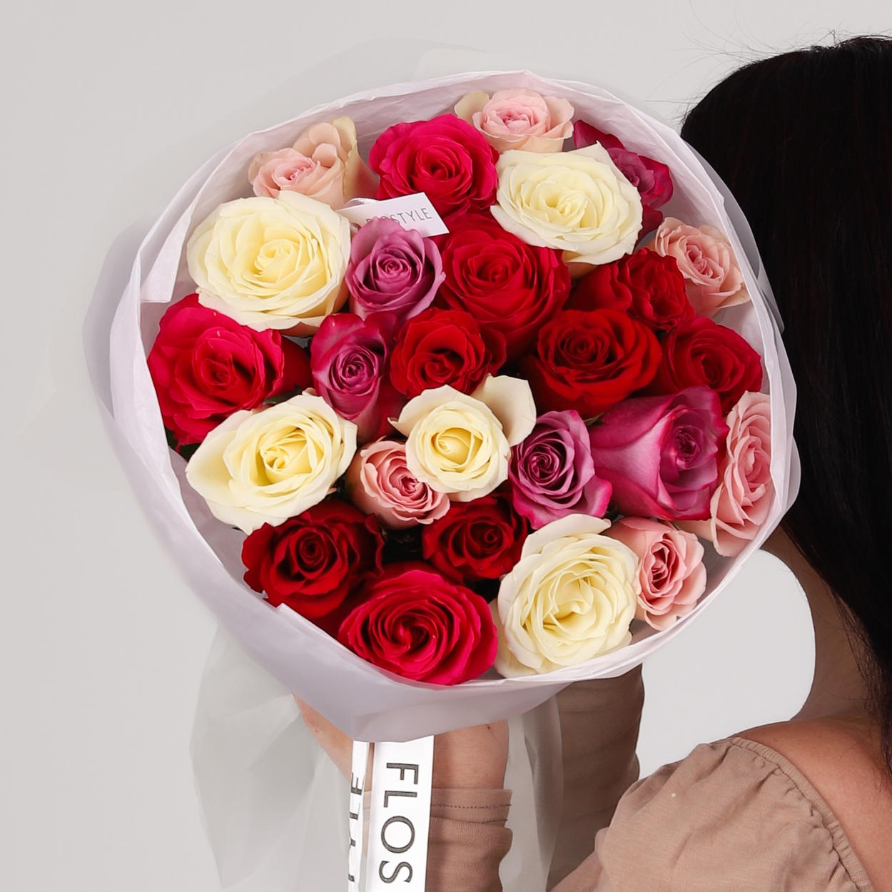 Состав: Роза Keniya Mix (Pink, White, Purple) - 25 шт, Тишью белая, Матовая пленка белая кругом