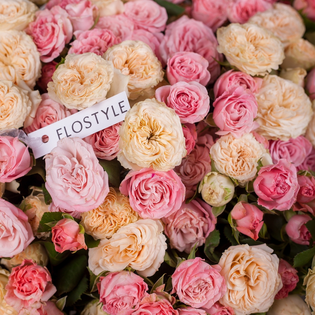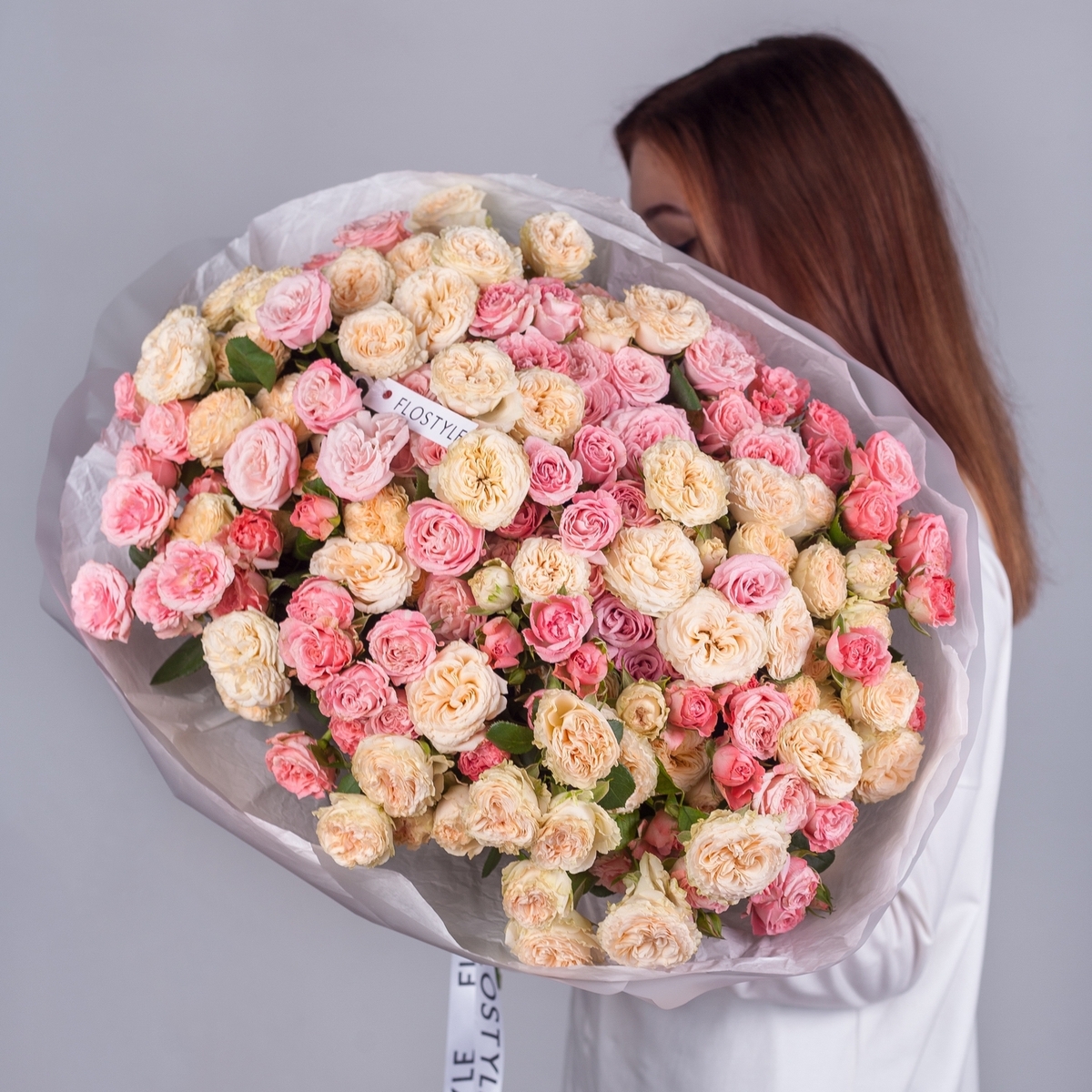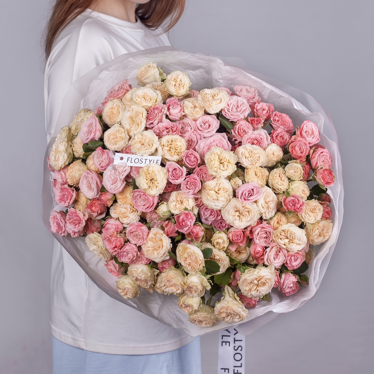 Состав: Роза кустовая Madam Bombastic/Summerrose - 35 шт, Тишью белая, Матовая пленка розовая кругом