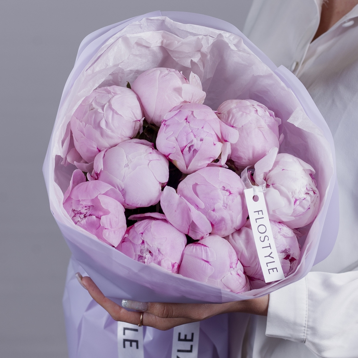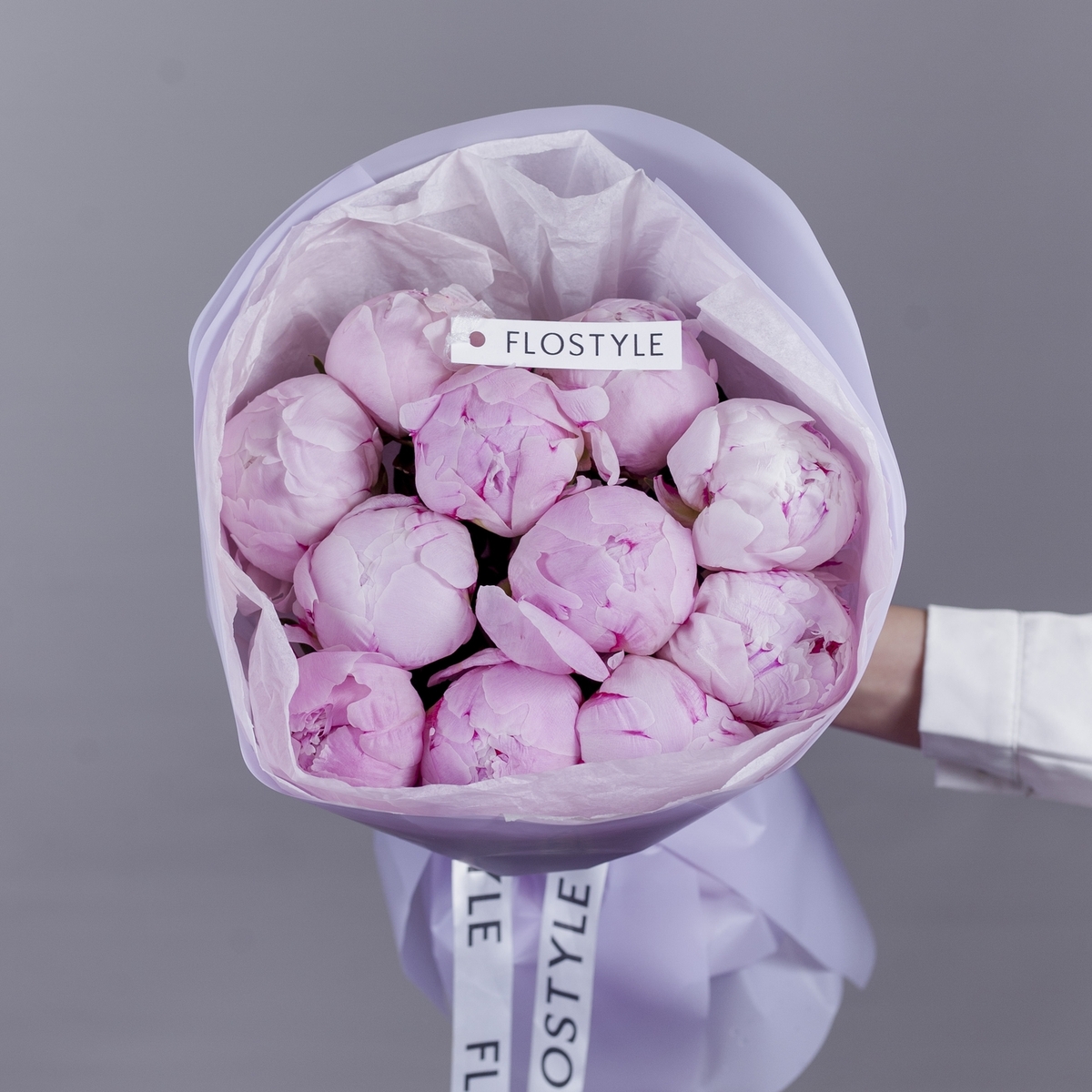 Состав: Пион Sarah Bernhardt - 11 шт, Тишью розовая, Матовая пленка сиреневая кругом