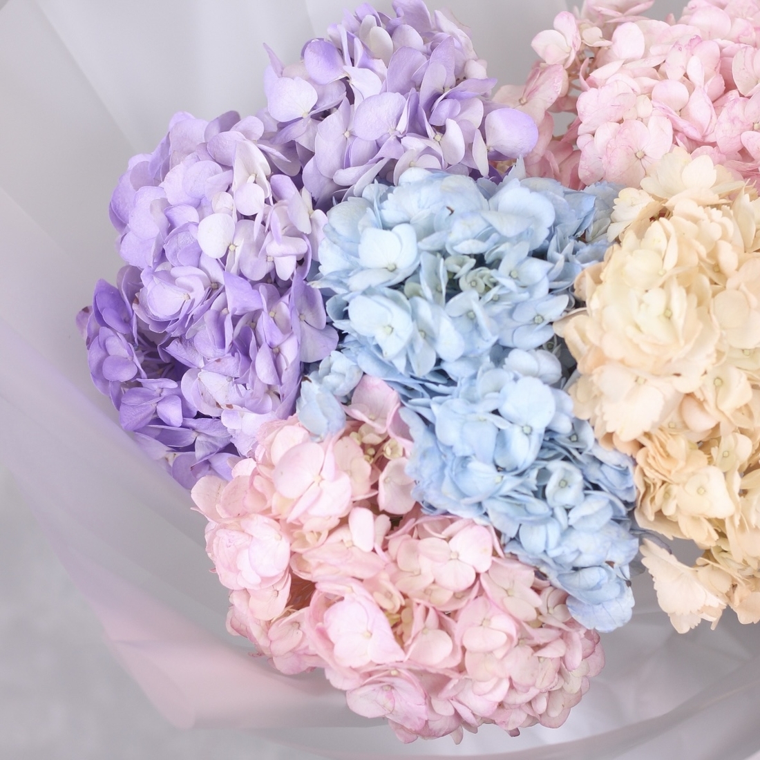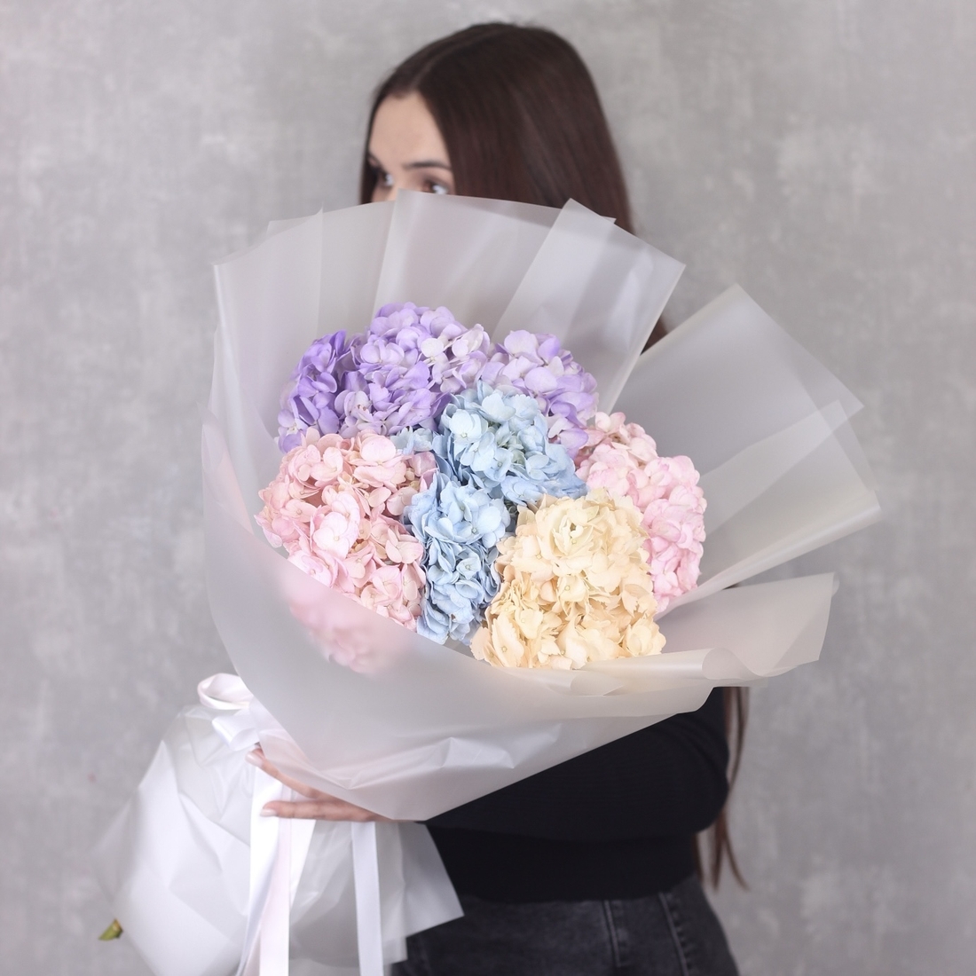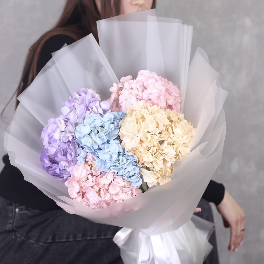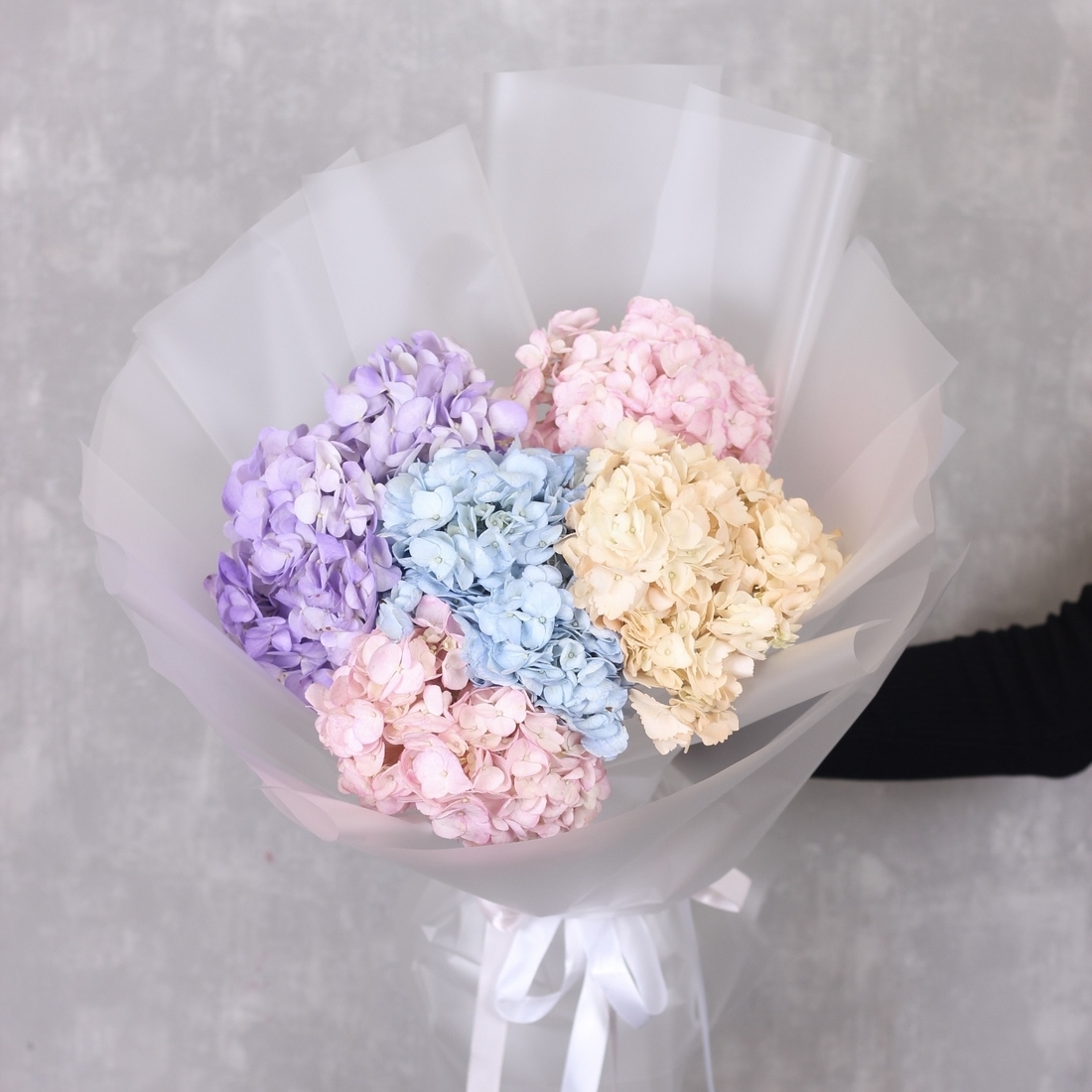 Состав: Гортензия mix - 5 шт, Матовая пленка белая прозрачная складками