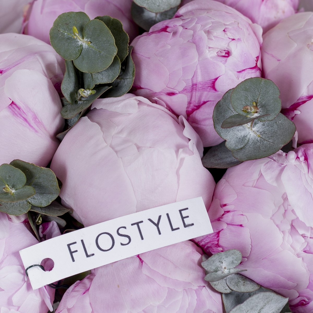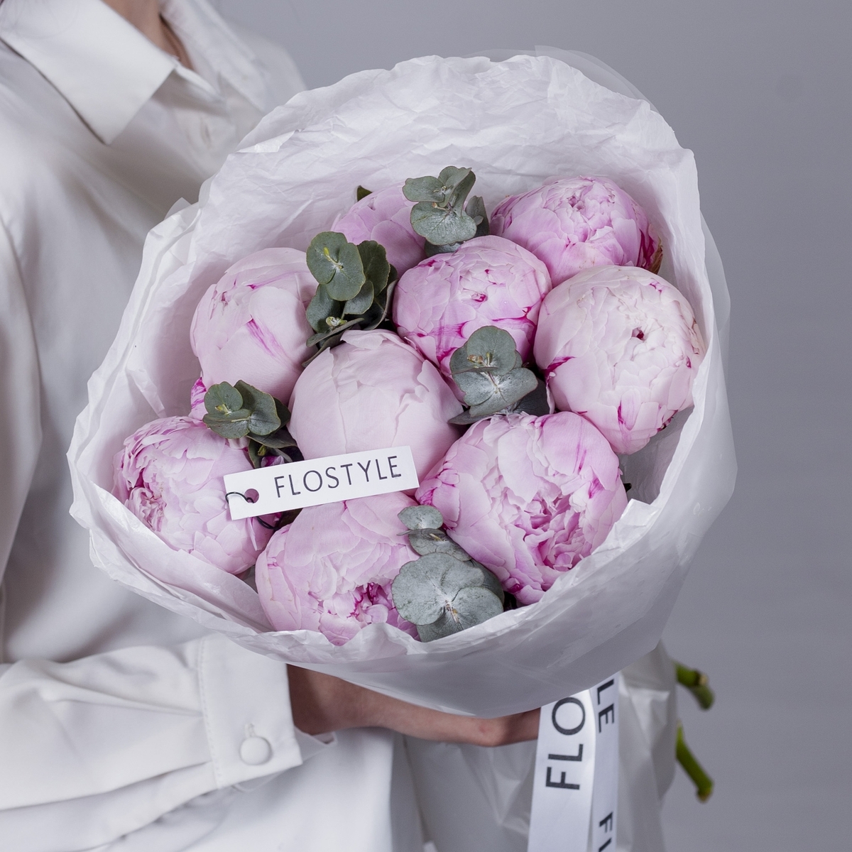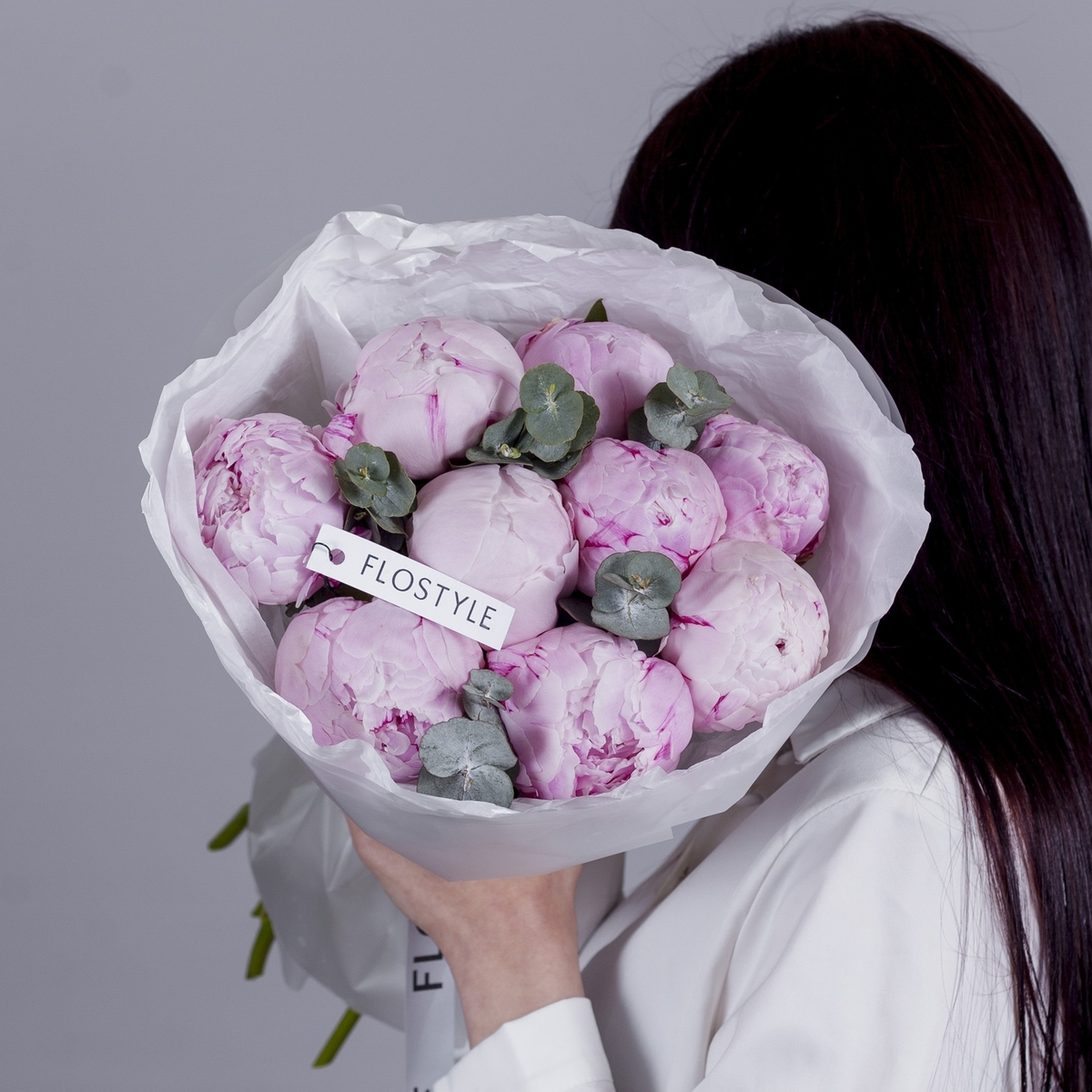 Состав: Пион sarah bernhardt - 9 шт, Эвкалипт - 0,5 шт, Тишью белая, Матовая пленка полупрозрачная кругом