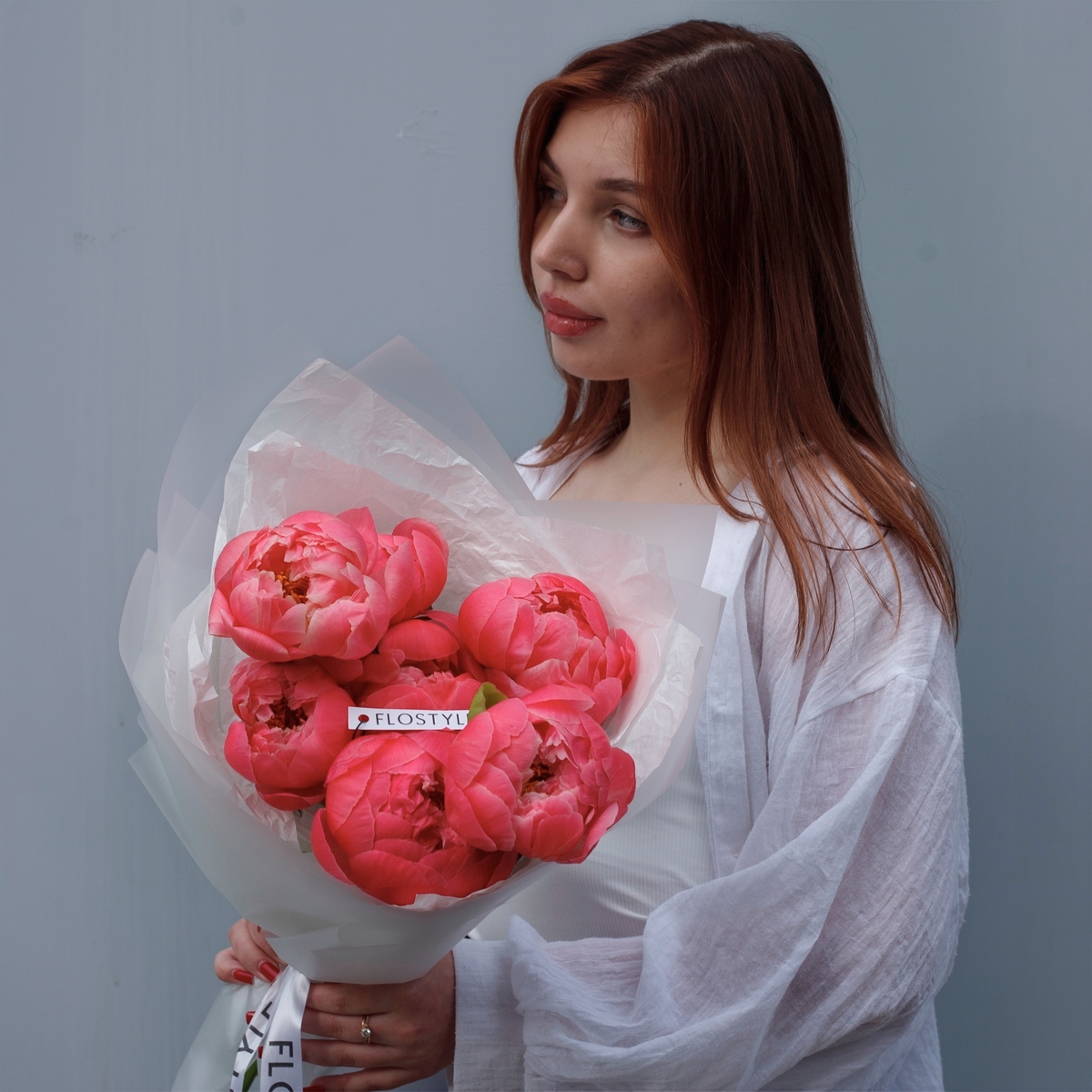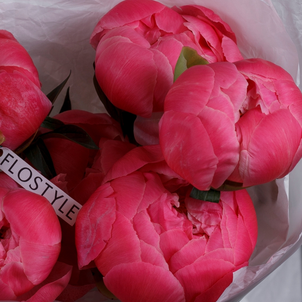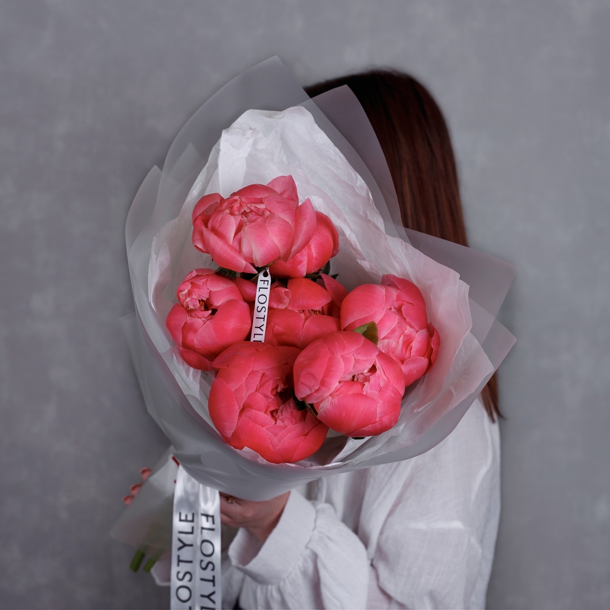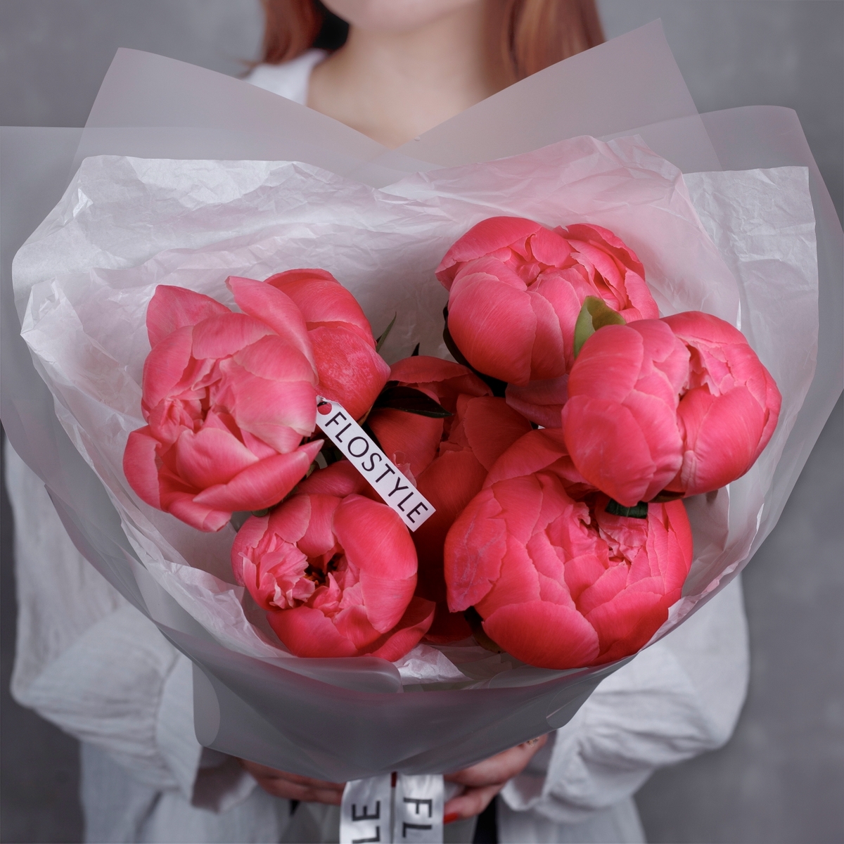 Состав: Пионы Coral Charm - 7 шт, Тишью белая, Матовая пленка белая ушками