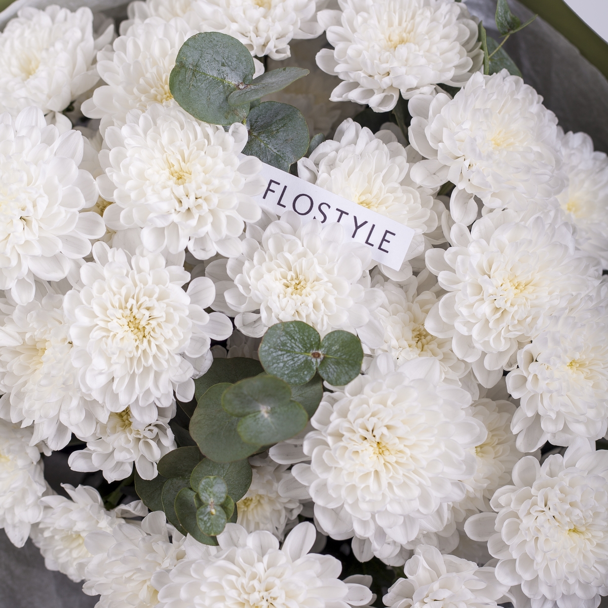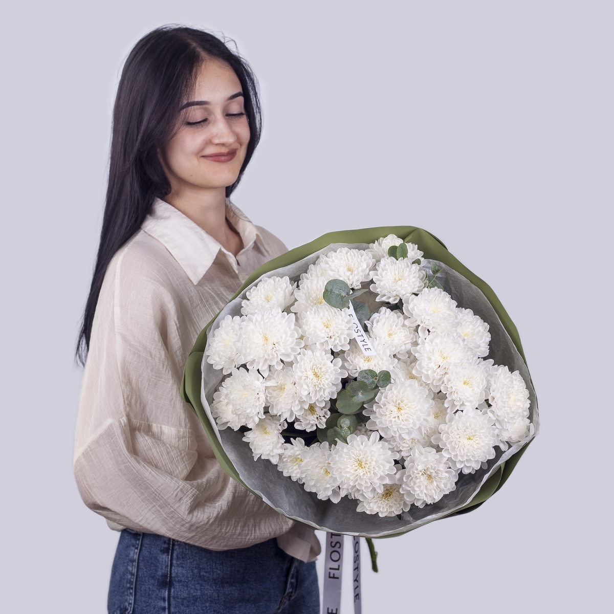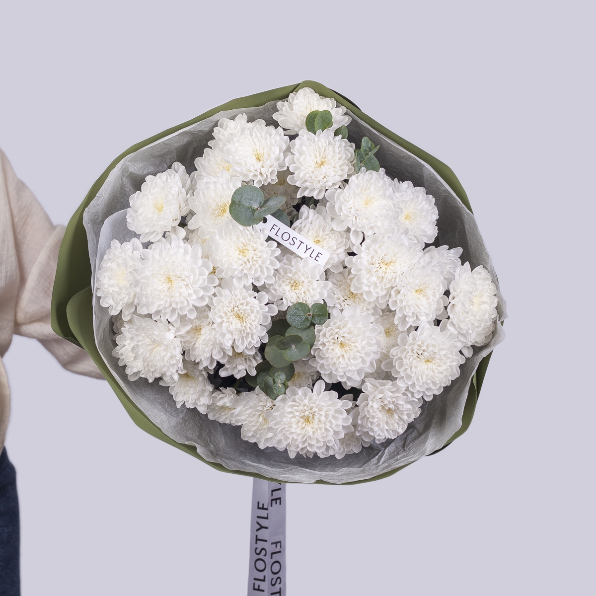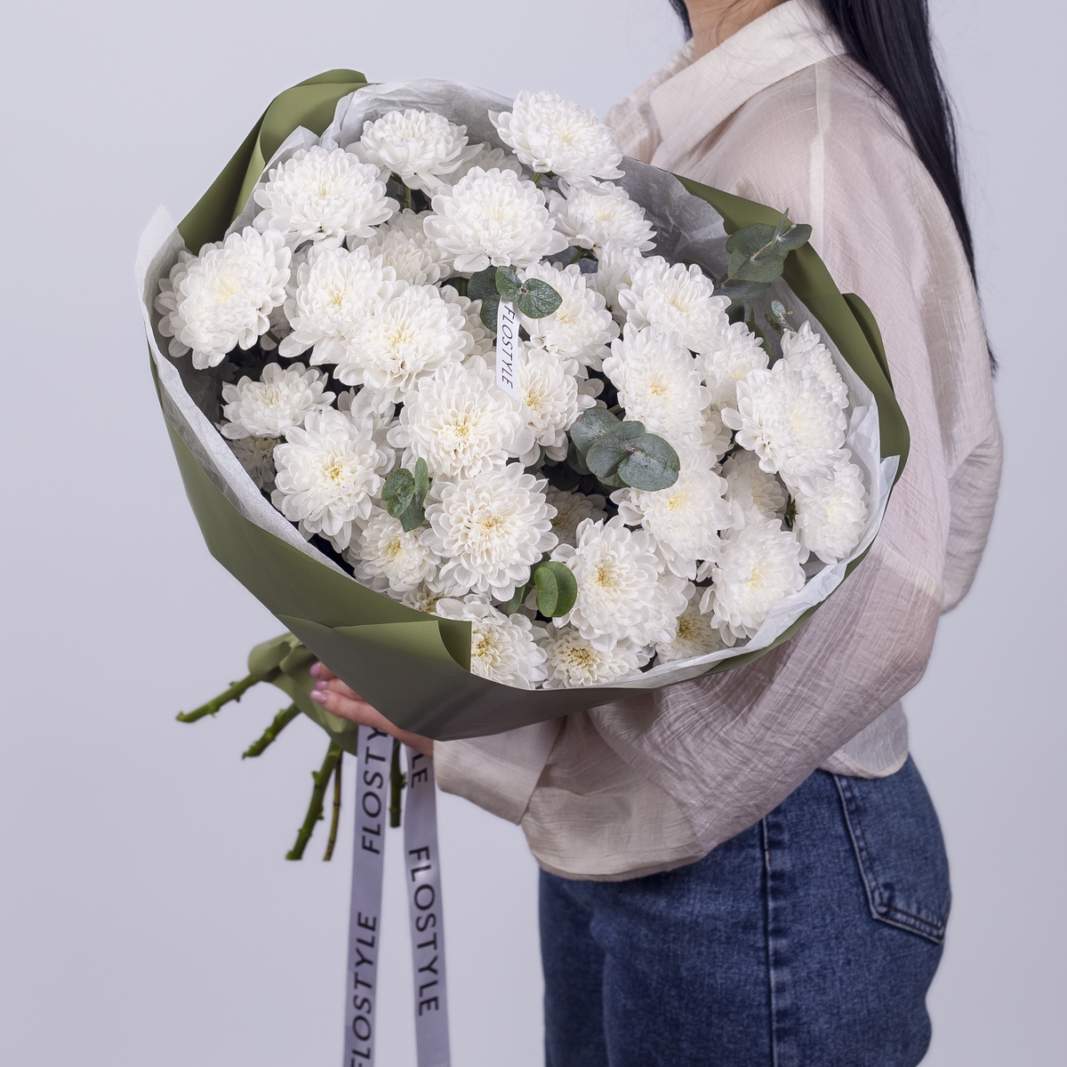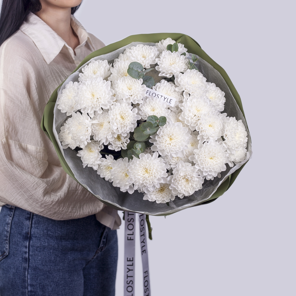 Состав: Хризантема Altaj - 7 шт, Эвкалипт - 0,5 шт, Тишью белая, Матовая пленка хаки кругом