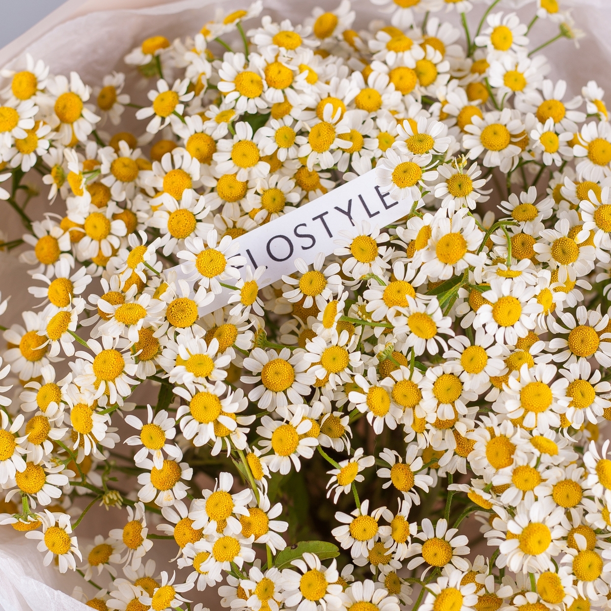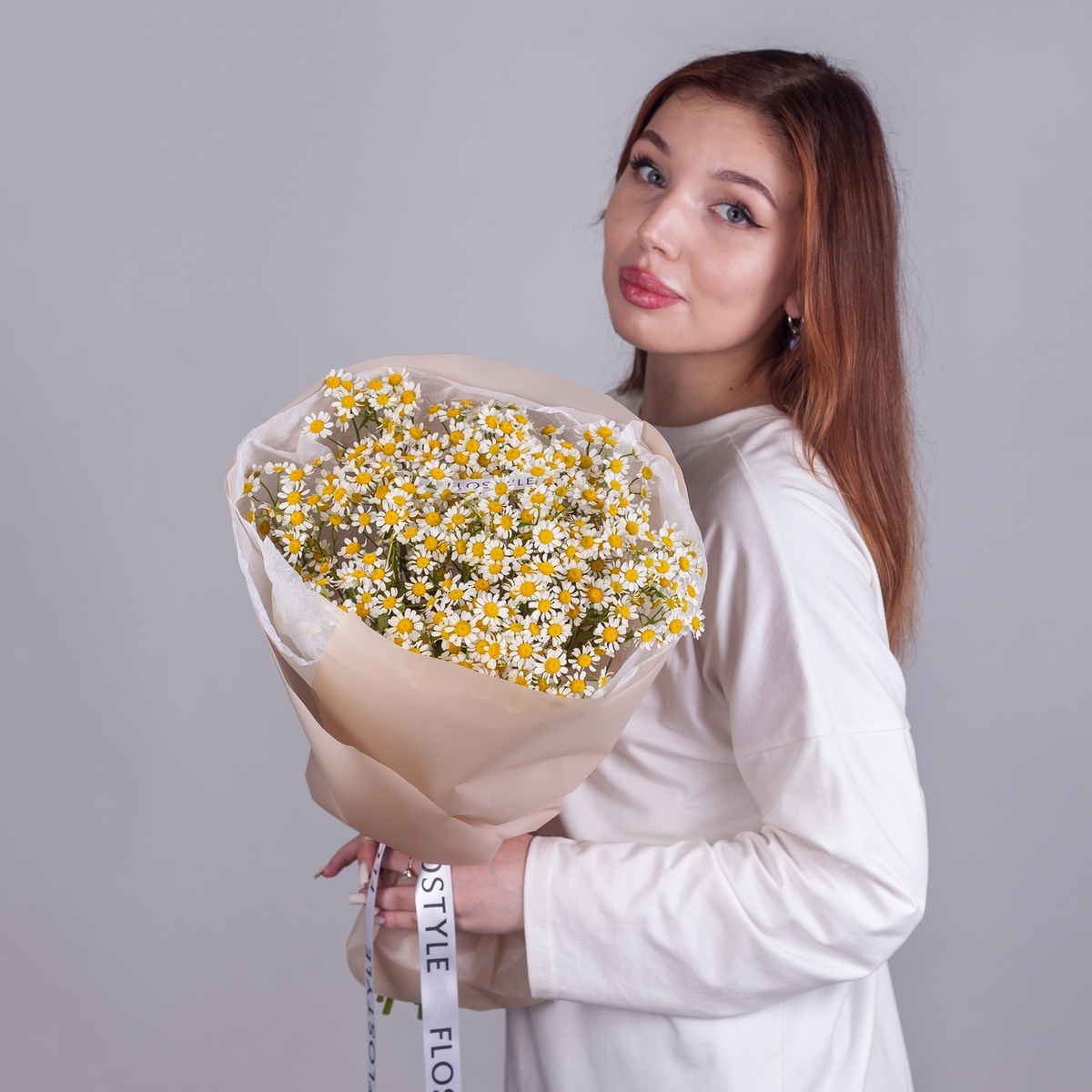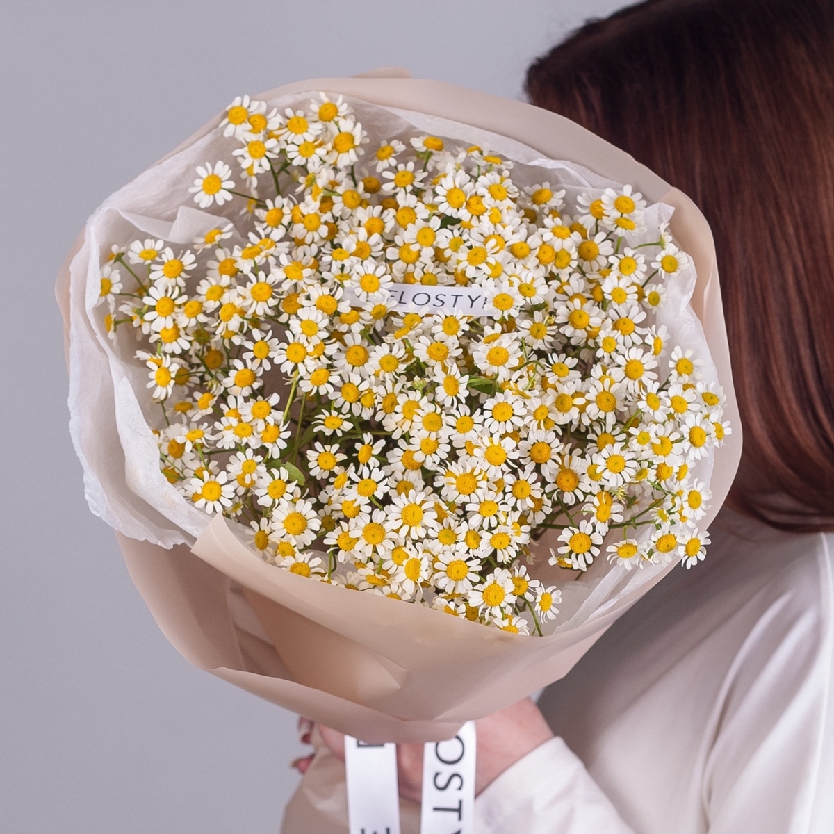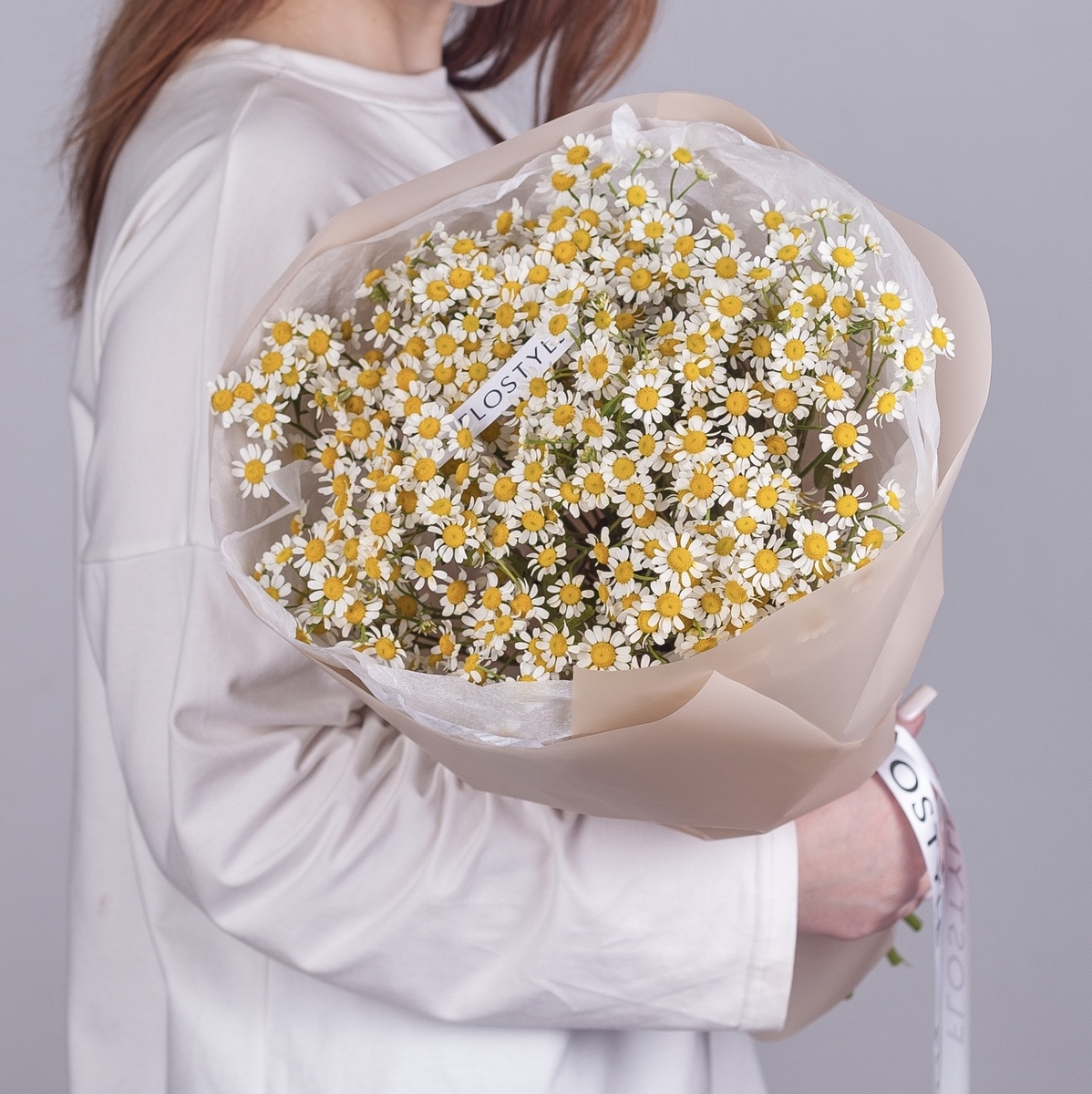 Состав: Ромашка Танацетум - 13 шт, Фисташка - 2 шт, Тишью белая, Матовая пленка бежевая кругом