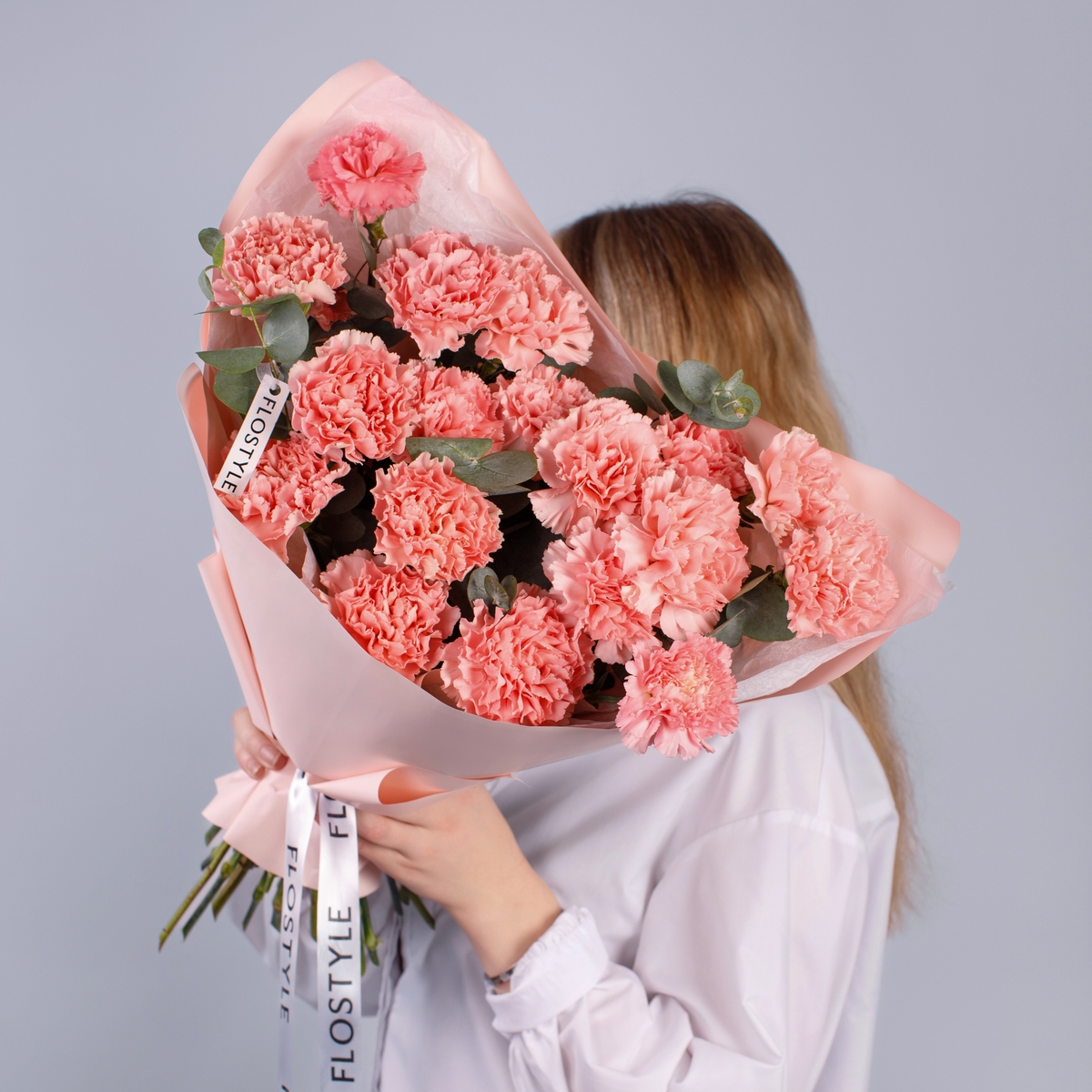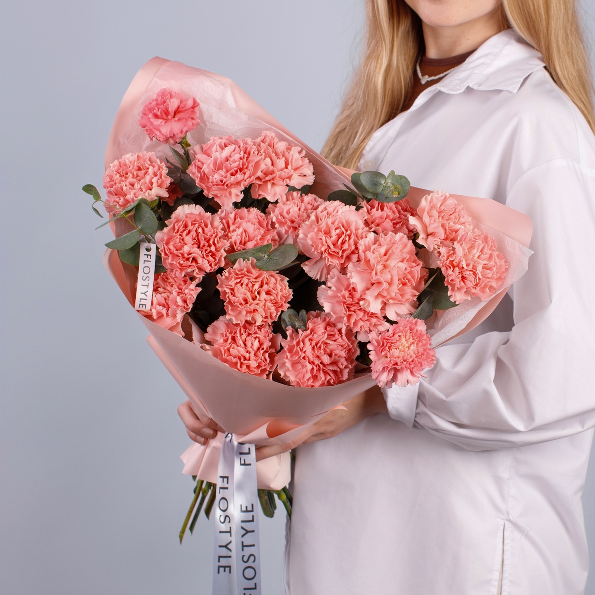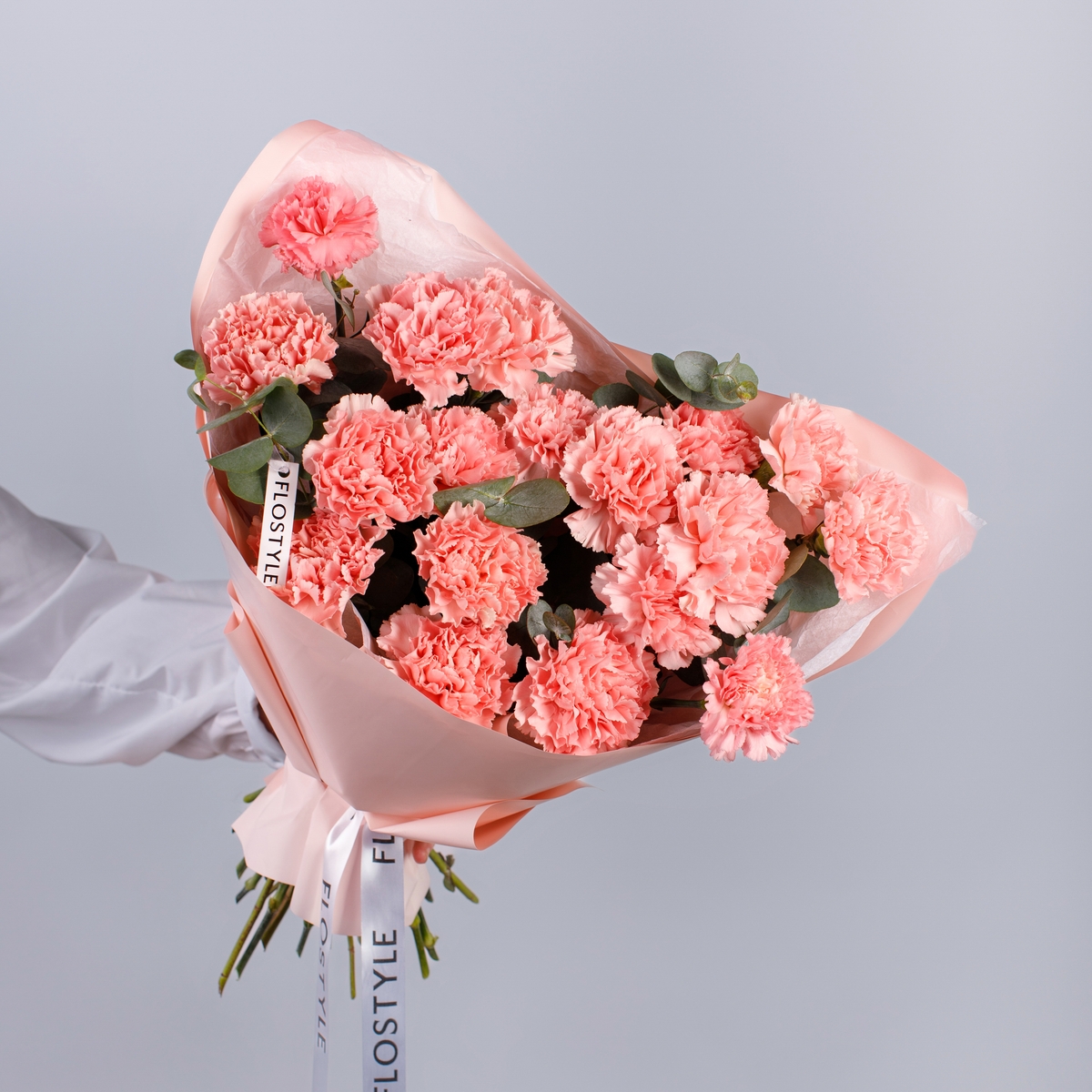 Состав: Диантус Pink - 19 шт, Эвкалипт - 0,5 шт, Тишью белая, Матовая пленка розовая ушками