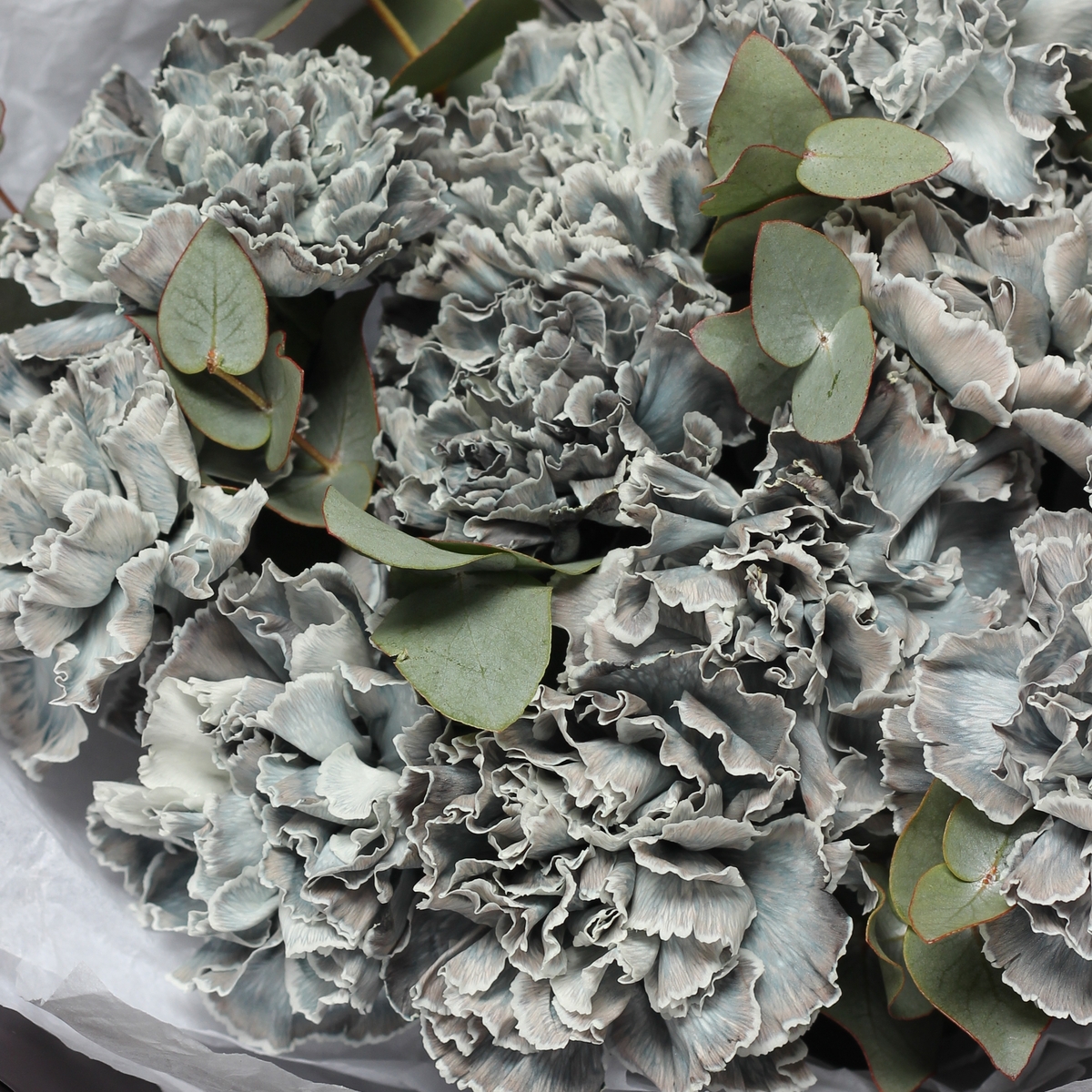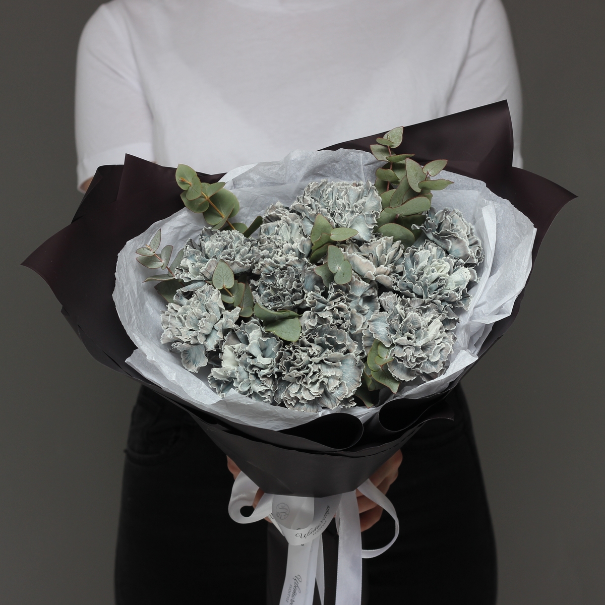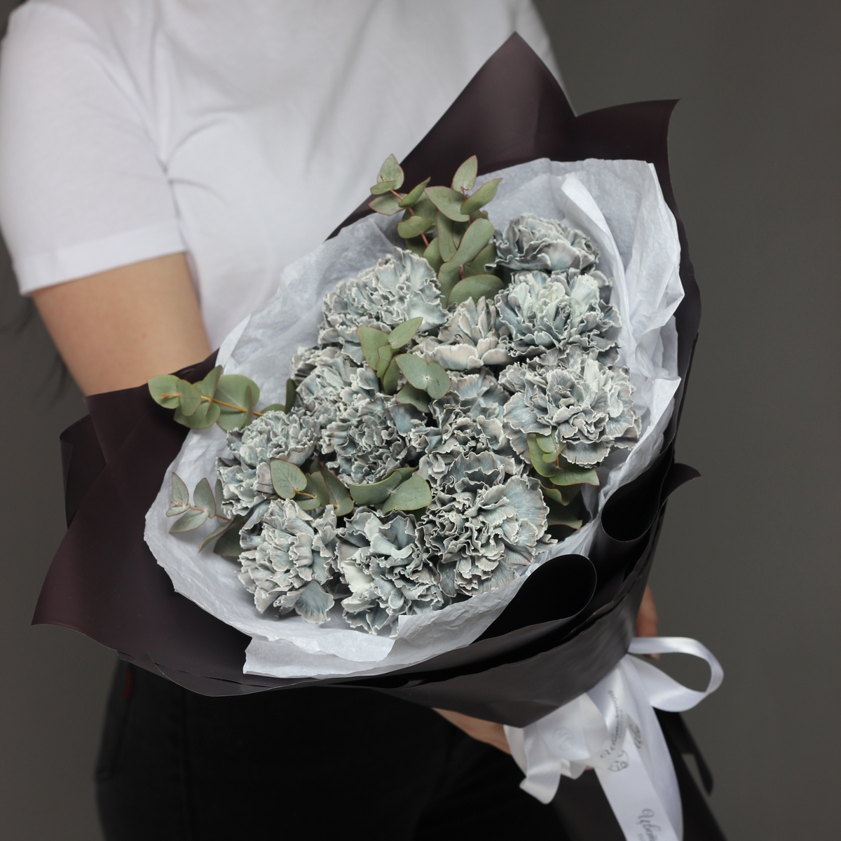 Состав: Диантус Black Molly - 13 шт, Эвкалипт - 0,5 шт, Тишью белое, Матовая пленка черная ушками