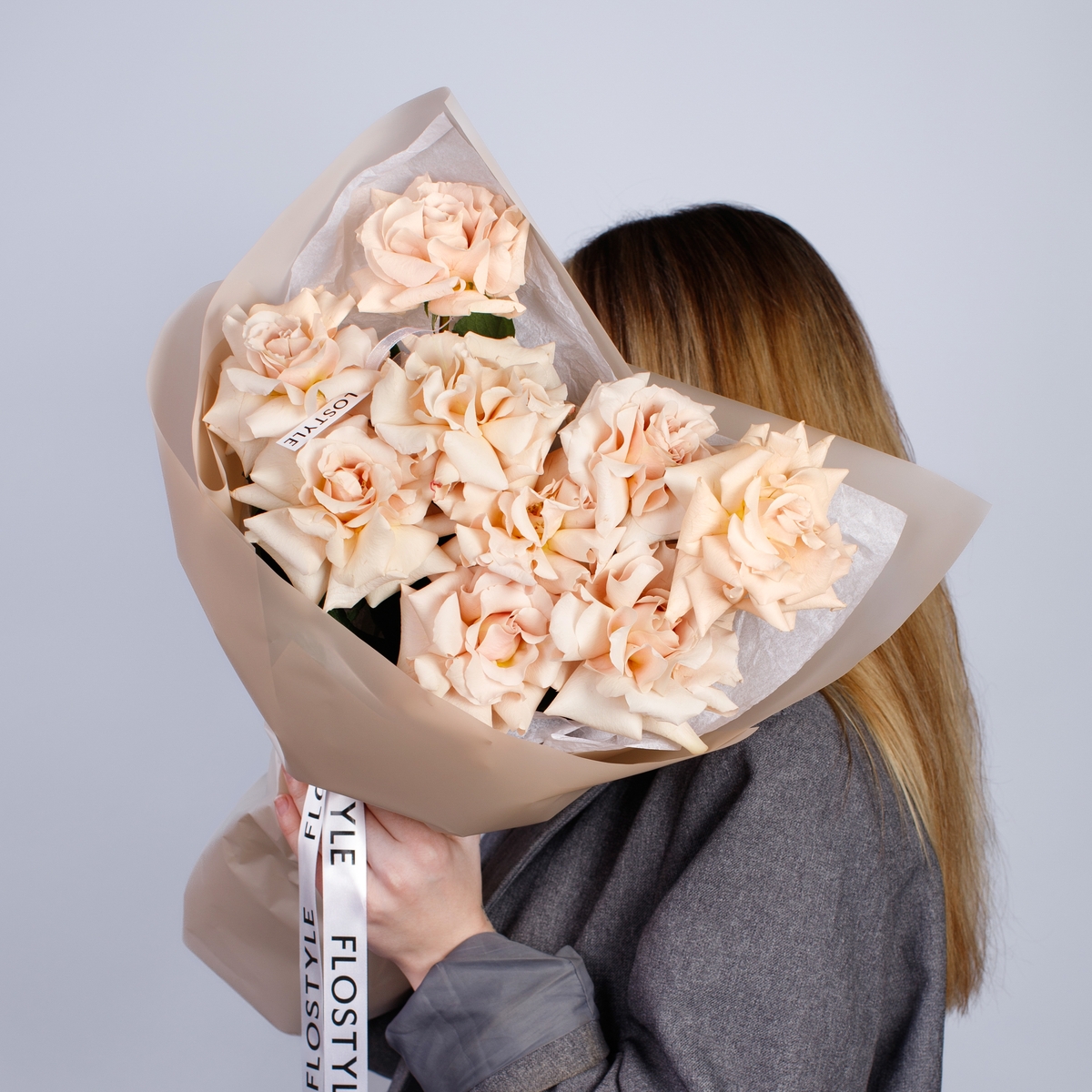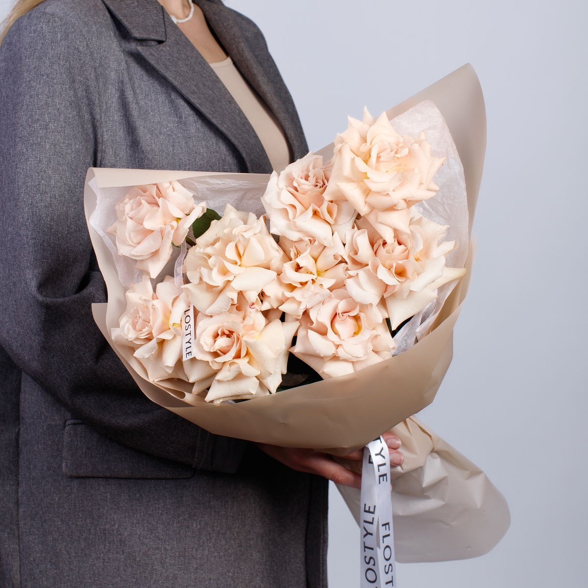 Состав: Роза Quicksand французская - 9 шт, Фисташка - 2 шт, Тишью белая, Матовая пленка бежевая ушками