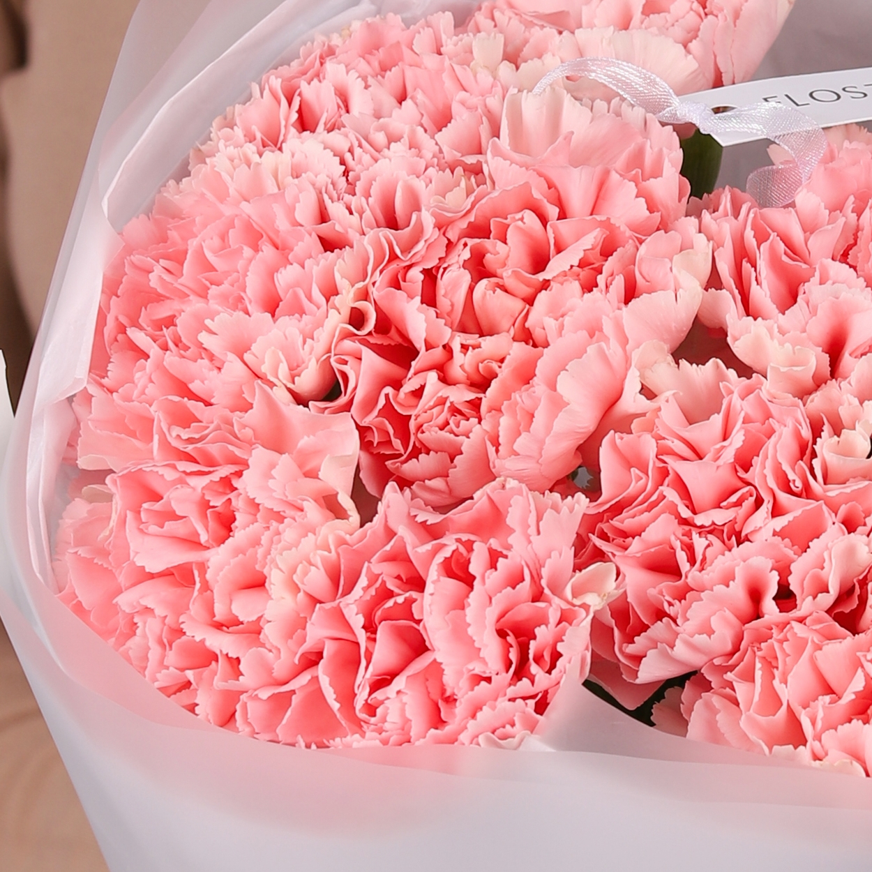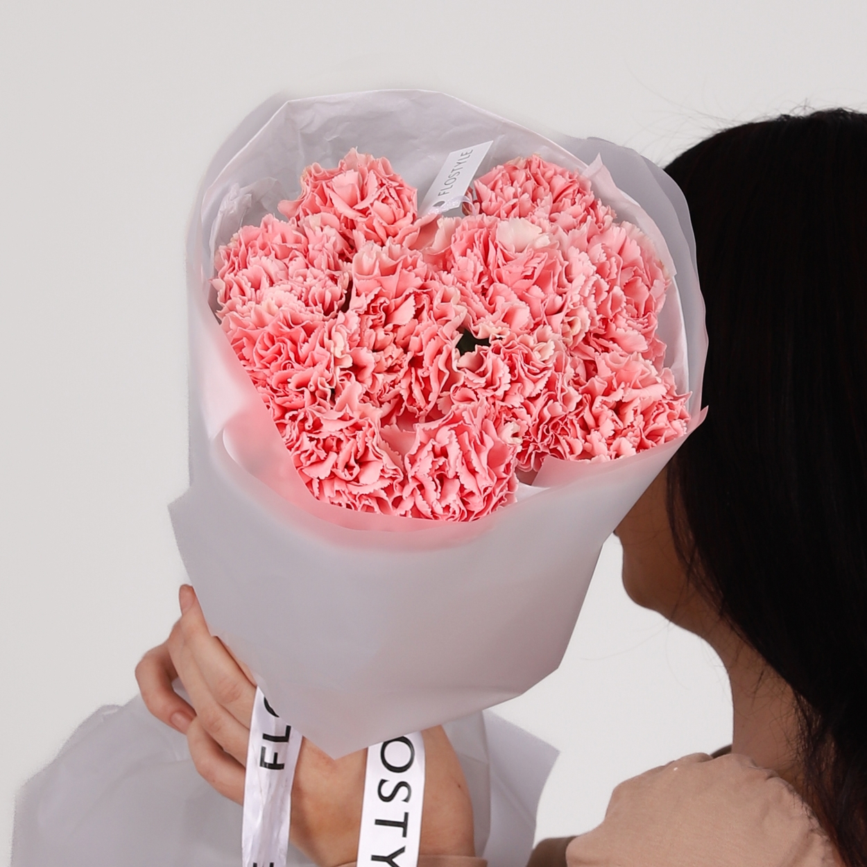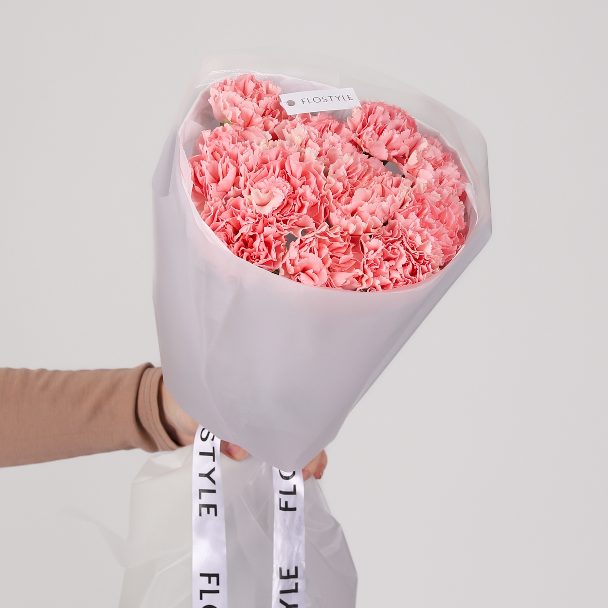 Состав: Диантус Pink - 11 шт, Фисташка - 2 шт, Тишью белая, Матовая пленка белая кругом