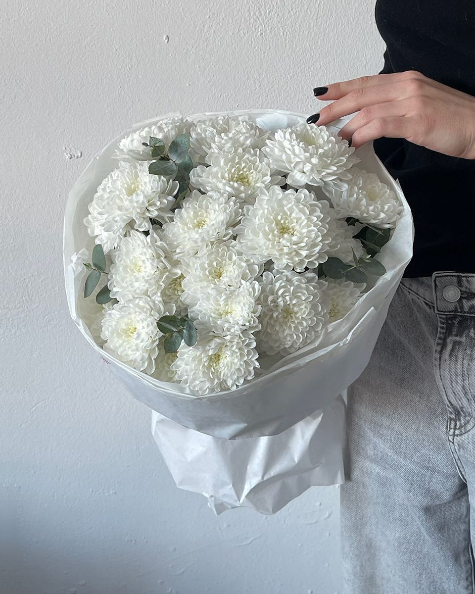 Состав: Хризантема Altaj - 5 шт, Эвкалипт - 0,5 шт, Тишью белая, Матовая пленка белая кругом