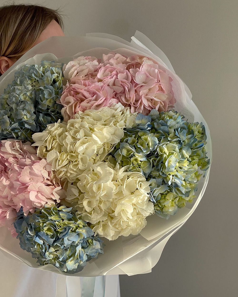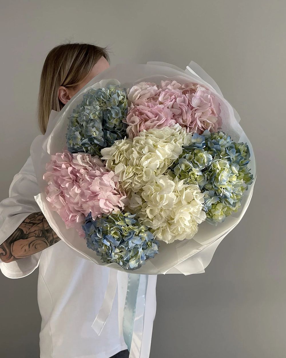 Состав: Гортензия Mix (White, Pink, Blue) - 7 шт, Тишью белая, Матовая пленка белая кругом
