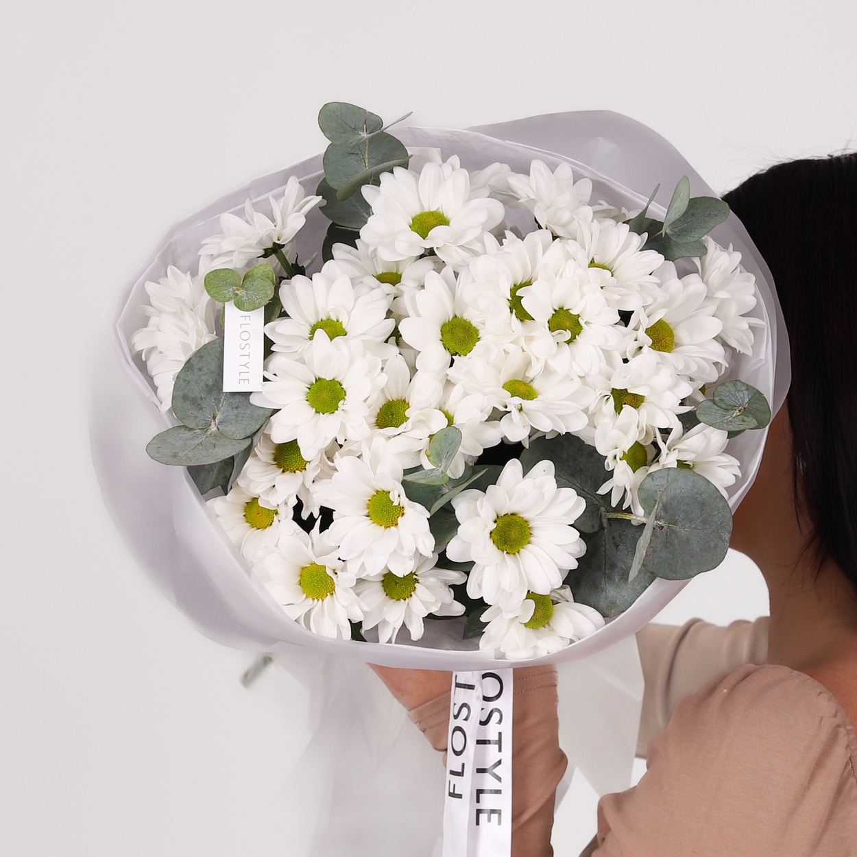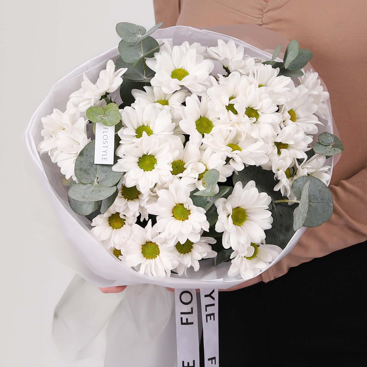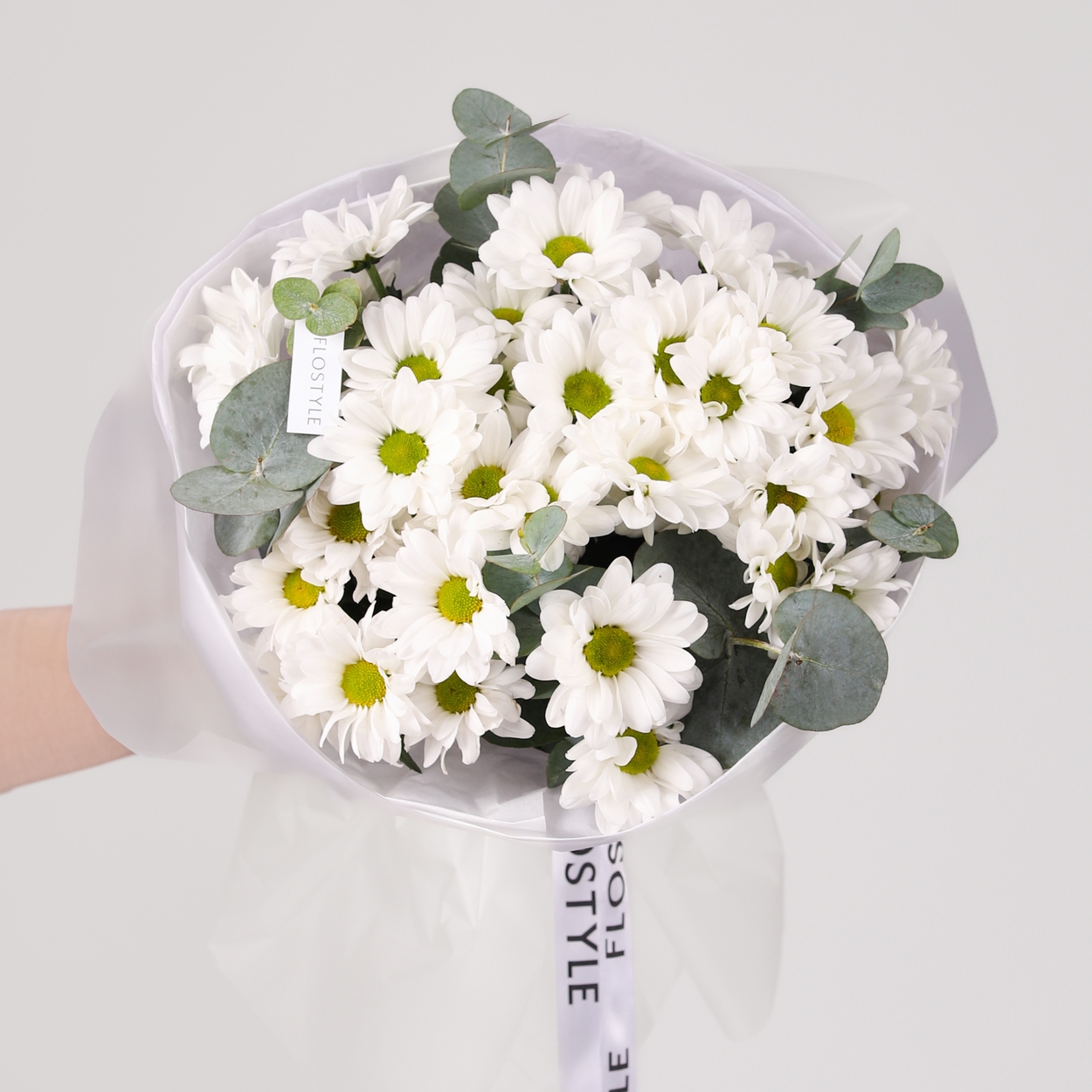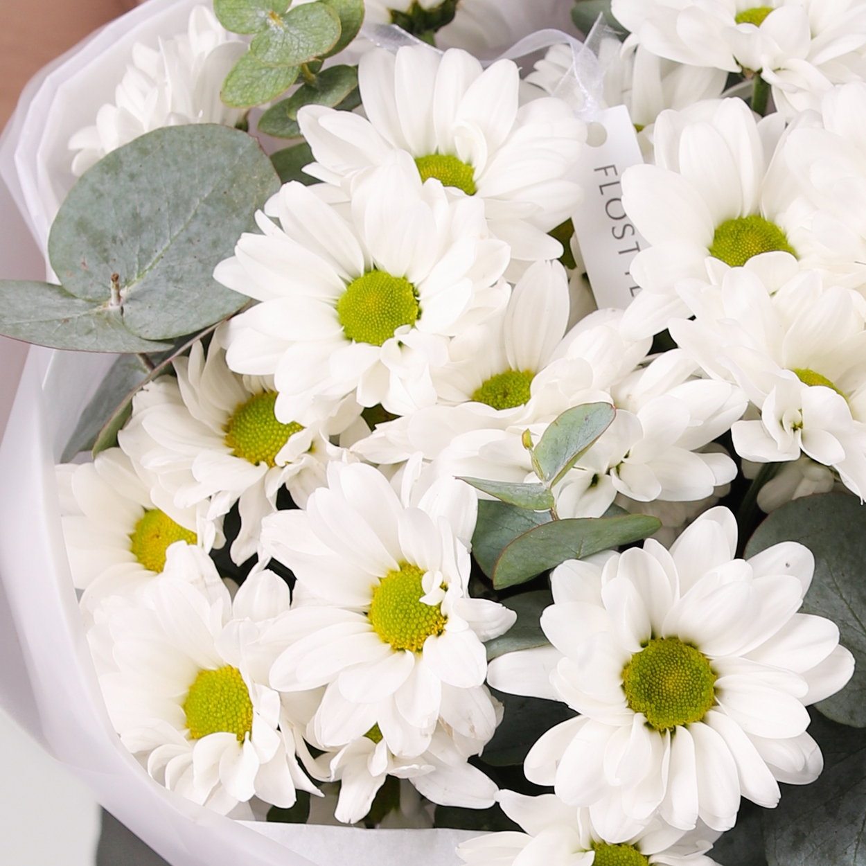 Состав: Хризантема Bacardi - 5 шт, Эвкалипт - 0,5 шт, Тишью белая, Матовая пленка белая кругом