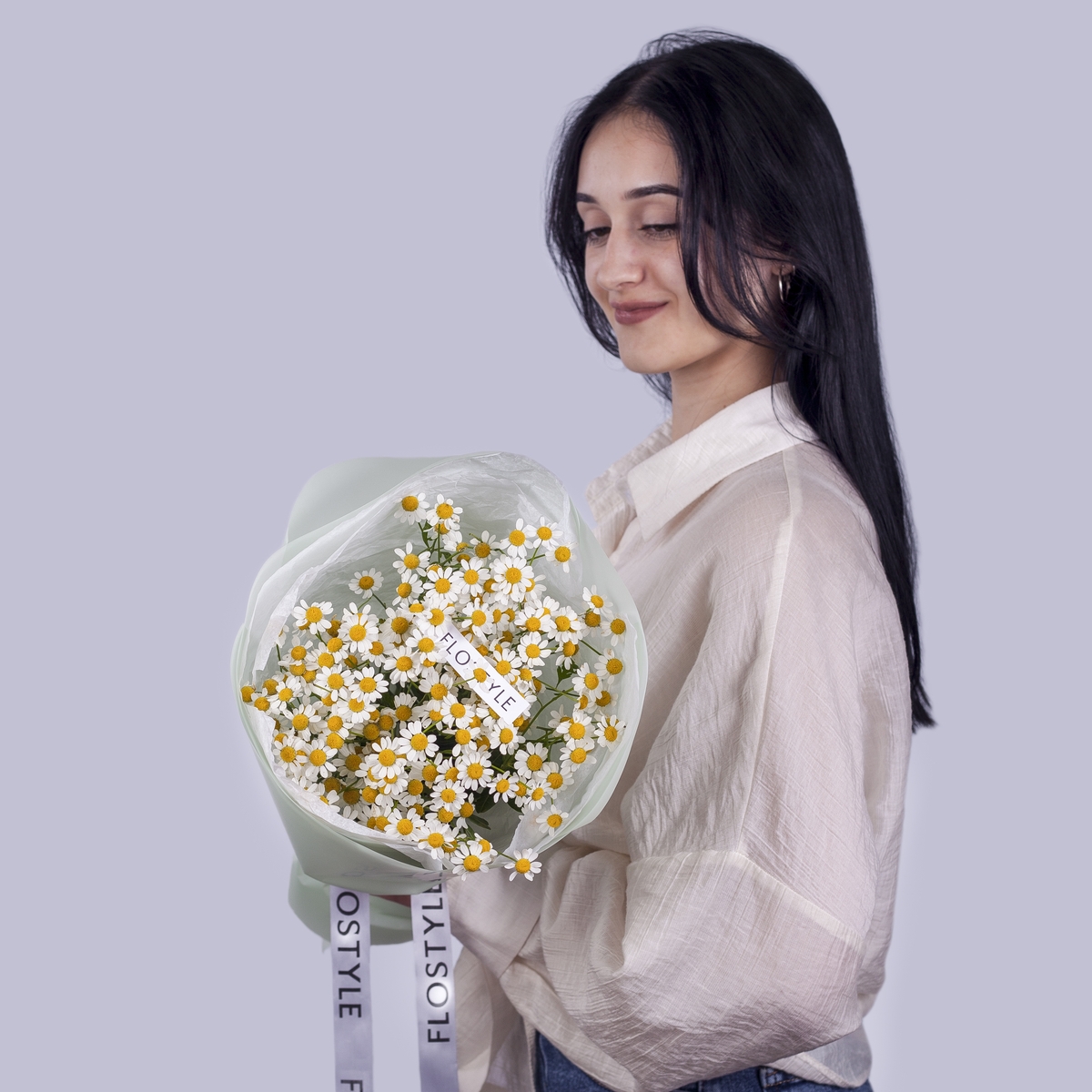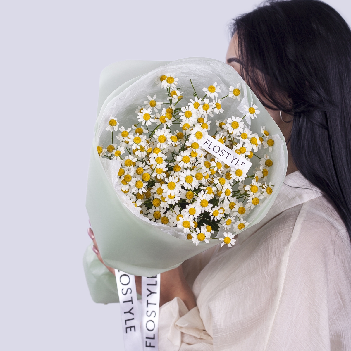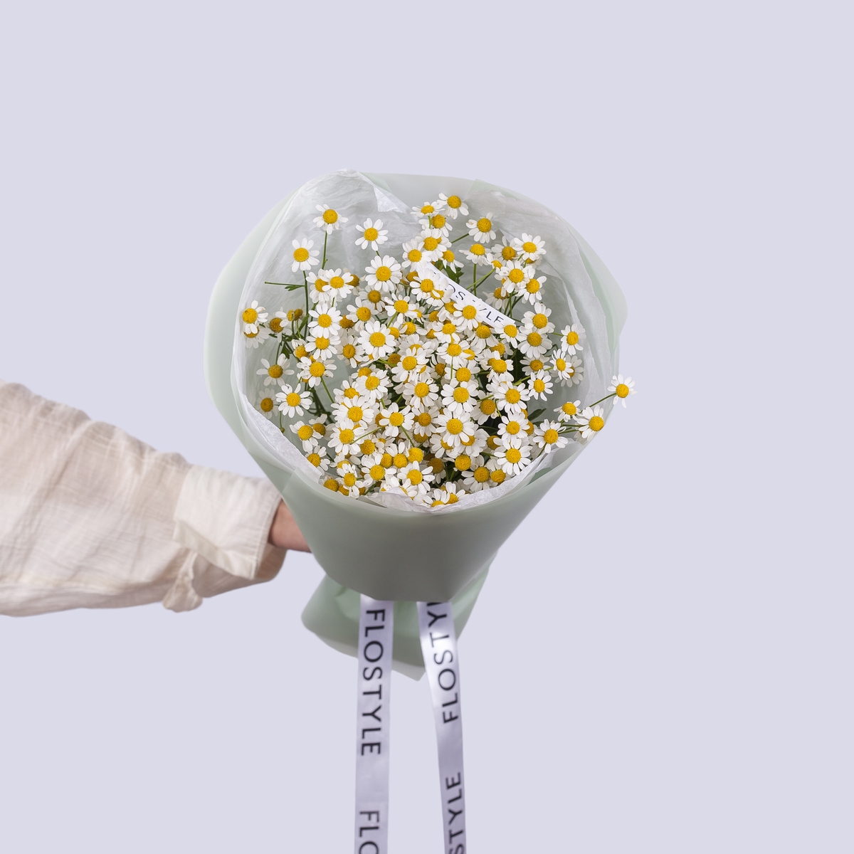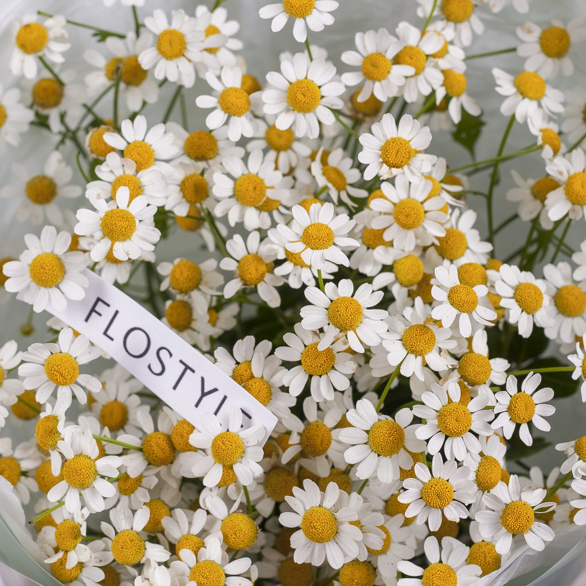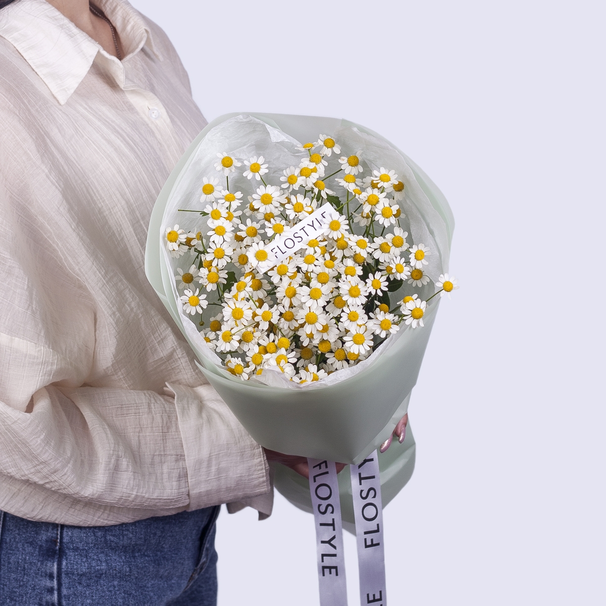 Состав: Ромашка танацетум - 5 шт, Тишью белая, Матовая пленка зеленая кругом