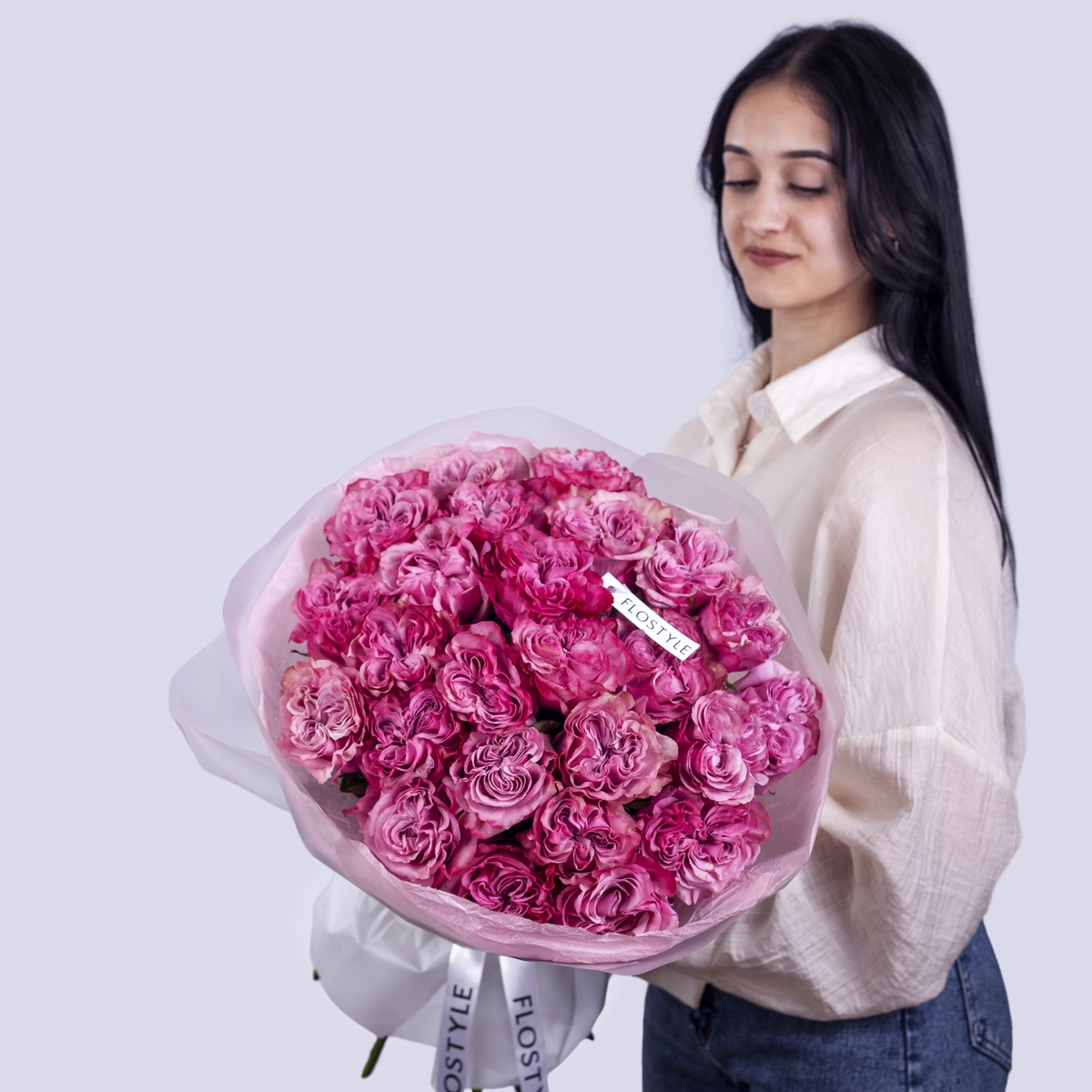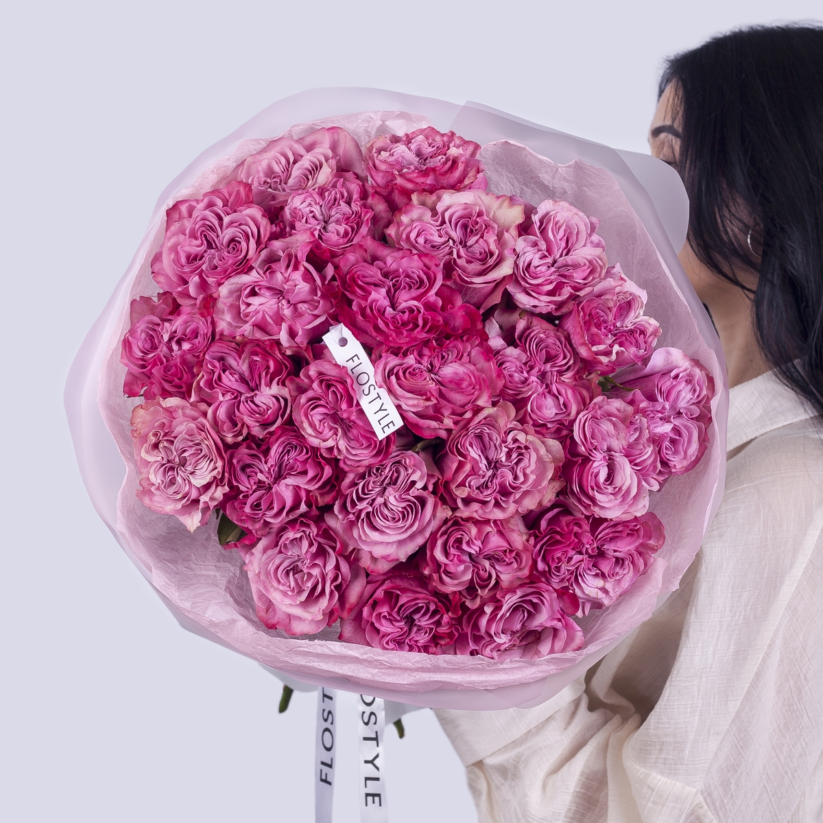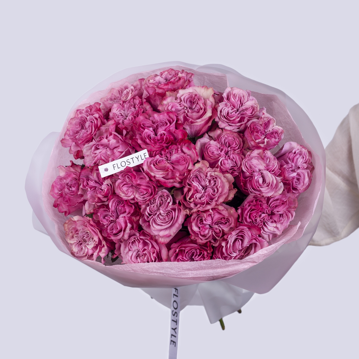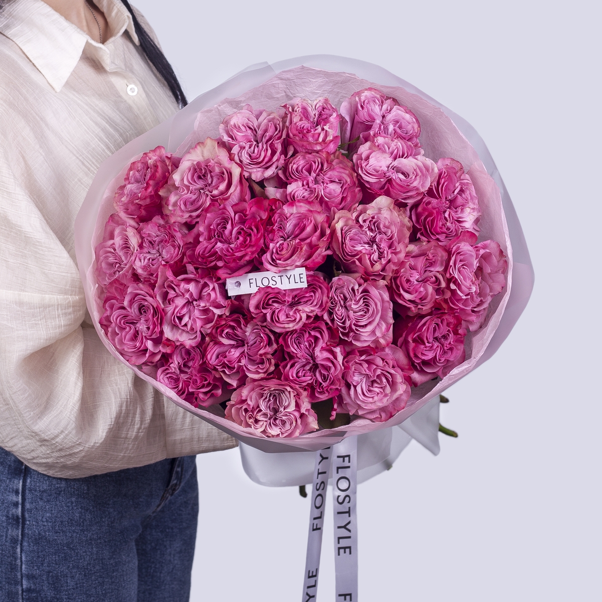 Состав: Роза Country Blues - 25 шт, Тишью розовая, Матовая пленка белая кругом