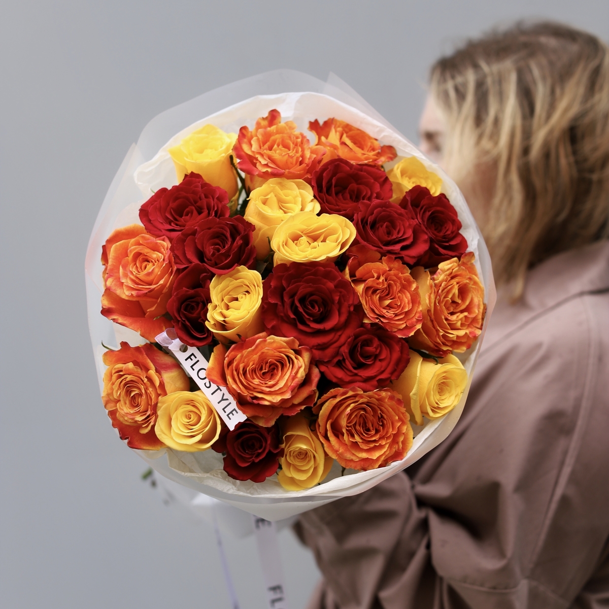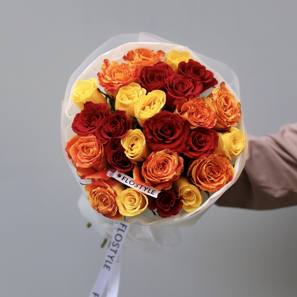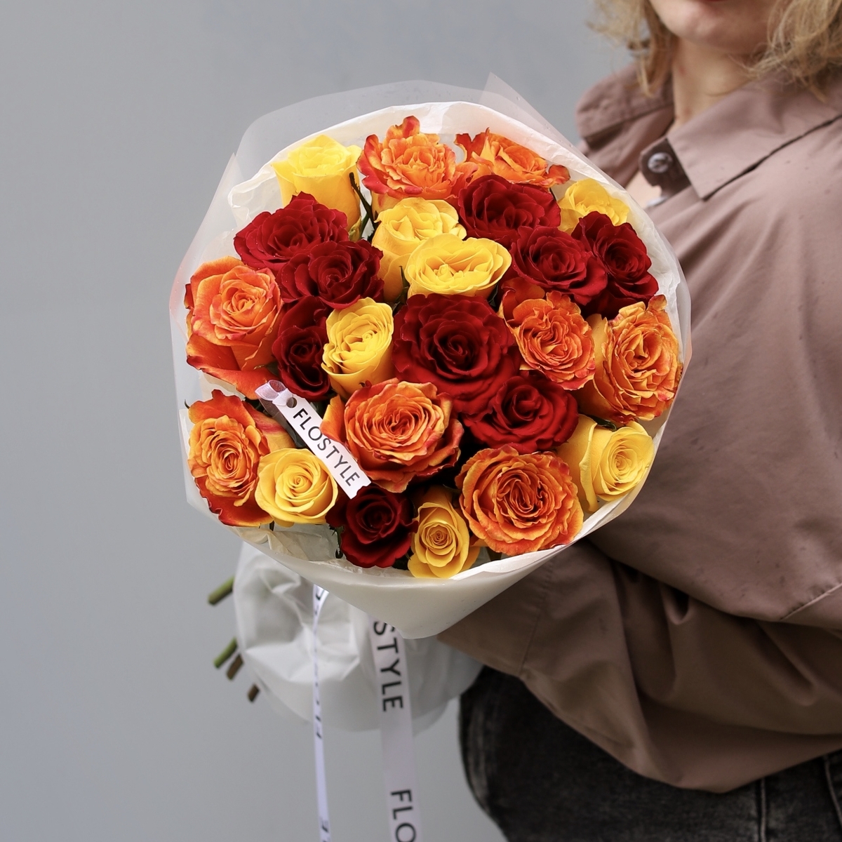 Состав: Роза Кения Mix (Red, Yellow, Orange ) - 25 шт, Тишью белая, Матовая пленка белая кругом