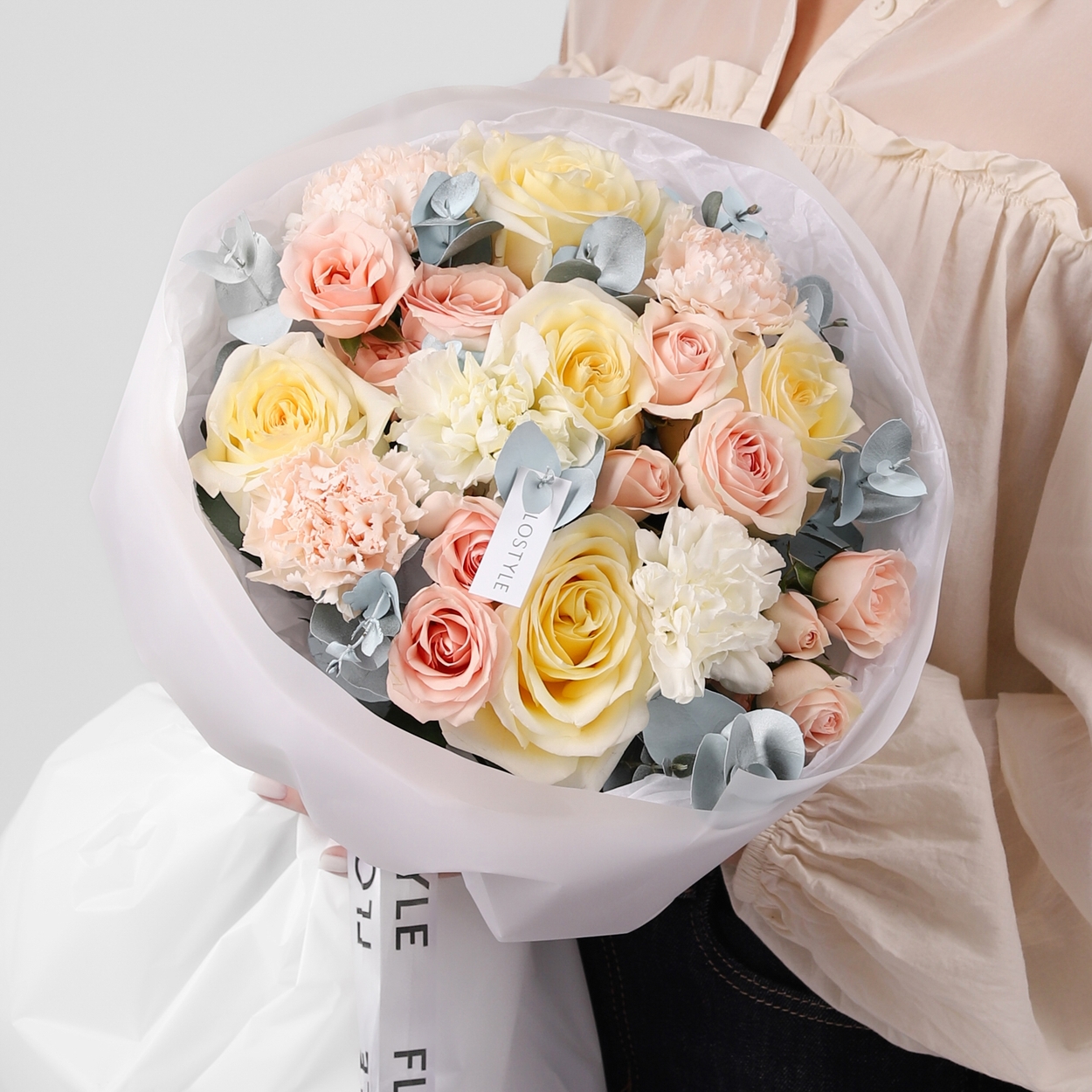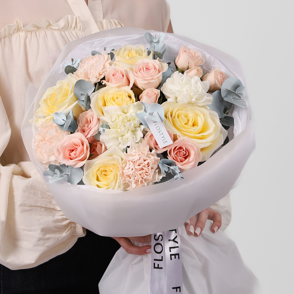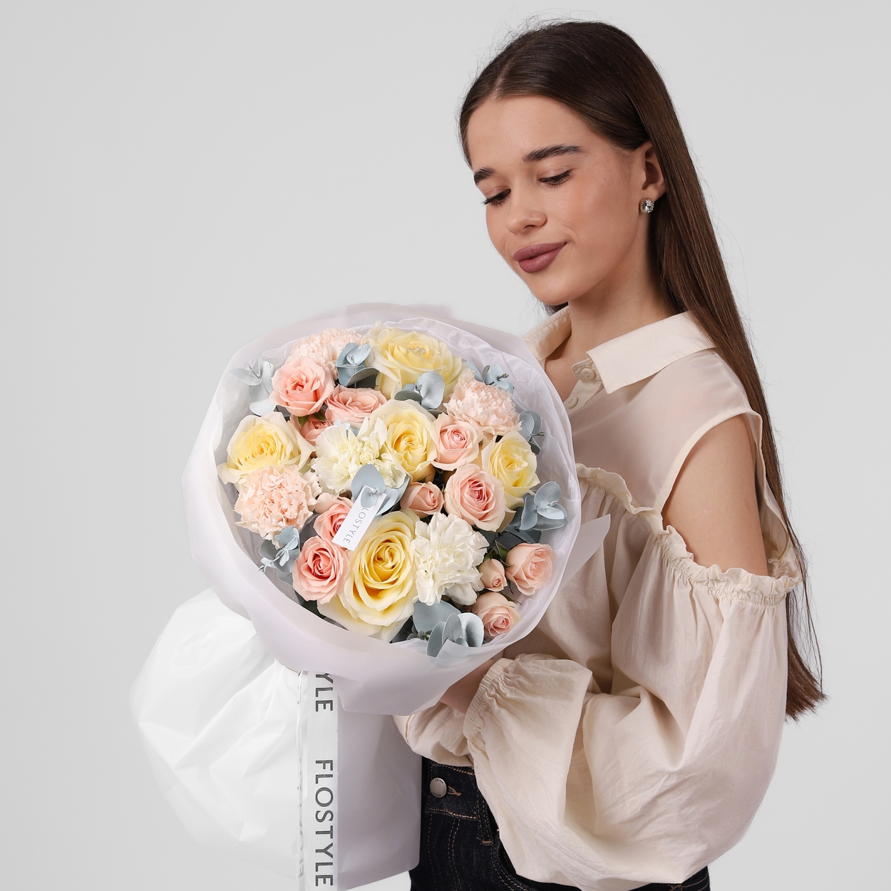 Состав: Роза Candlelight - 5 шт, Роза кустовая Star Blush - 4 шт, Диантус White/Brut - 5 шт, Фисташка - 2 шт, Эвкалипт крашенный - 1 шт, Тишью белая, Матовая пленка белая кругом