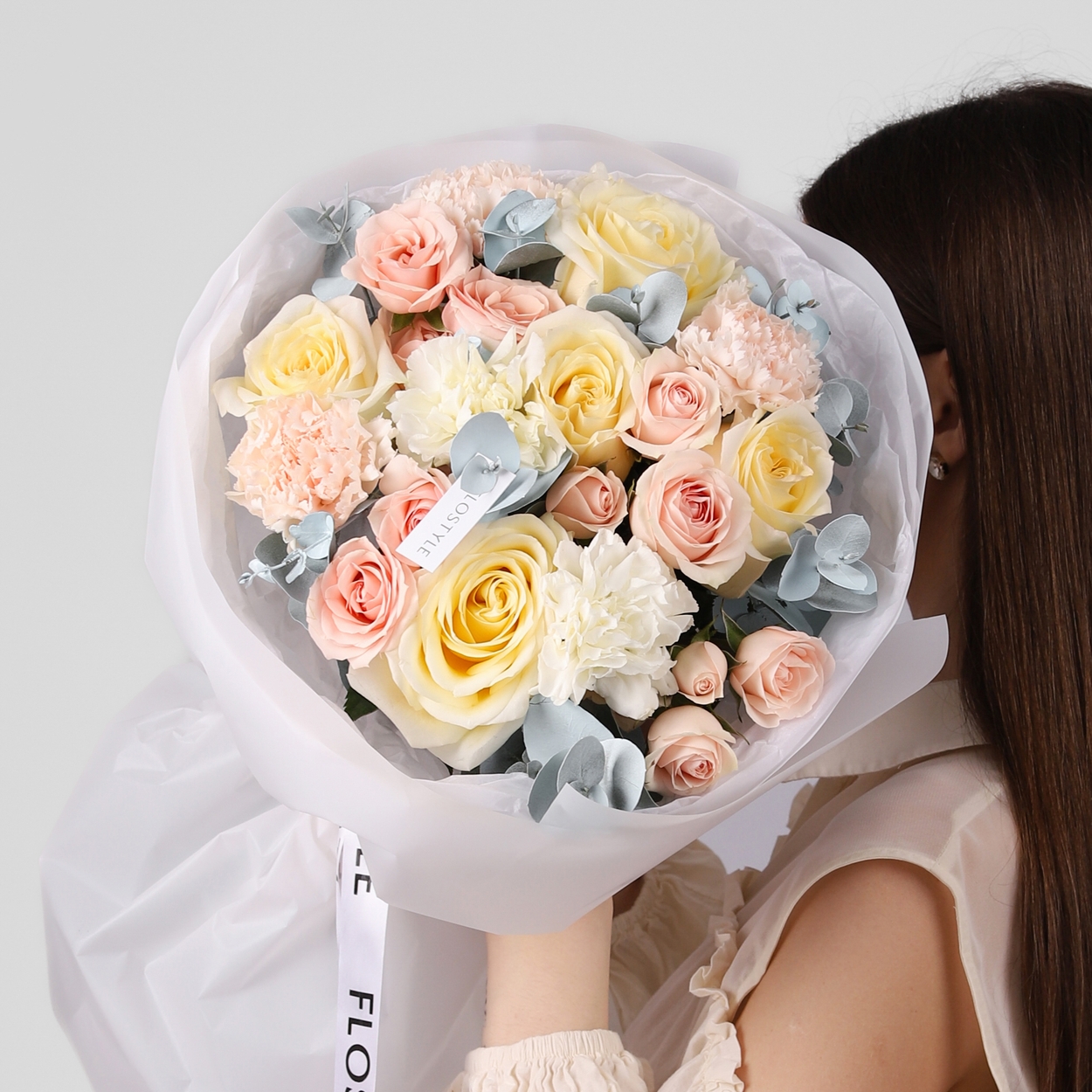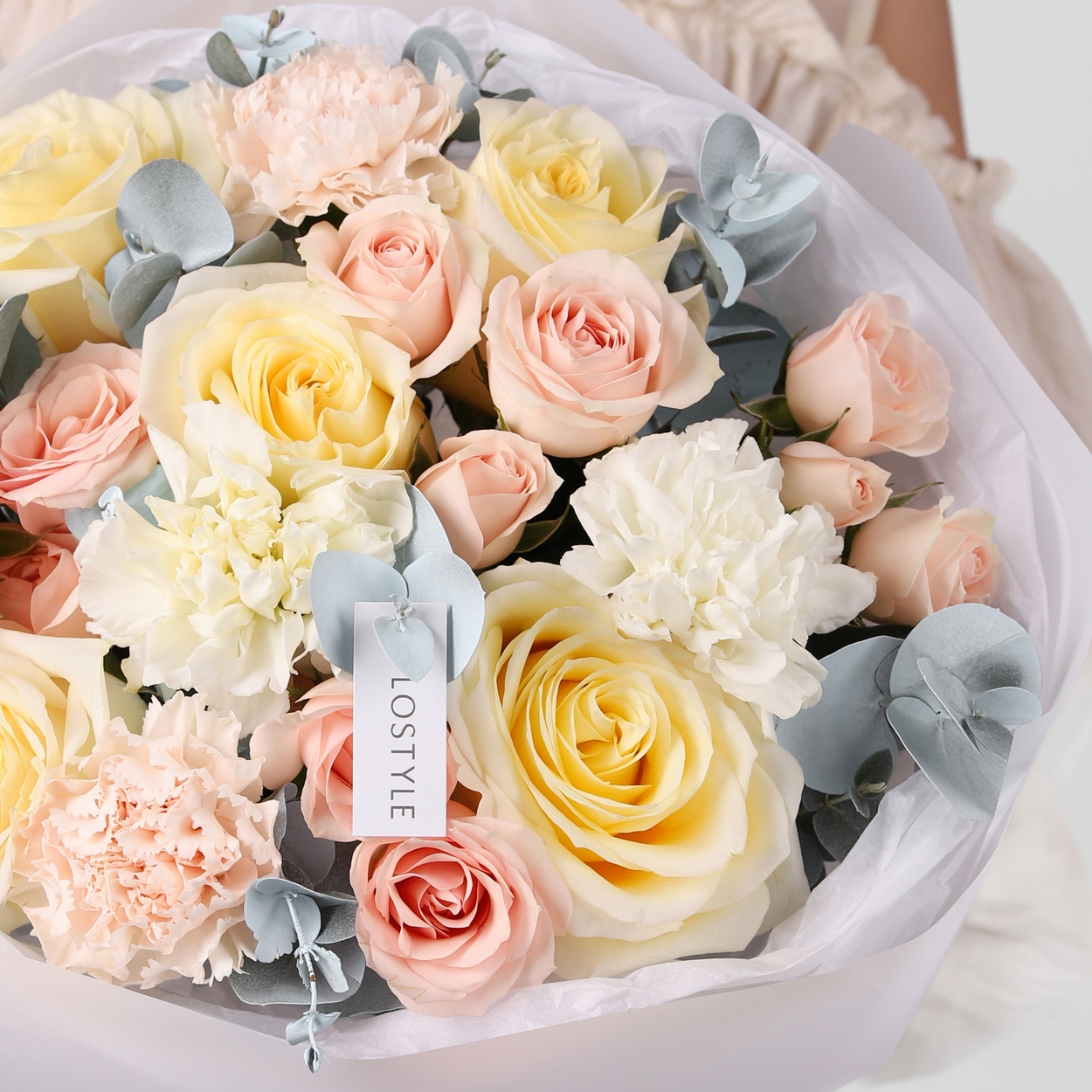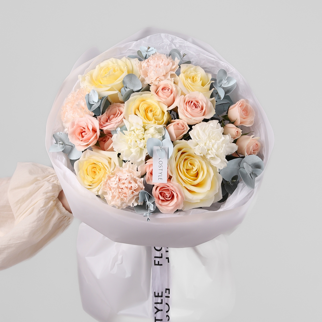 Состав: Роза Candlelight - 5 шт, Роза кустовая Star Blush - 4 шт, Диантус White/Brut - 5 шт, Фисташка - 2 шт, Эвкалипт крашенный - 1 шт, Тишью белая, Матовая пленка белая кругом
