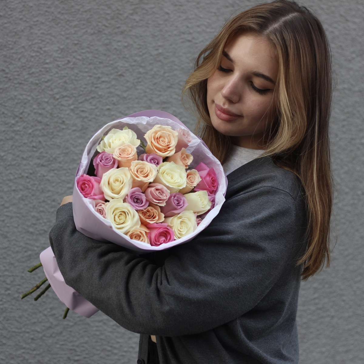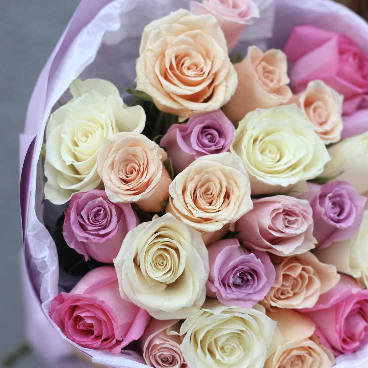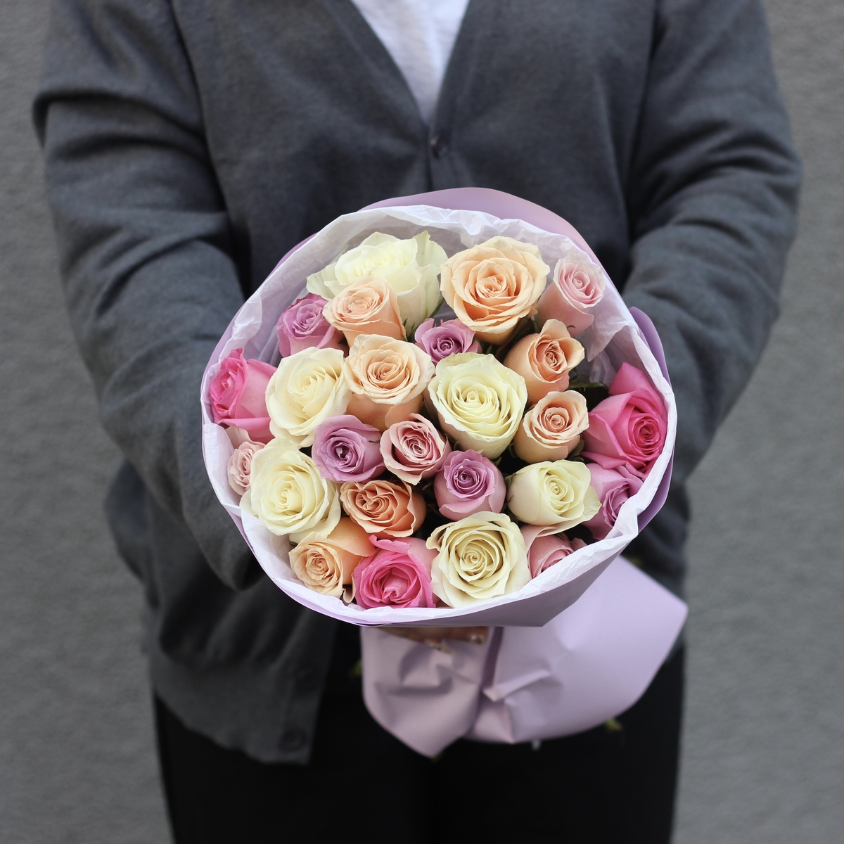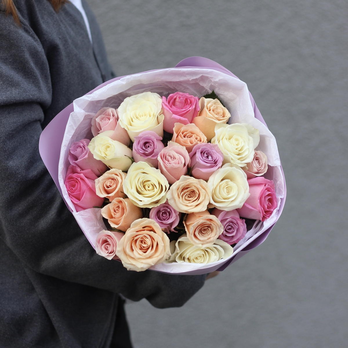 Состав: Роза Kenya микс - 25 шт, Тишью белая, Матовая пленка сиреневая кругом