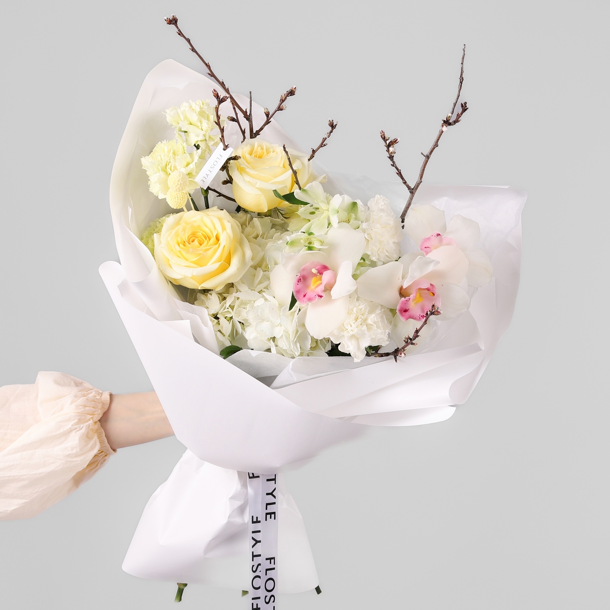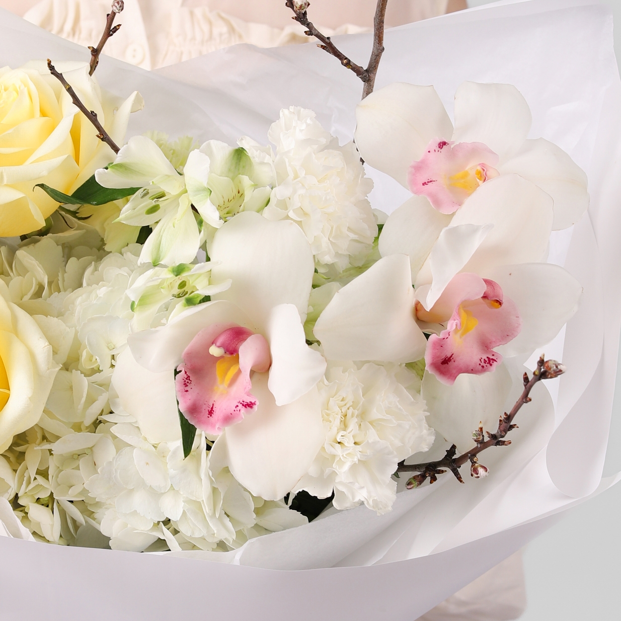 Состав: Роза Candlelight - 2 шт, Орхидея White - 3 шт, Гортензия White - 1 шт, Альстромерия - 1 шт, Диантус White/Yellow - 6 шт, Краспедия - 2 шт, Ветки цветущие - 2 шт, Фисташка - 3 шт, Тишью белая, Матовая пленка белая ушками