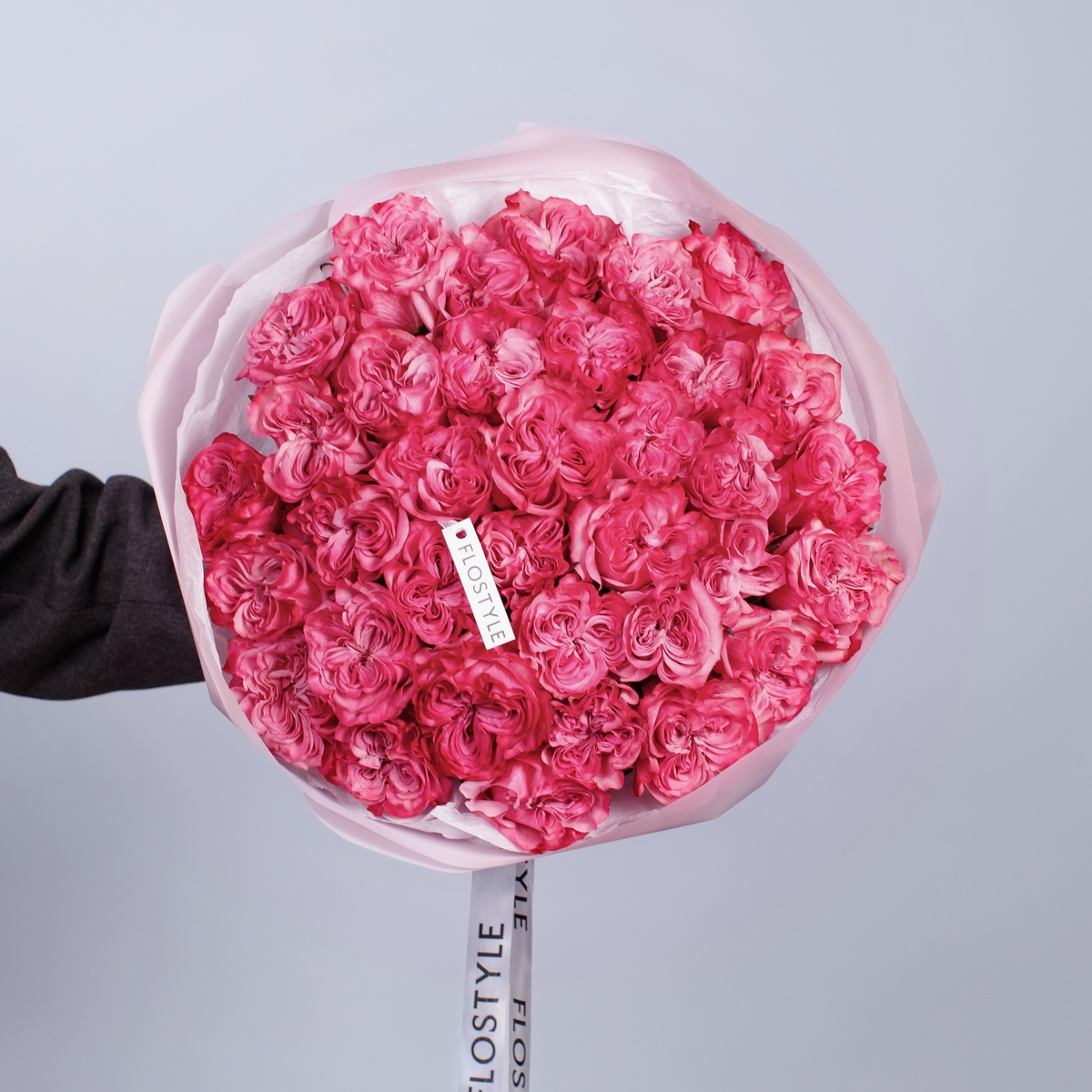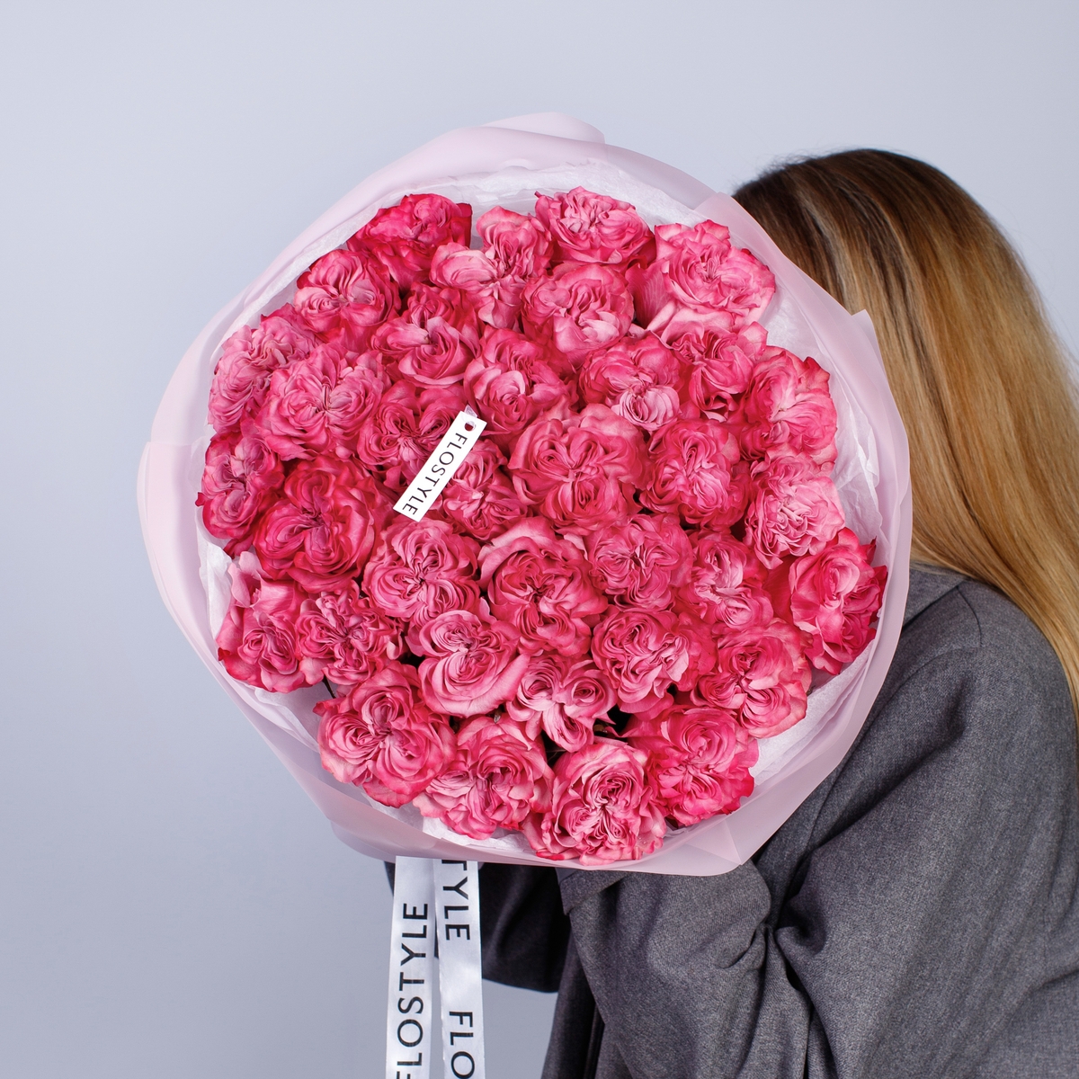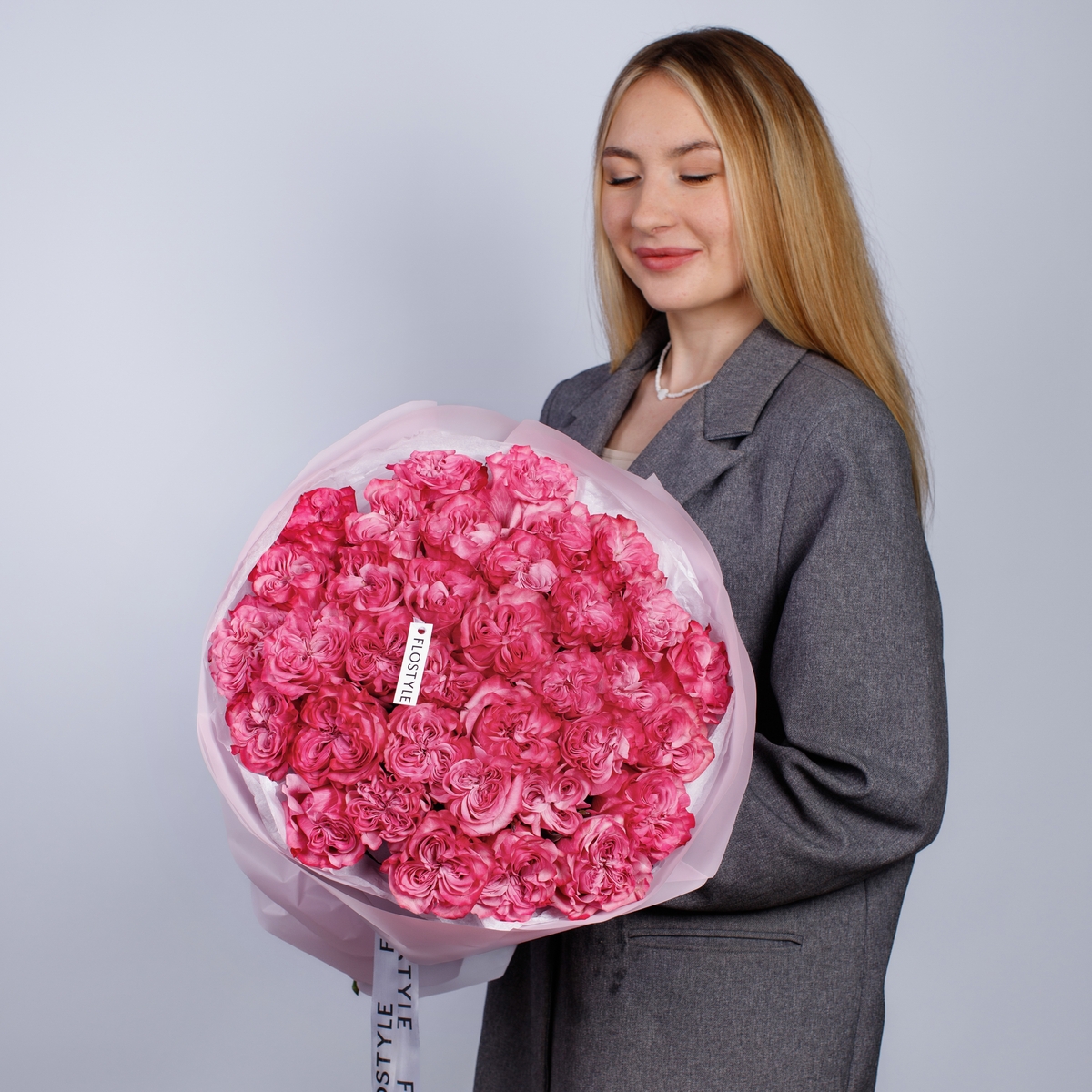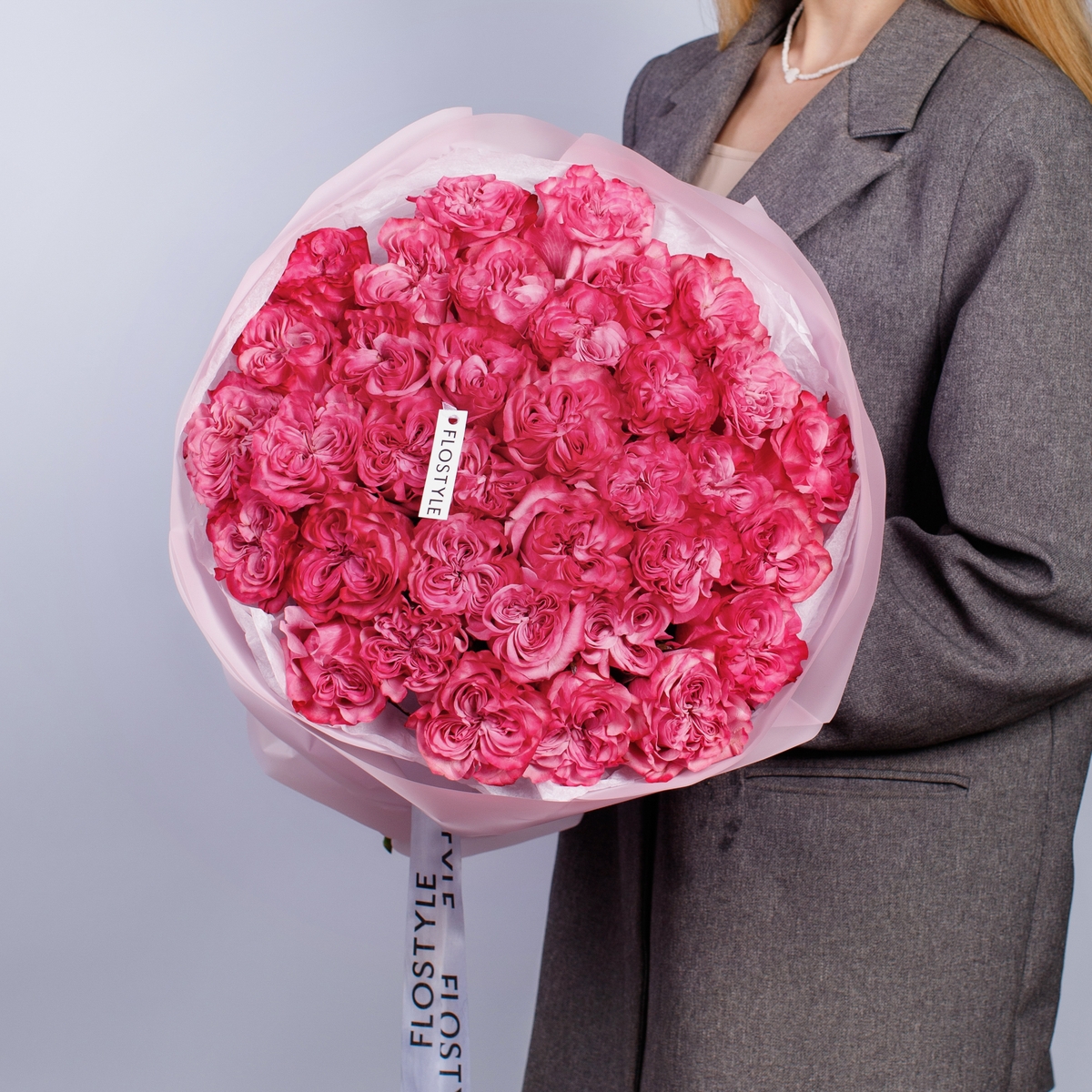 Состав: Роза Country Blues - 35 шт, Тишью белая, Матовая пленка розовая кругом
