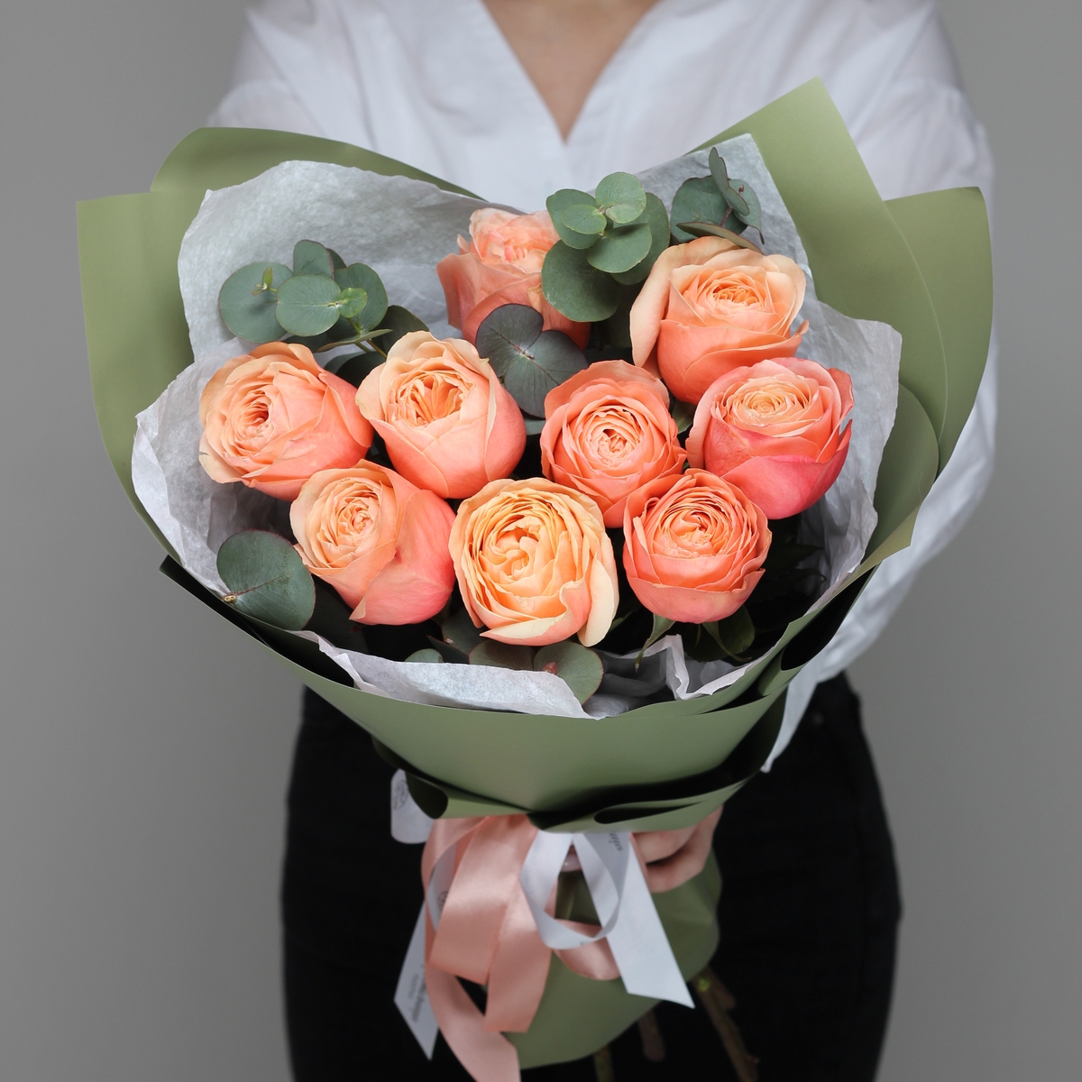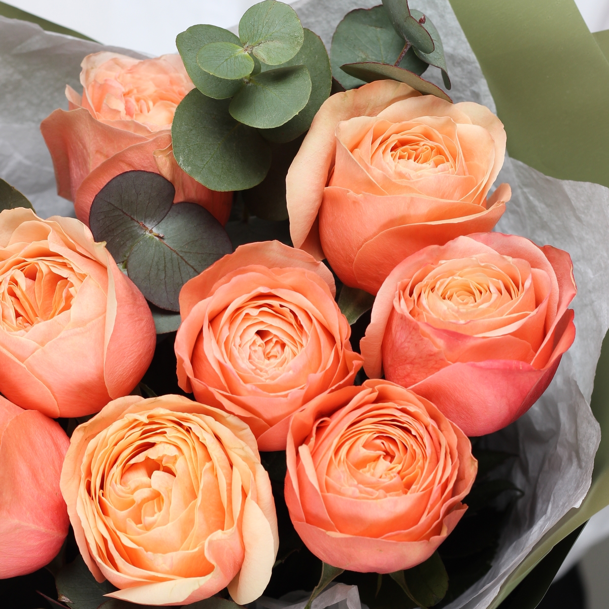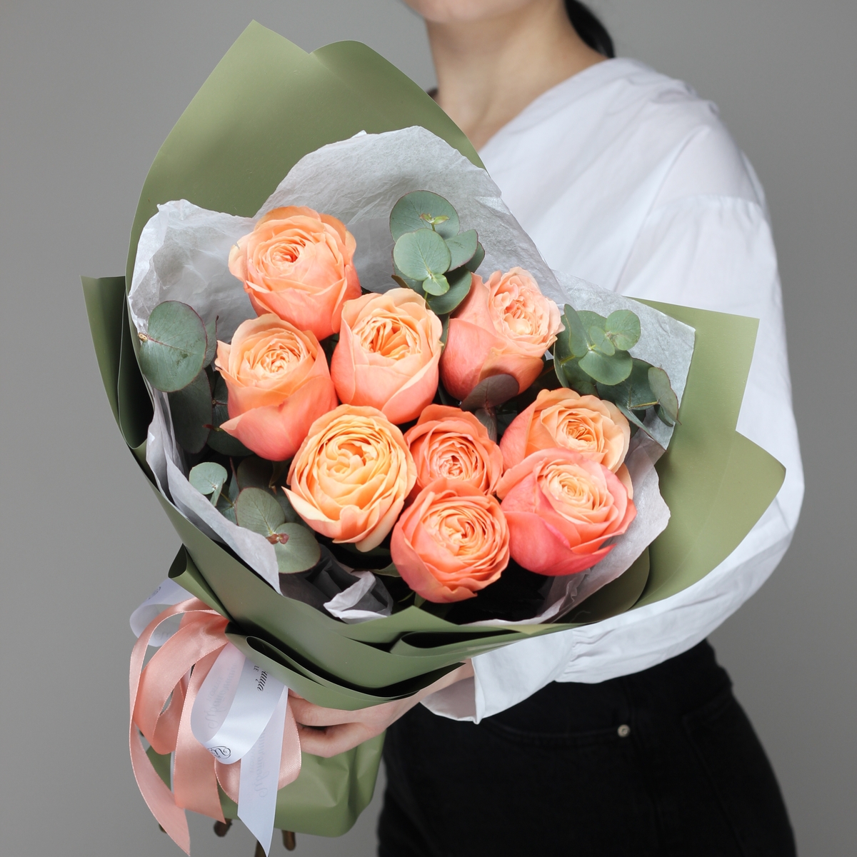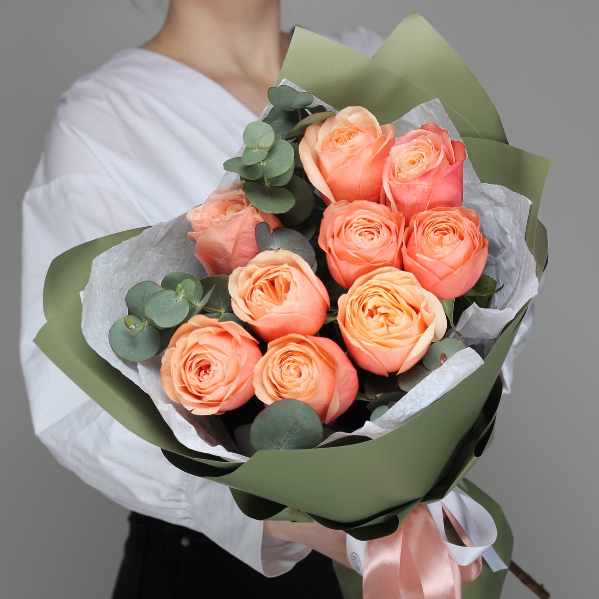 Состав: Роза Kahala - 9 шт, Эвкалипт — 0,5 шт, Тишью белая, Матовая пленка хаки ушками