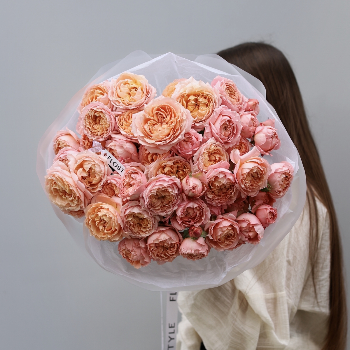 Состав: Роза кустовая Juliet - 11 шт, Фисташка - 2 шт, Тишью белая, Матовая пленка белая кругом