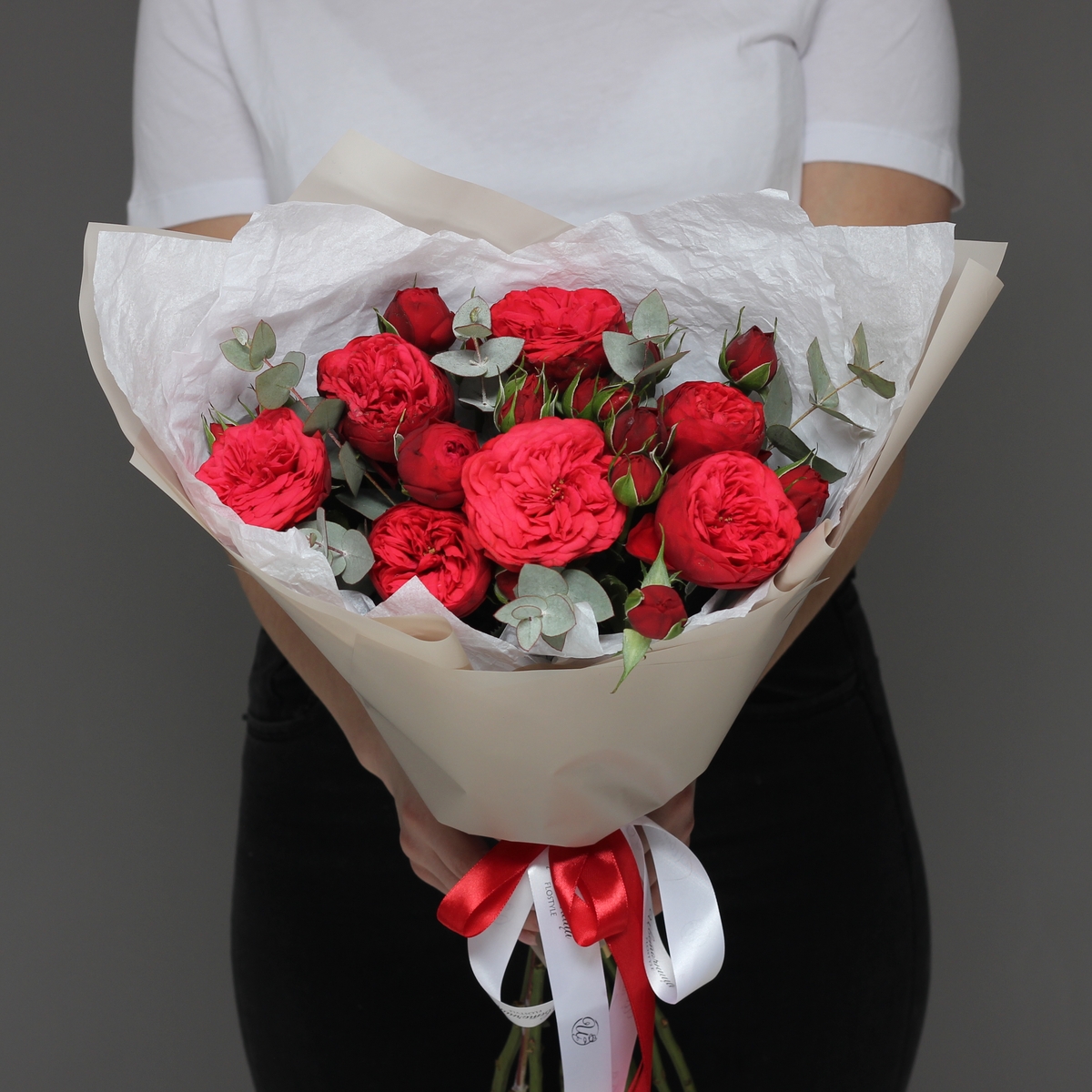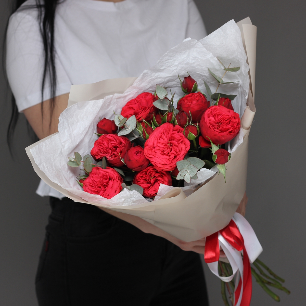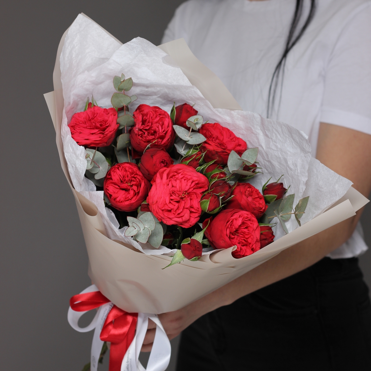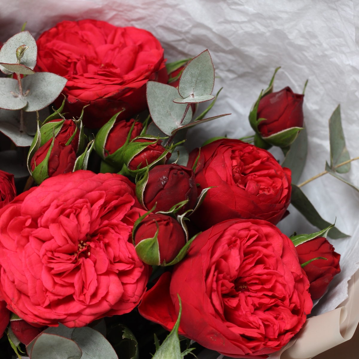 Состав: Роза кустовая Red Piano - 7 шт, Эвкалипт - 0,5 шт, Тишью белое, Матовая пленка бежевая ушками