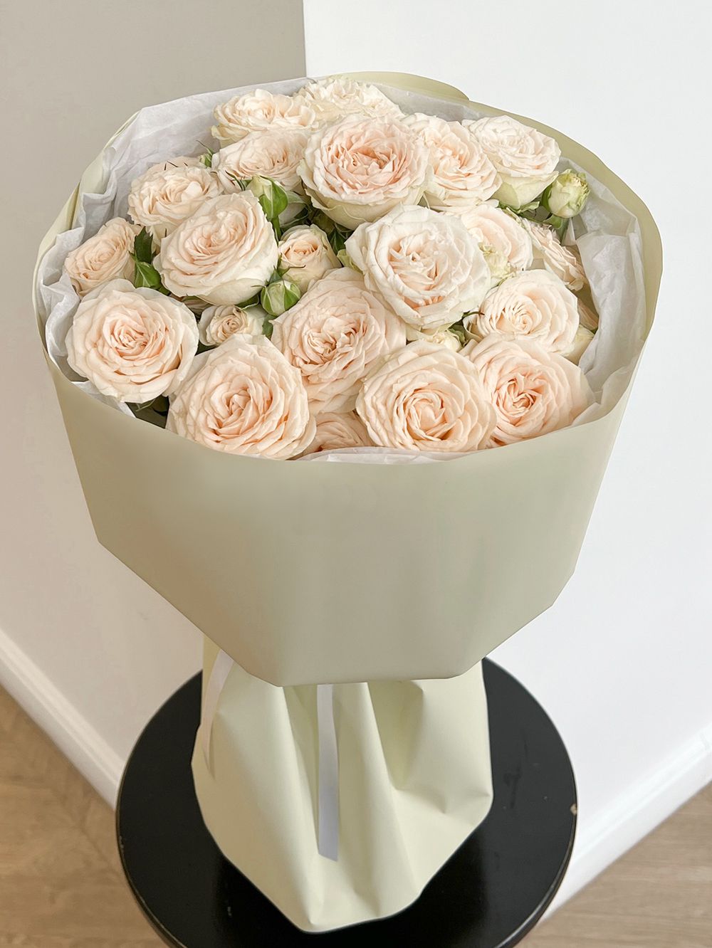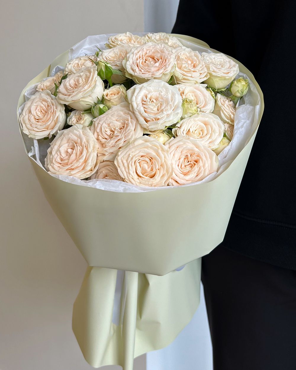 Состав: Роза кустовая Bombastic - 7 шт, Фисташка - 2 шт, Тишью белое, Матовая пленка хаки кругом