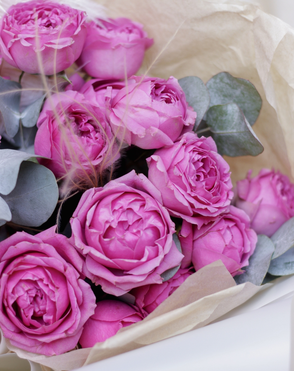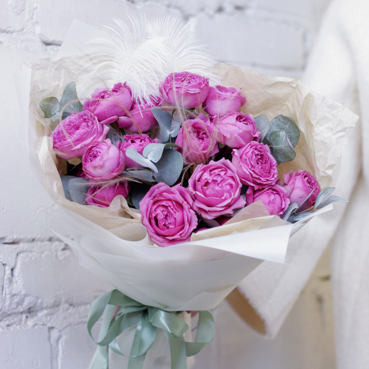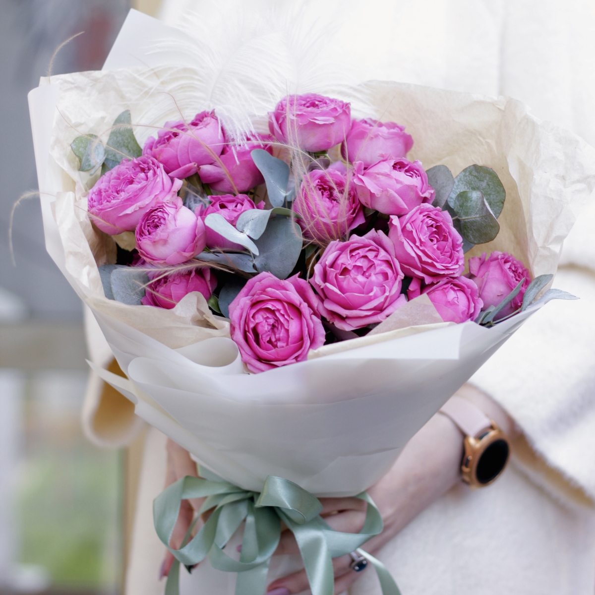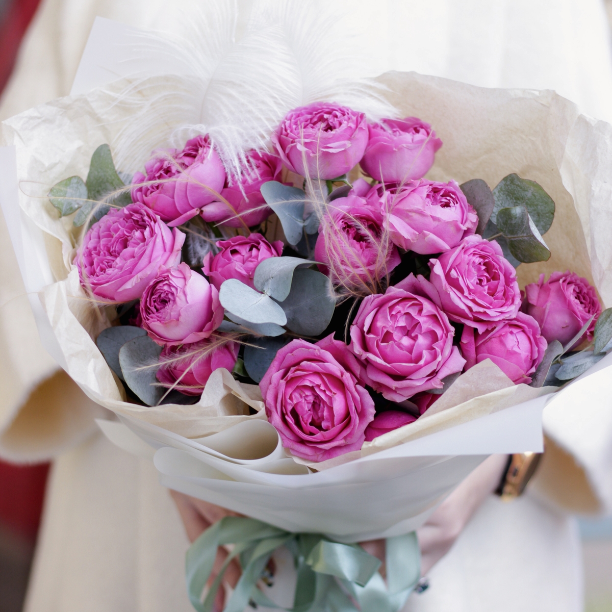 Состав: Роза кустовая Misty Bubbles/Clas sensation — 7 шт, Перо — 2 шт, Стифа — 3 шт, Эвкалипт — 0,5 шт, Тишью белое, Матовая пленка белая прозрачная углами