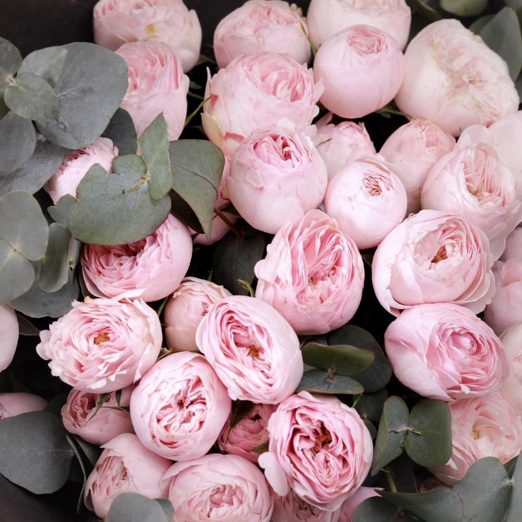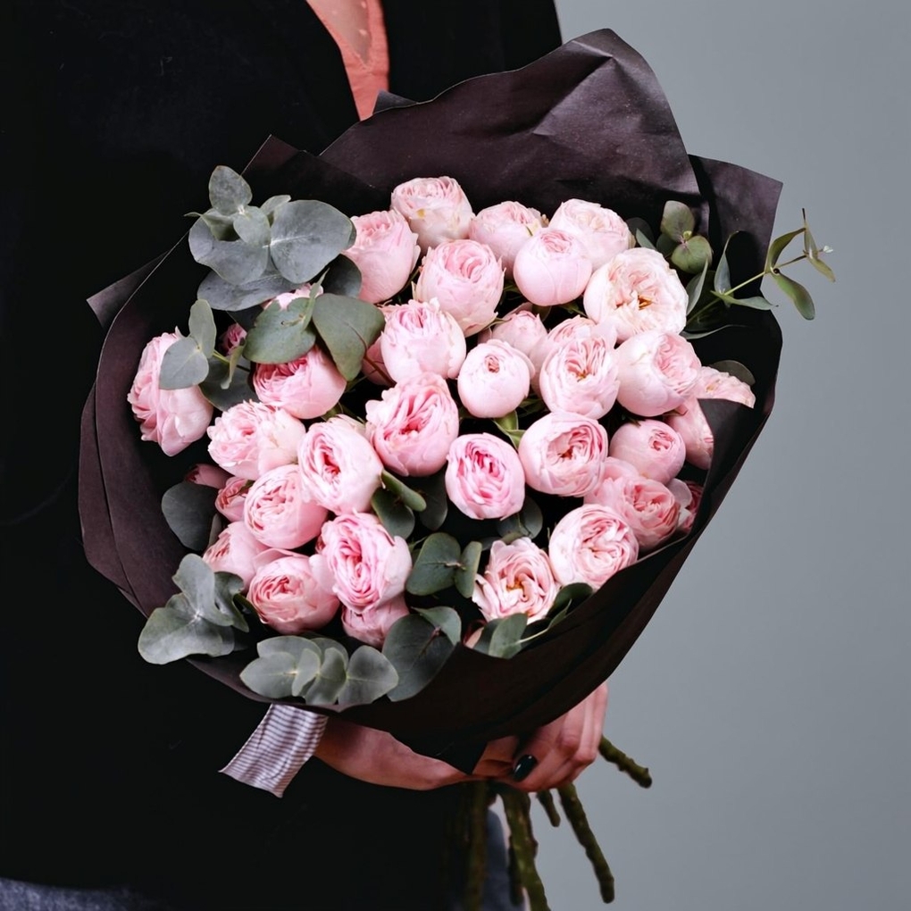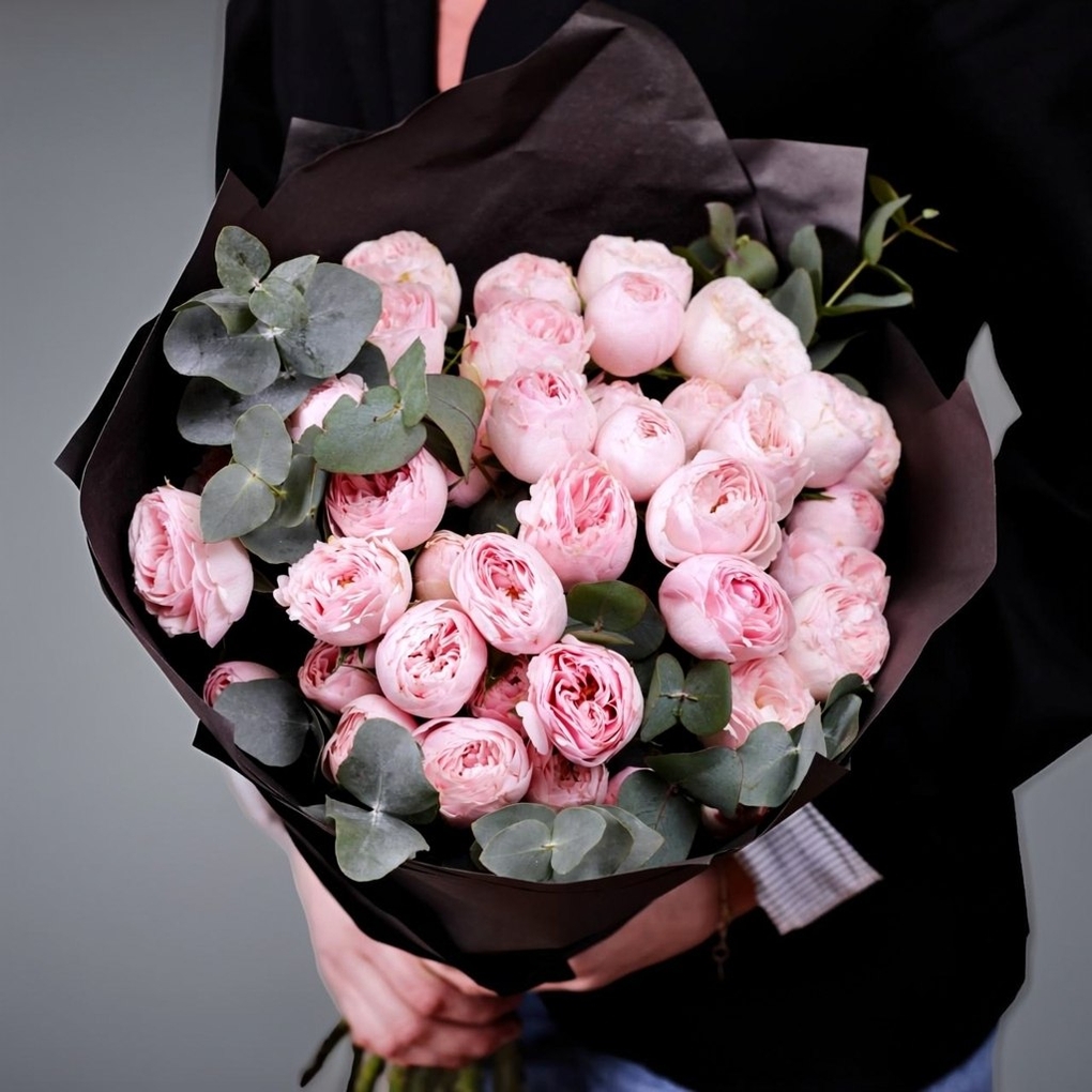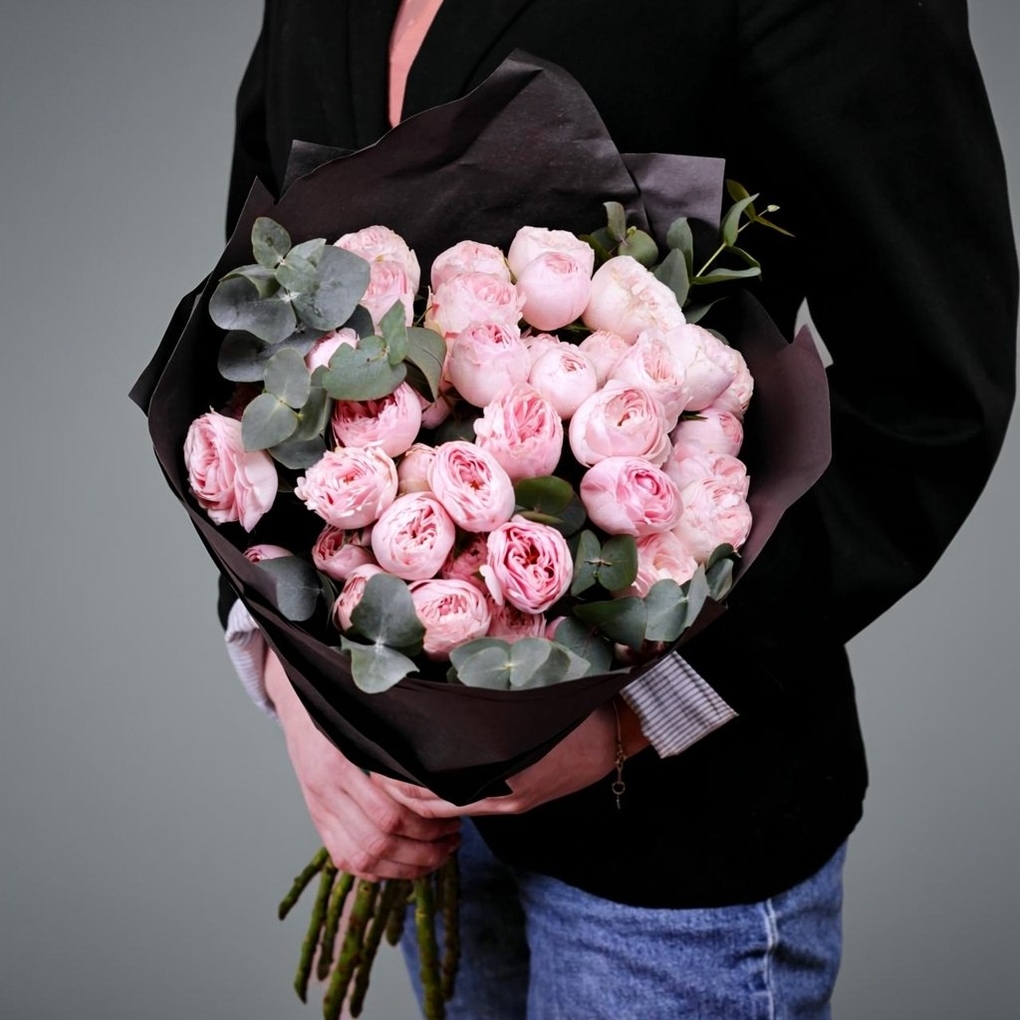 Состав: Роза кустовая Mansfield Park— 11 шт, Эвкалипт — 1 шт, Матовая пленка черная углами