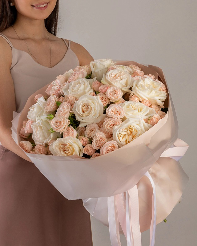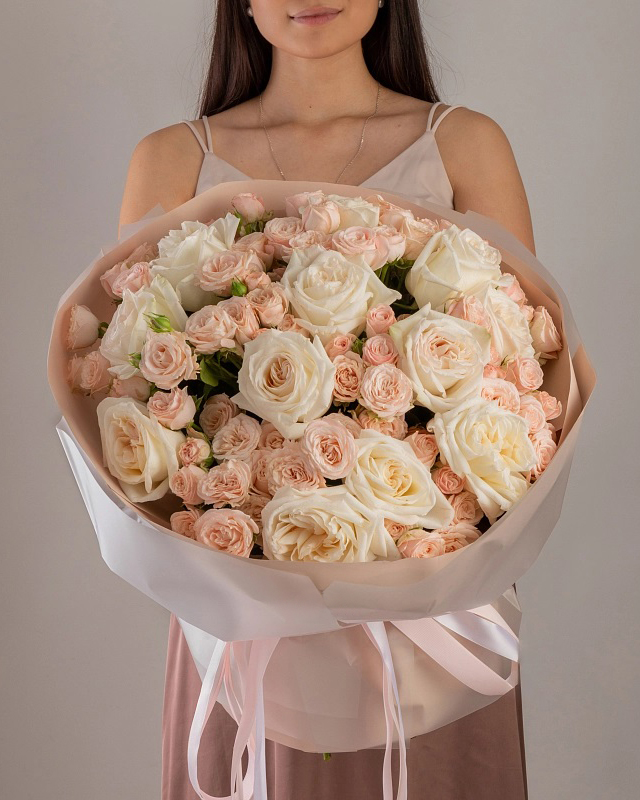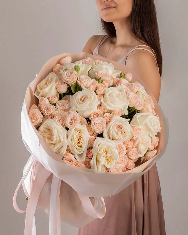 Состав: Роза White O'Hara - 11 шт, Роза кустовая Bombastic - 10 шт, Фисташка - 2 шт, Тишью бежевая, Матовая пленка белая кругом