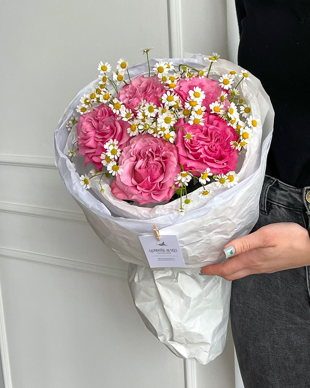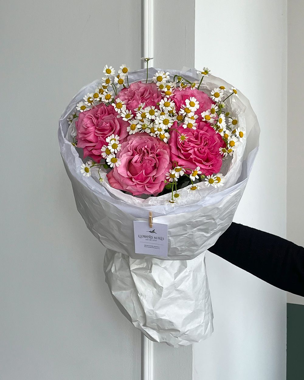 Состав: Роза Country Blues - 5 шт, Ромашка танацетум - 4 шт, Фисташка - 1 шт, Тишью белая, Матовая пленка белая кругом