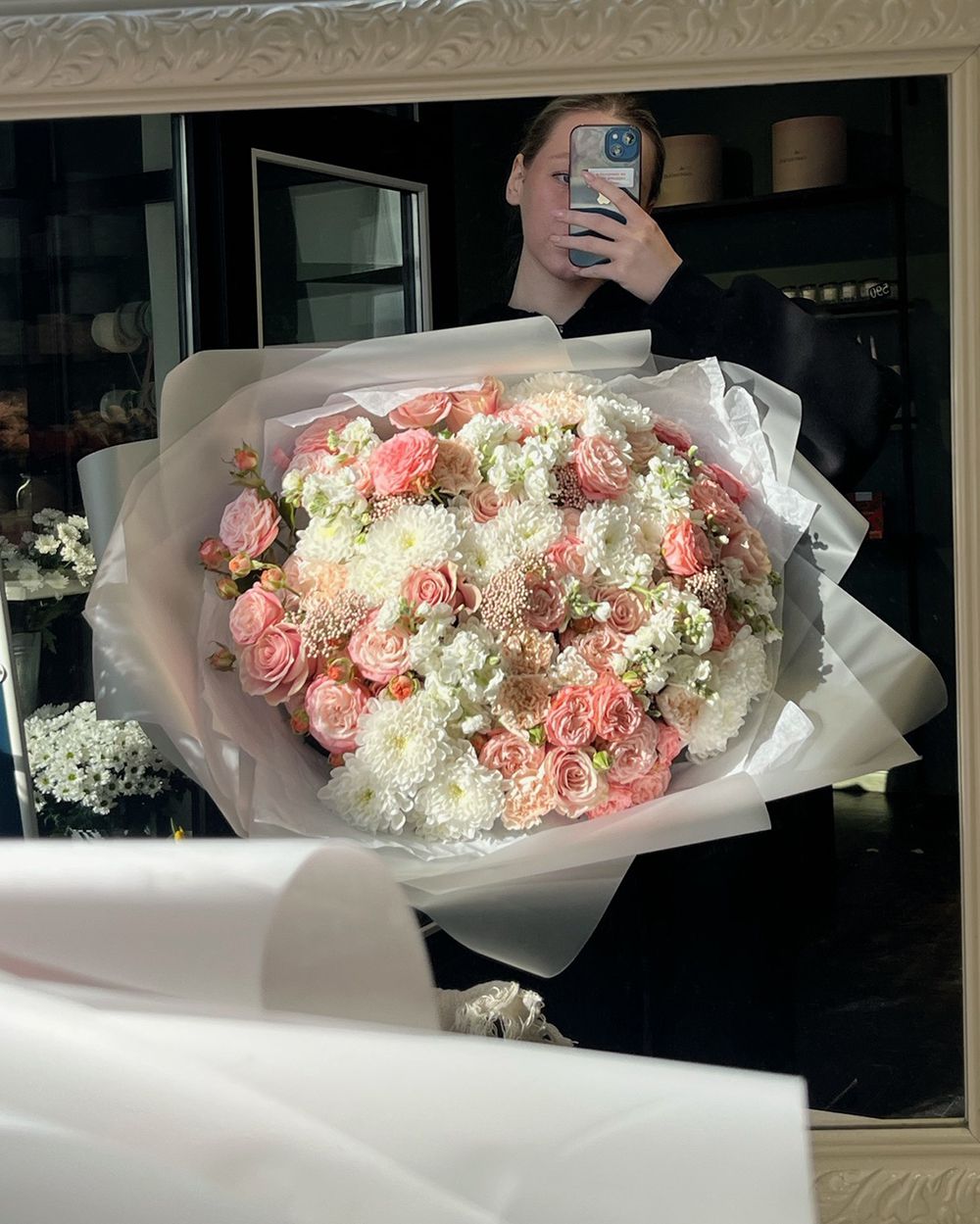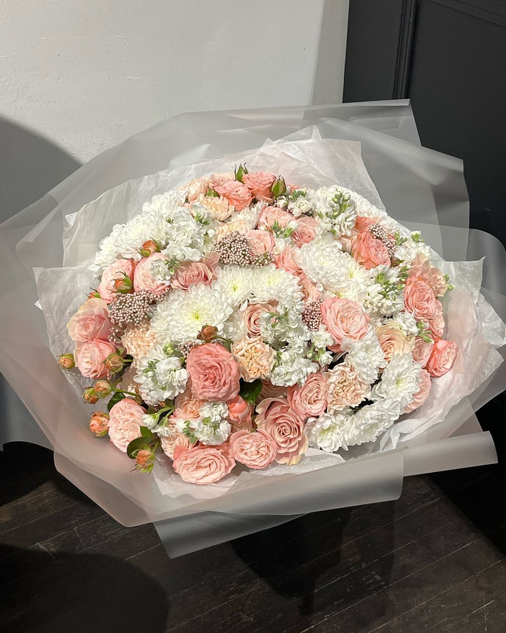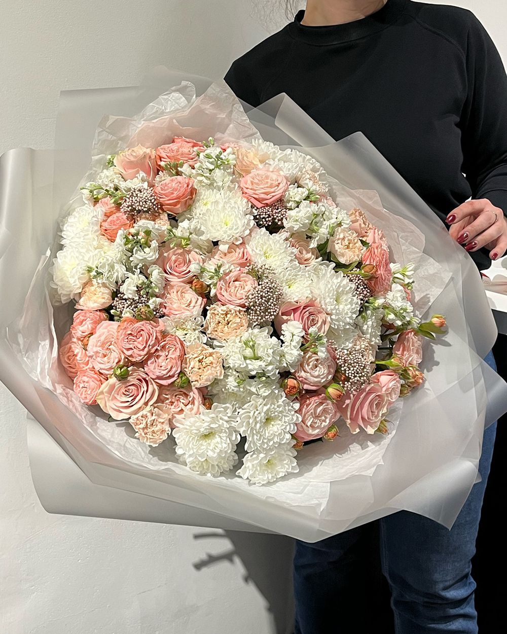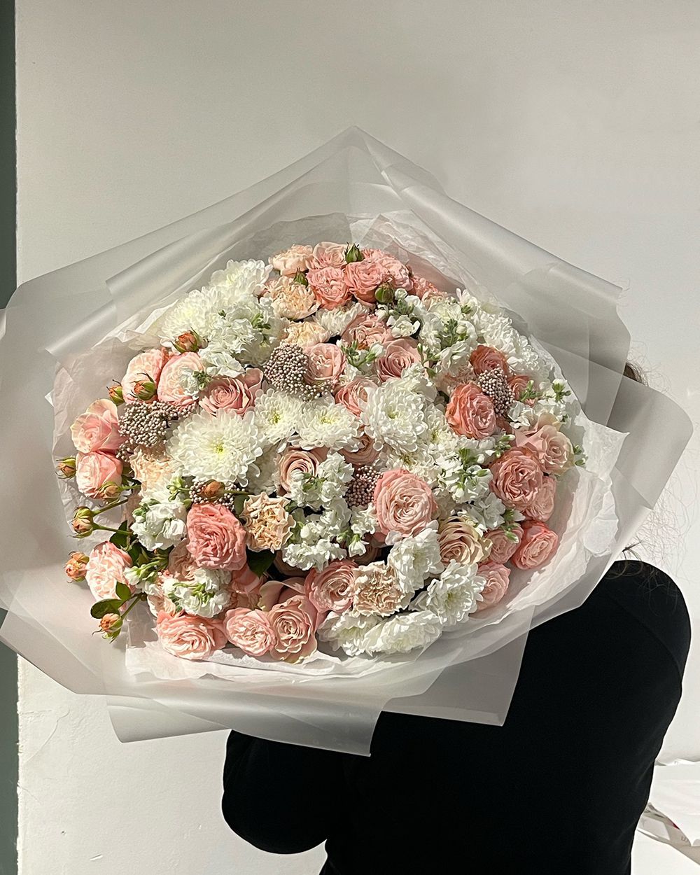 Состав: Роза кустовая Madam Bombastic - 9 шт, Хризантема Altaj - 7 шт, Маттиола кустовая White - 7 шт, Диантус Brut - 8 шт, Озотамнус - 6 шт, Тишью белая, Матовая пленка белая углами