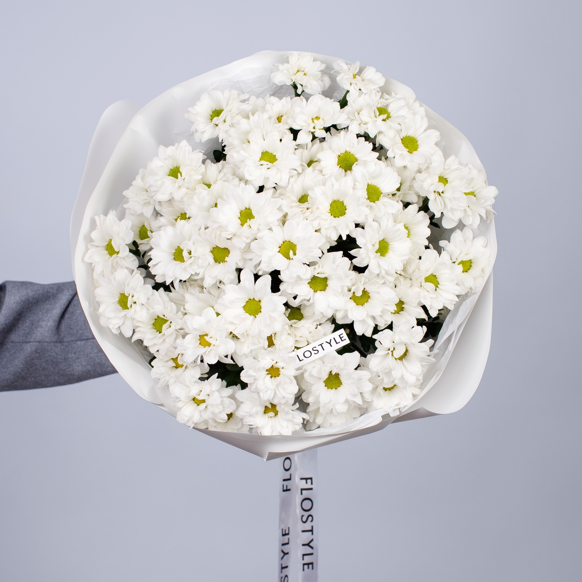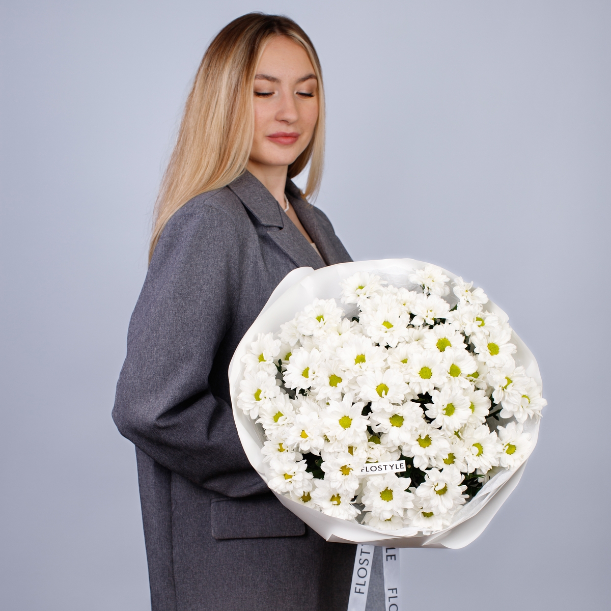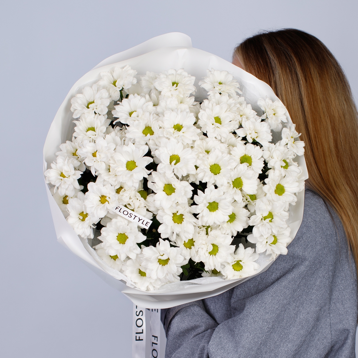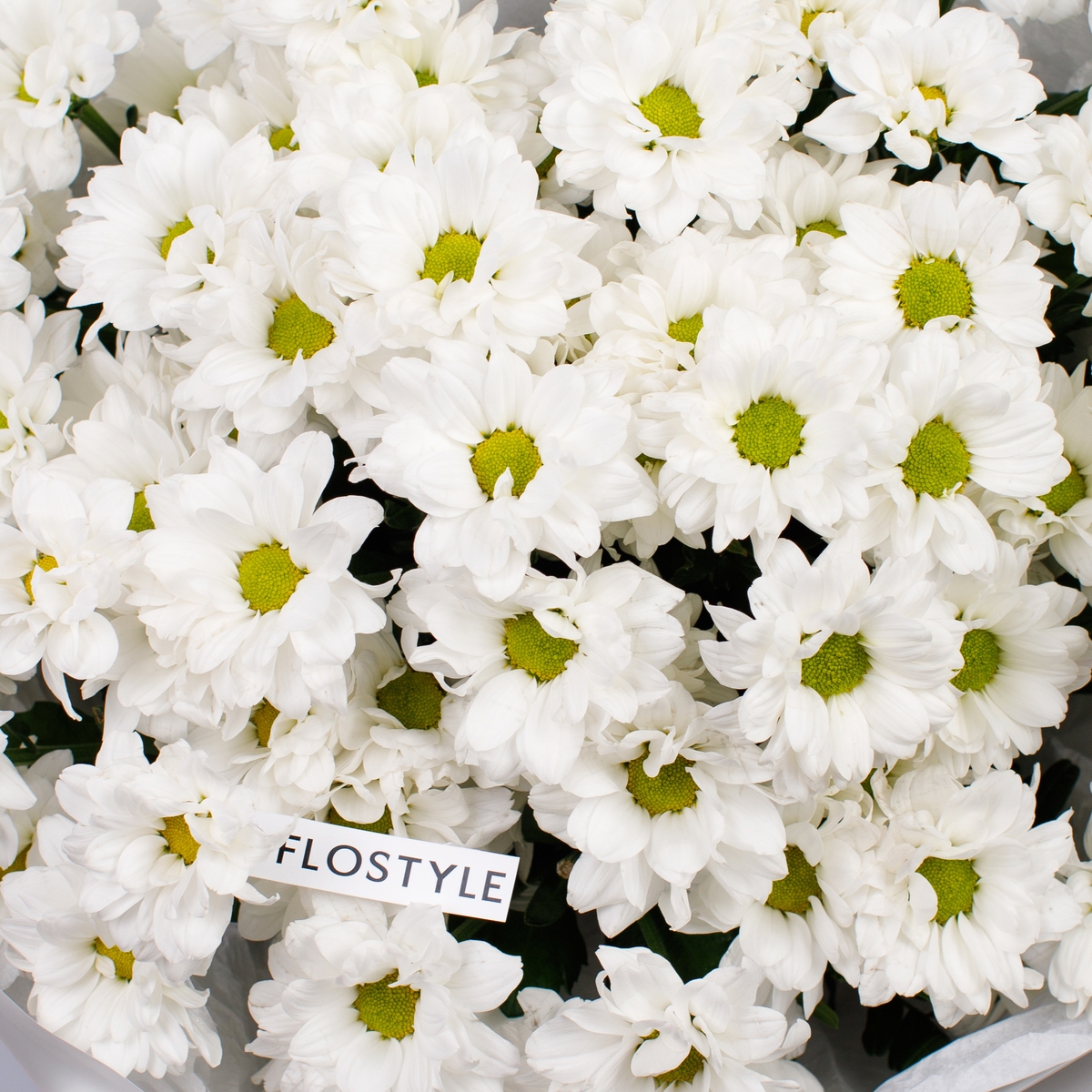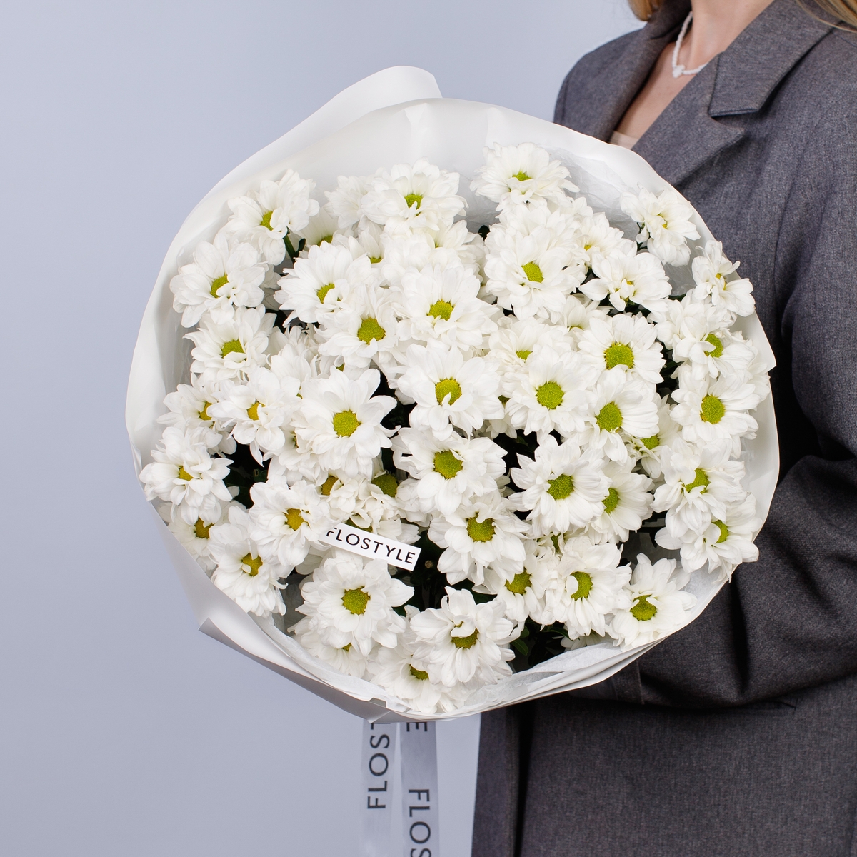 Состав: Хризантема Bacardi - 11 шт, Фисташка - 2 шт, Тишью белая, Матовая пленка белая кругом