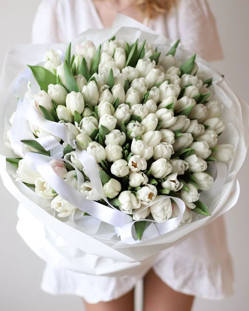 Состав: Тюльпан белый - 101 шт, Белая тишью, Матовая пленка белая кругом