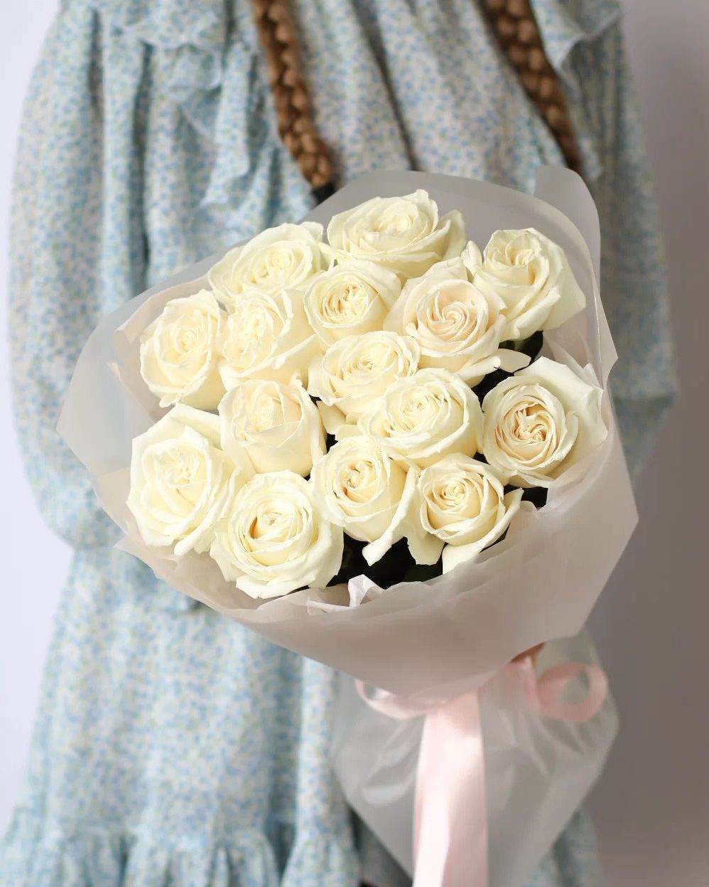 Состав: Роза Playa Blanca - 15 шт, Белая тишью, Матовая пленка прозрачная кругом